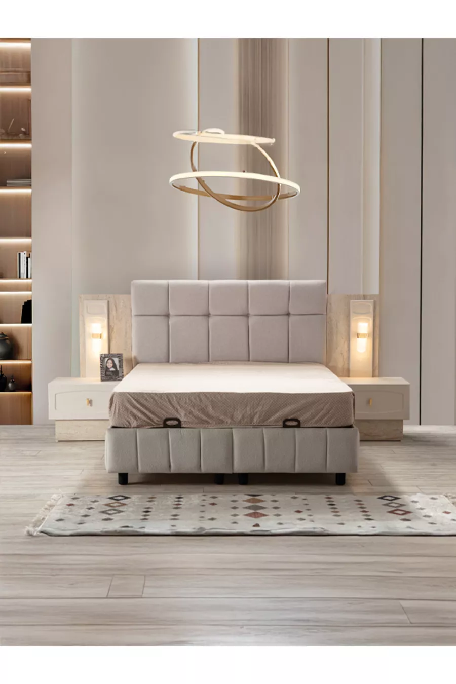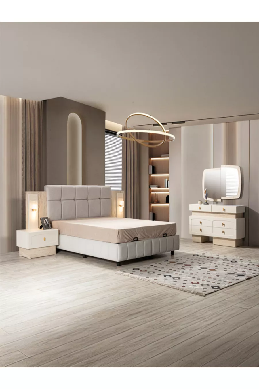 محتويات الطقم: سرير + 2 من الطاولات الجانبية + تسريحة + مرتبة + خزانة