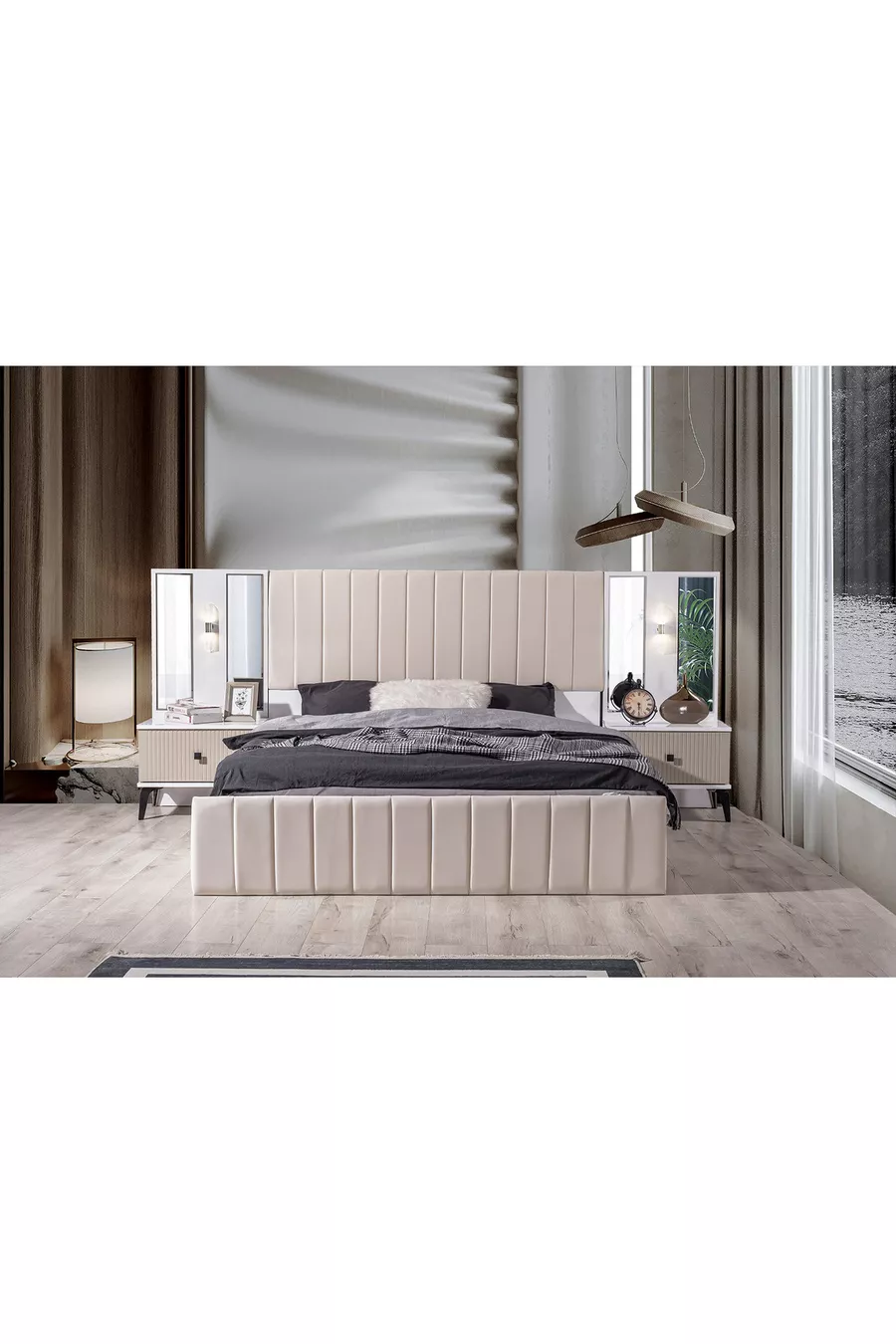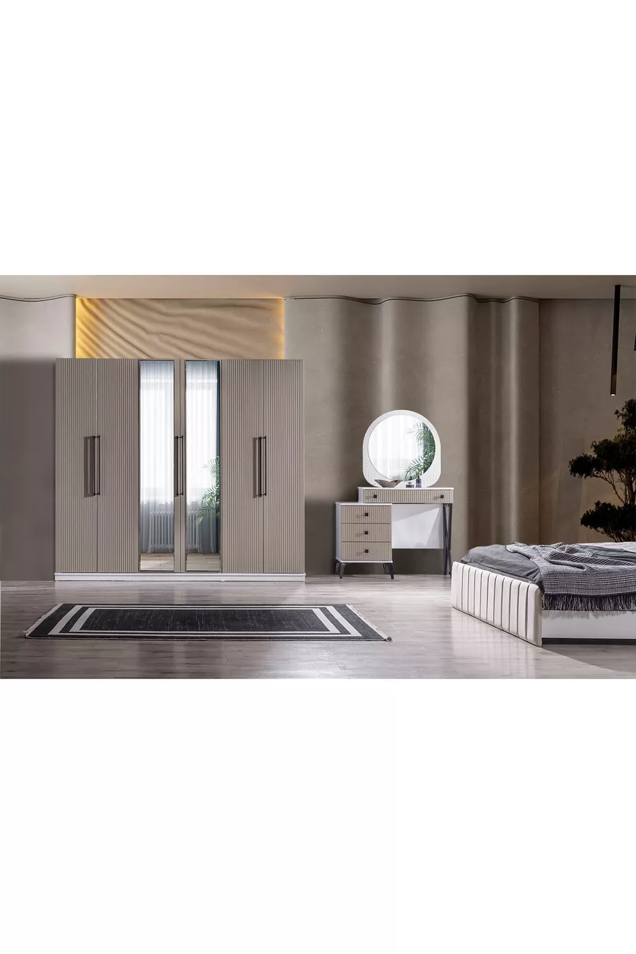 اللون: بيج مدة الضمان: سنتان مقاس السرير/القاعدة: 160 × 200 وظيفة السرير: بدون قاعدة وظيفة الخزانة: مع مرآة مادة جسم الخزانة: MDF عدد الأبواب: 6 محتوى الطقم: سرير + 2 طاولات جانبية + كومود + خزانة + مرآة الأسلوب: حديث الموضوع / النمط: حديث المنشأ: تركيا الميزة: طويل