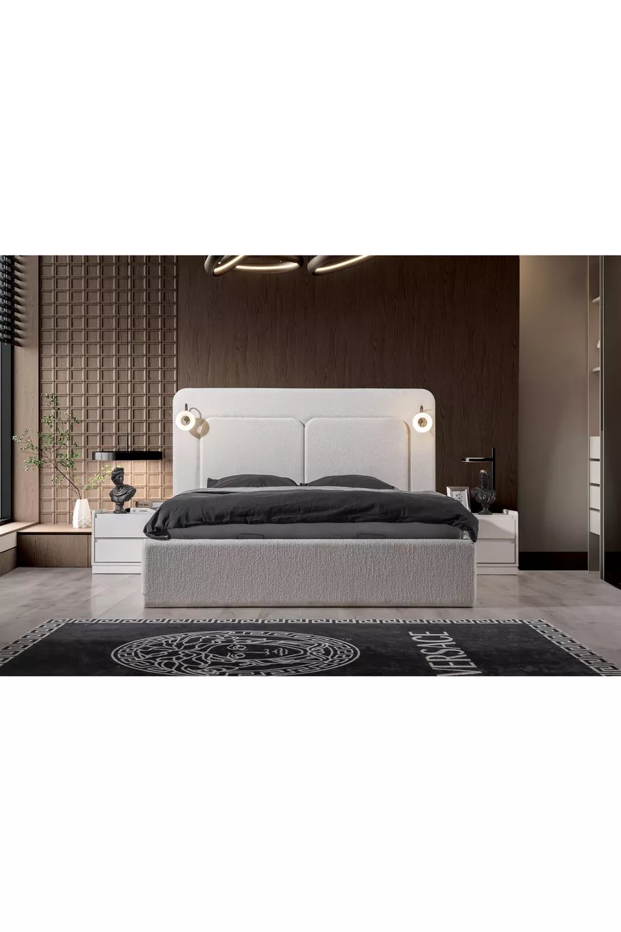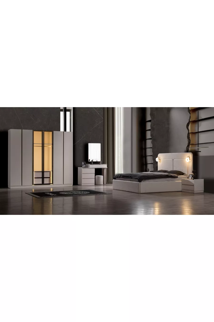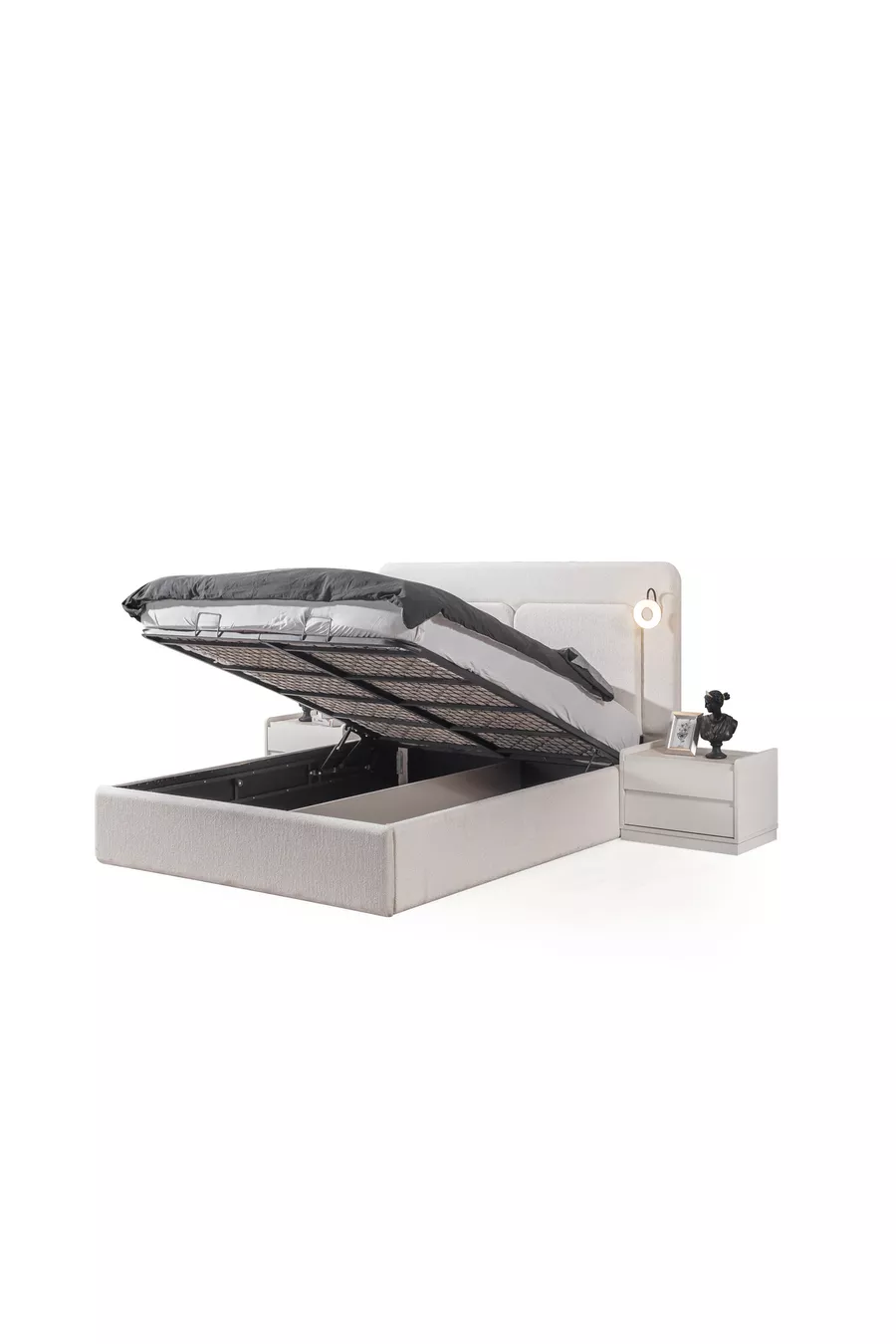 محتويات الطقم: سرير بقاعدة تخزين + 2 منضدة جانبية + كومودينو + خزانة