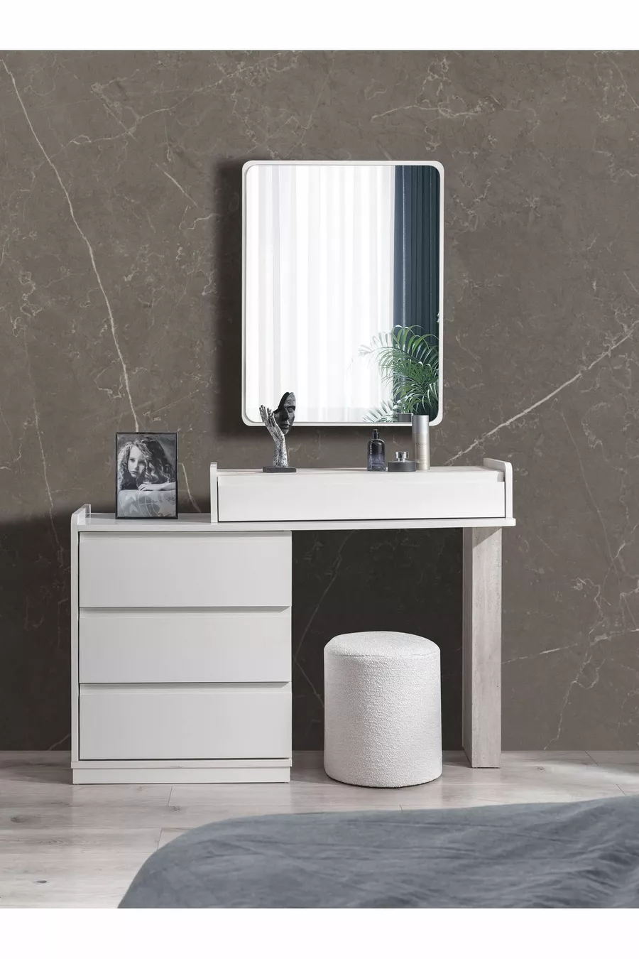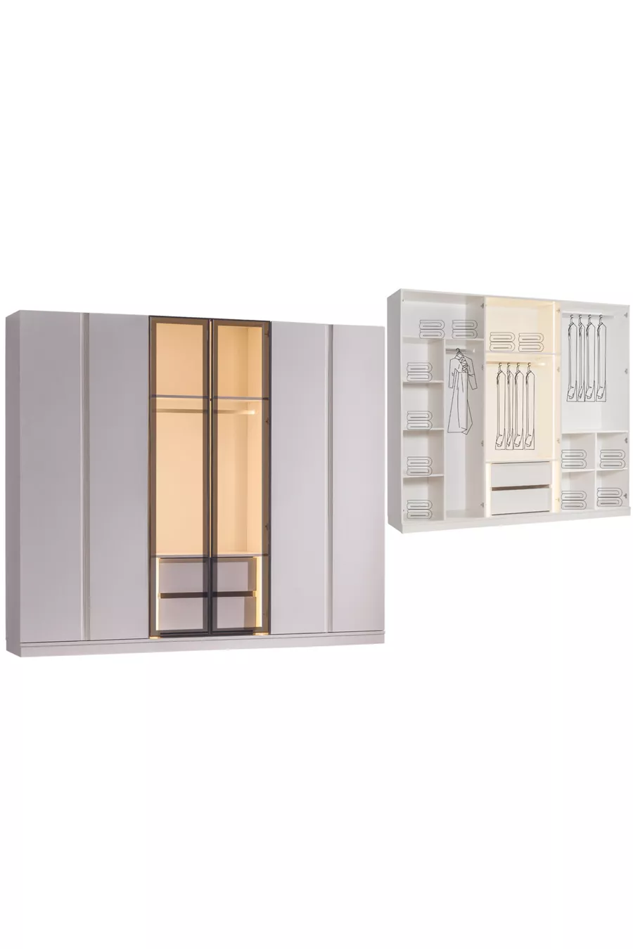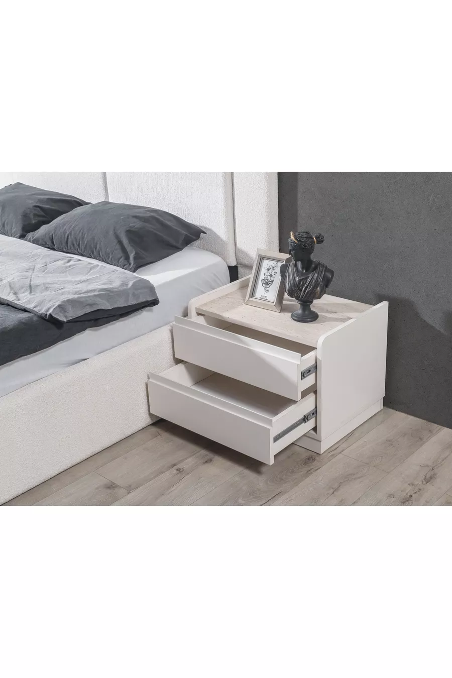 محتويات الطقم: سرير بقاعدة تخزين + 2 منضدة جانبية + كومودينو + خزانة