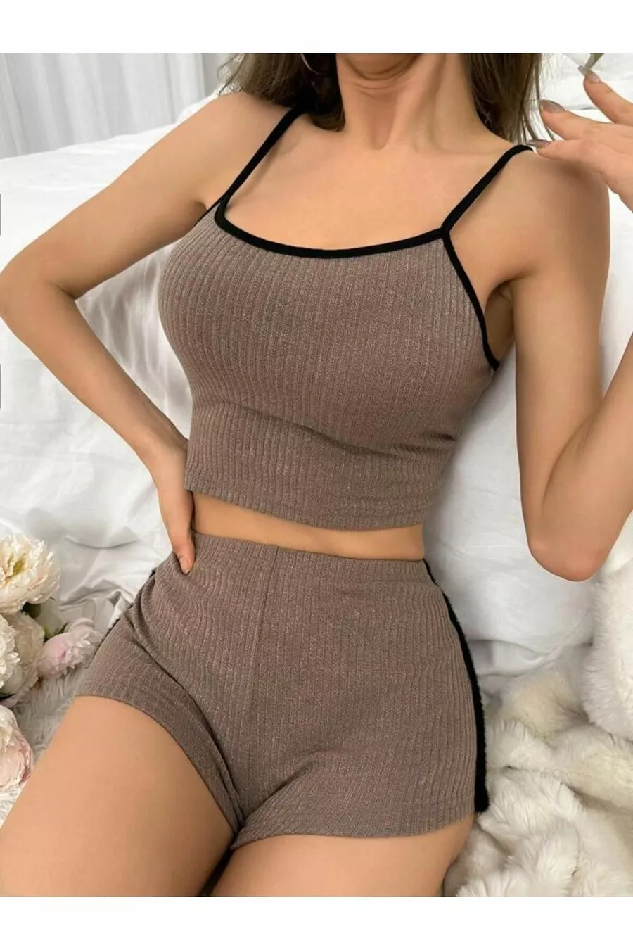 طقم نسائي بأعلى وأسفل بلون بني مع شورت