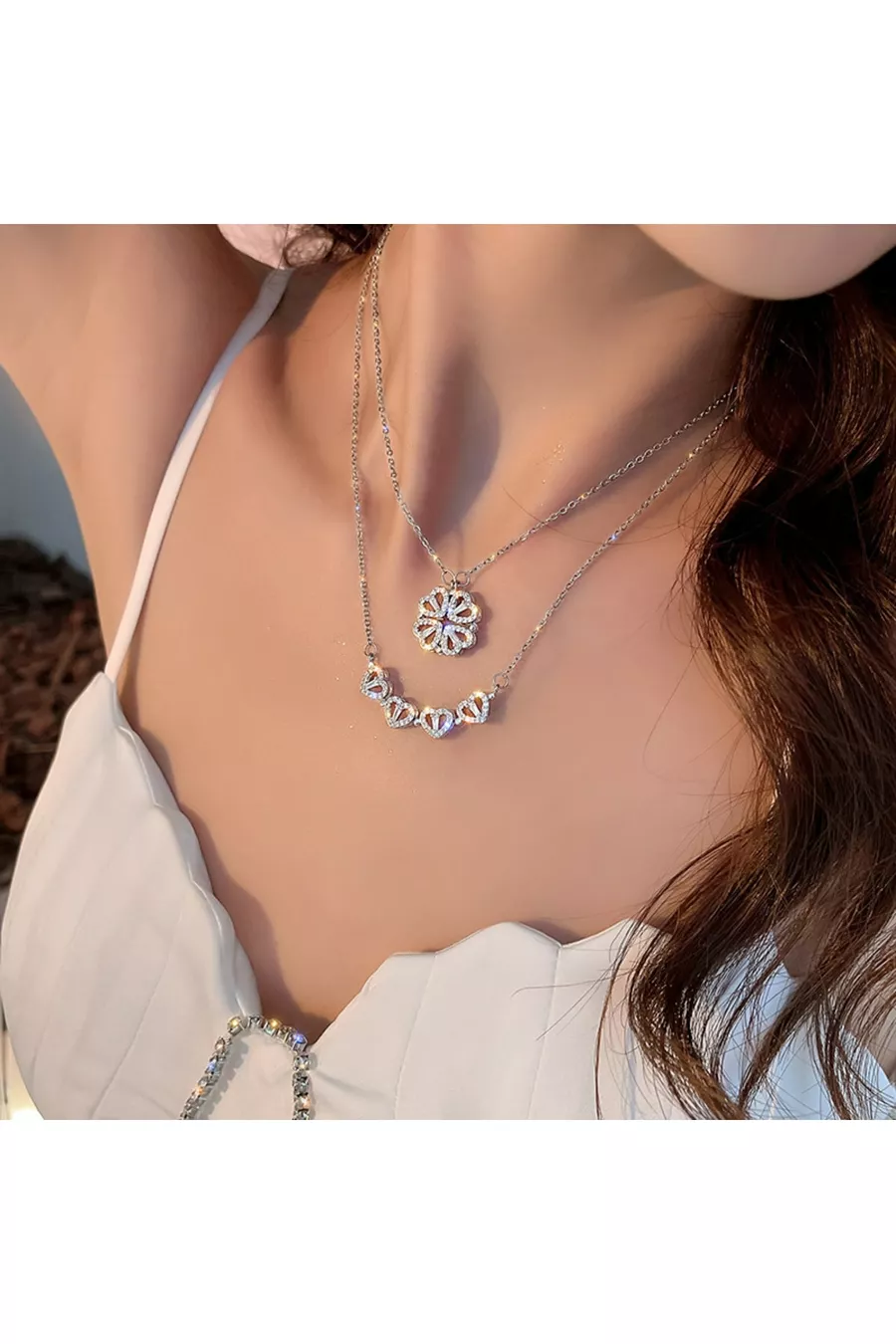 قلادة ثلاثية القلوب بمغناطيس من الفولاذ بحجر الزركون والورقة الرباعية