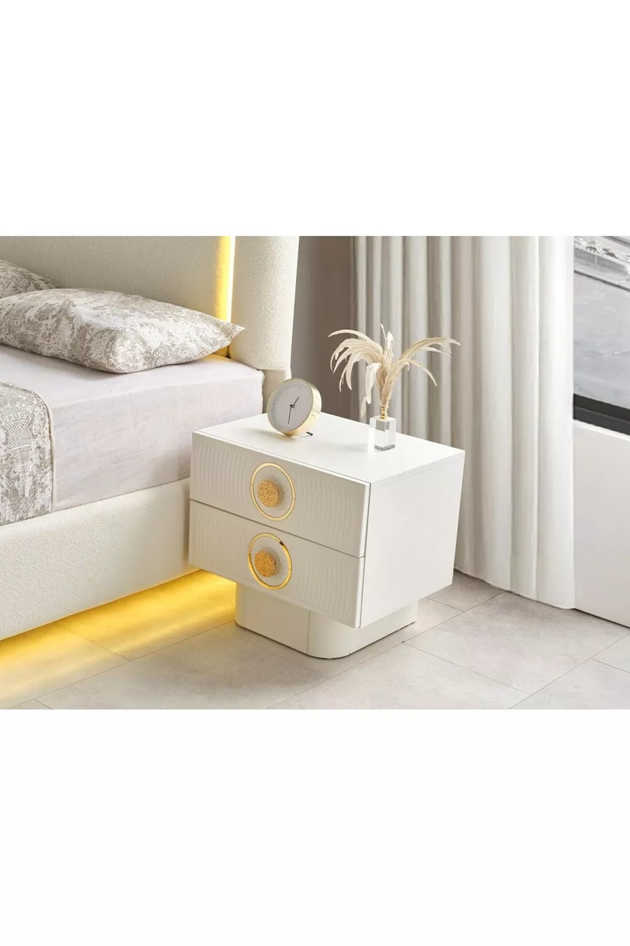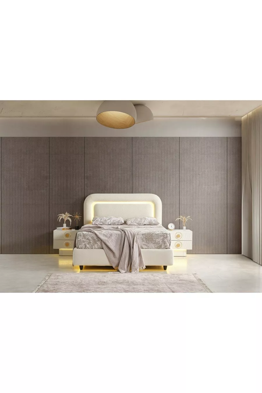 محتوى الطقم: خزانة + 2 من الطاولات الجانبية + خزانة أدراج + رأس سرير