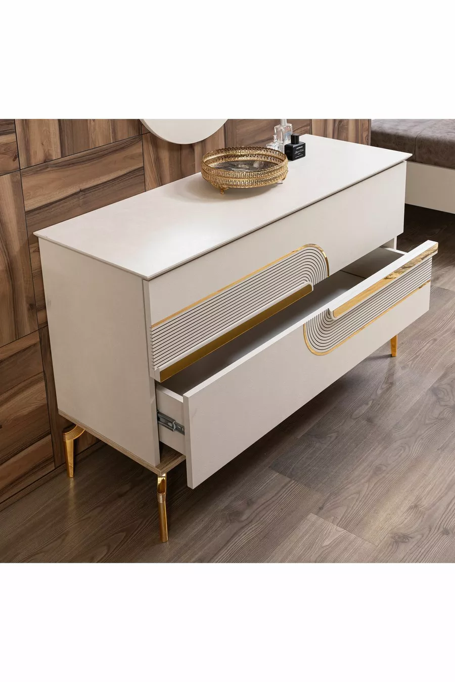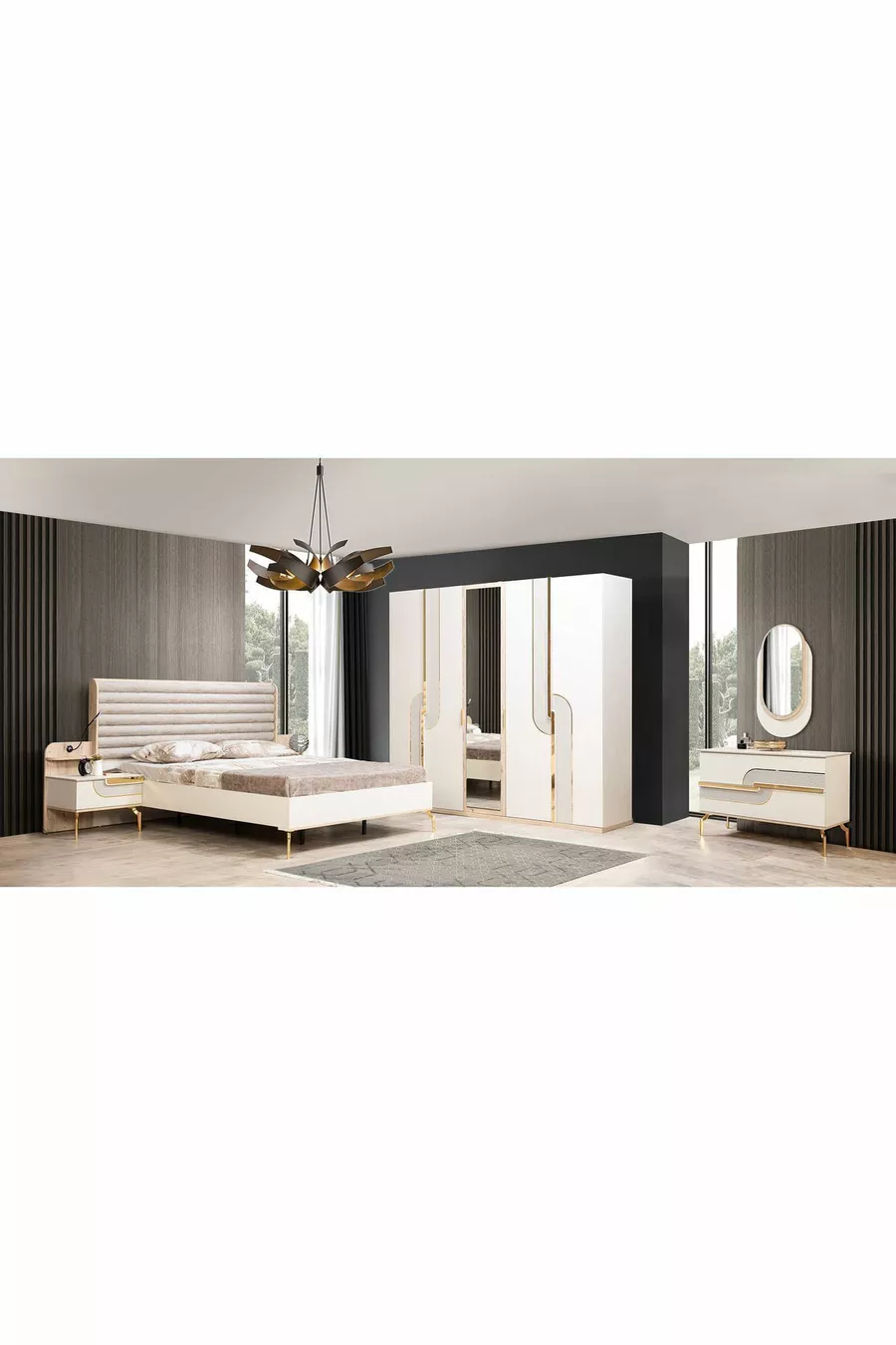 محتوى الطقم: سرير + 2 منضدة جانبية + تسريحة + خزانة ملابس + مرآة