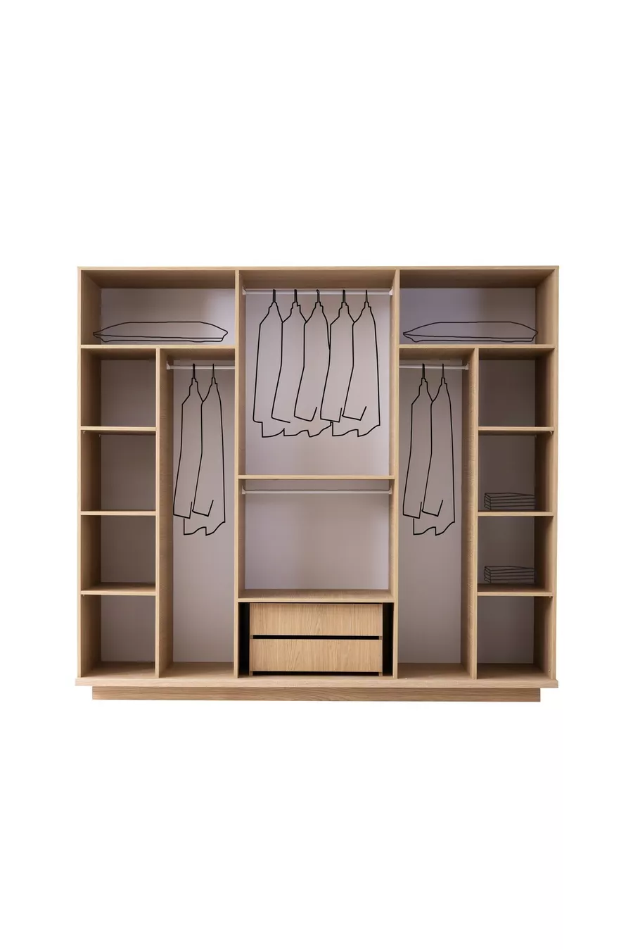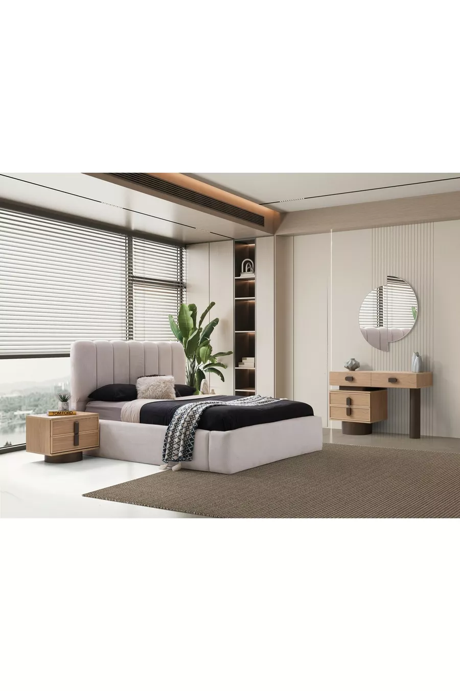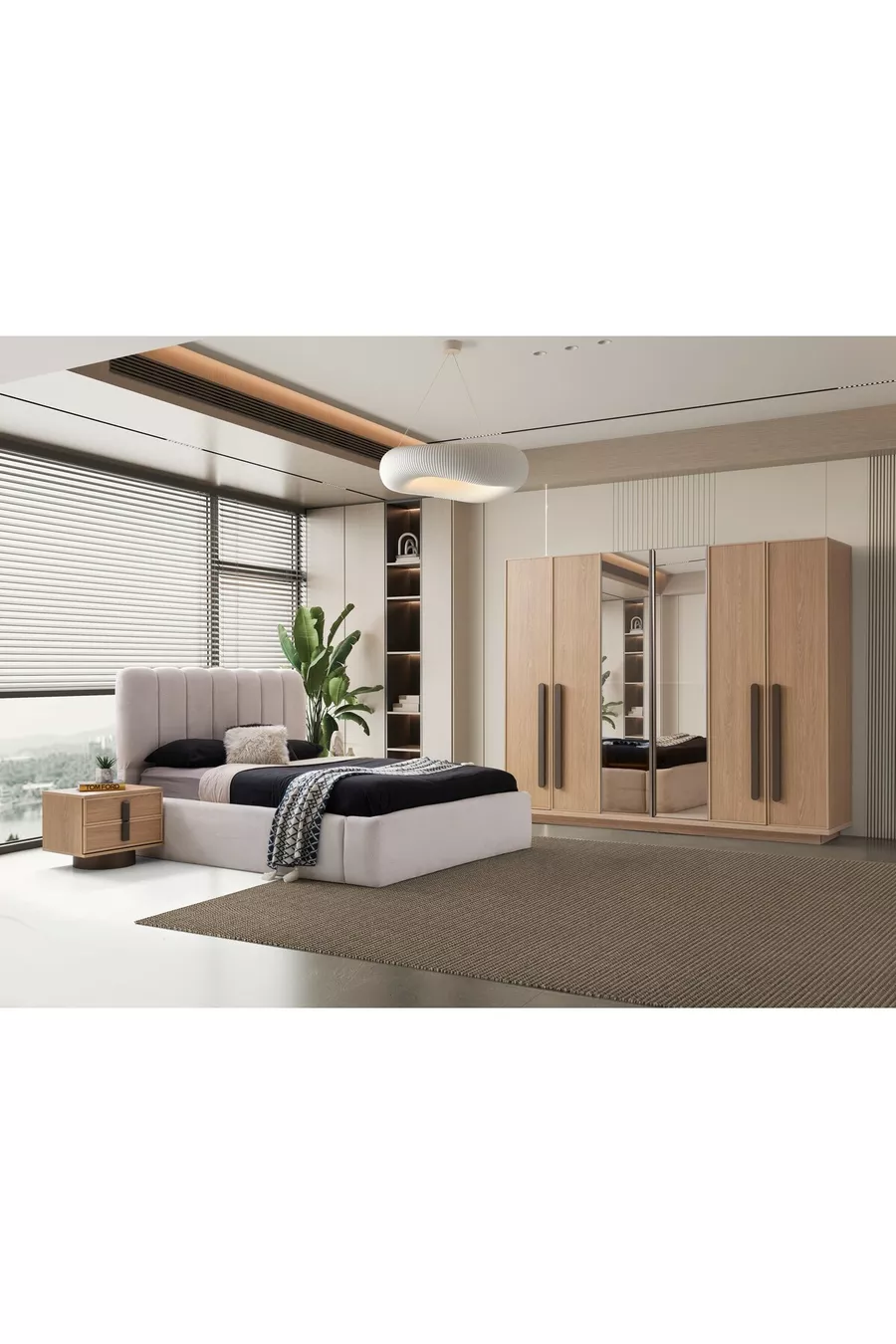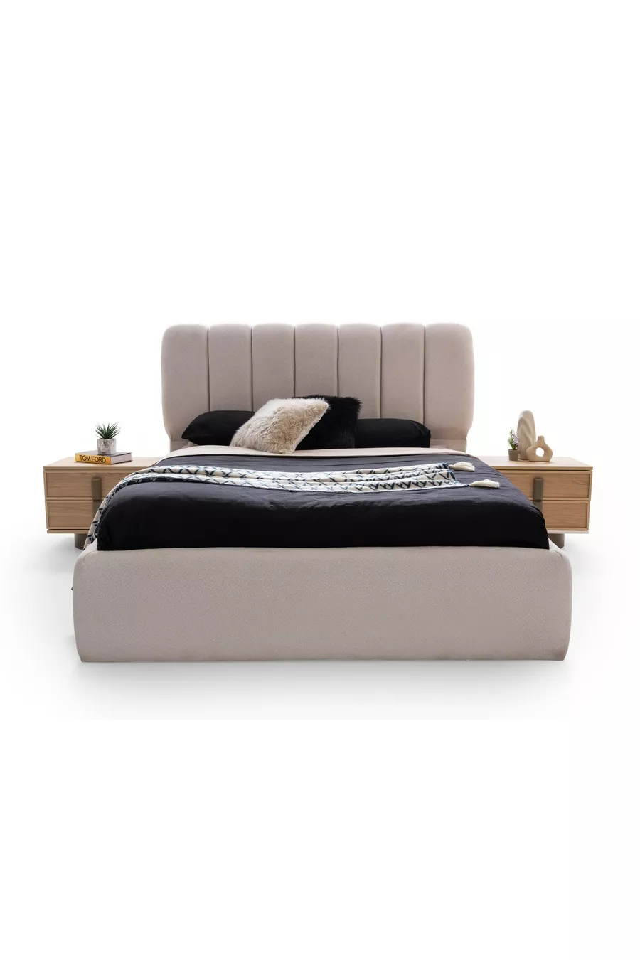 محتوى الطقم: سرير بقاعدة تخزين + 2 منضدة جانبية + كومود + خزانة