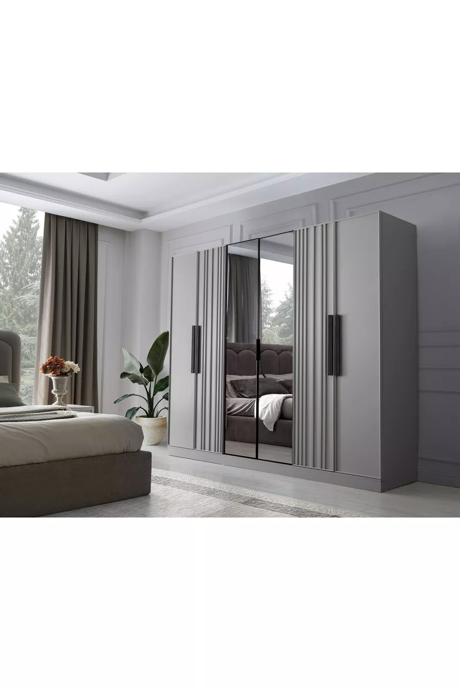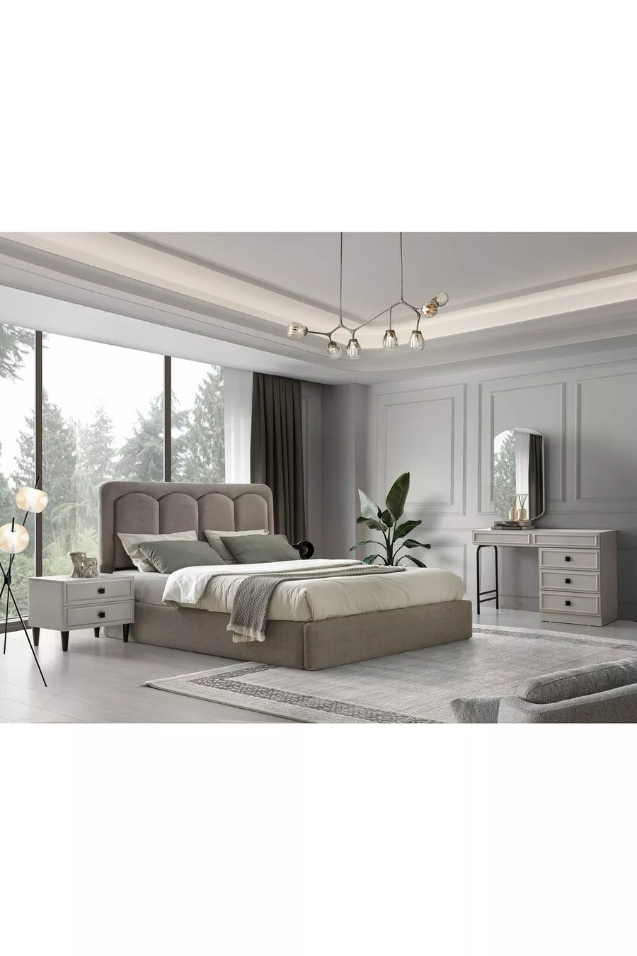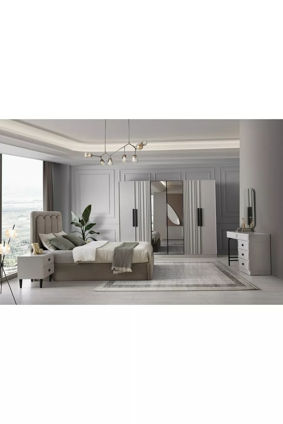 محتوى الطقم: خزانة + 2 طاولات جانبية + كومودينو + رأس سرير