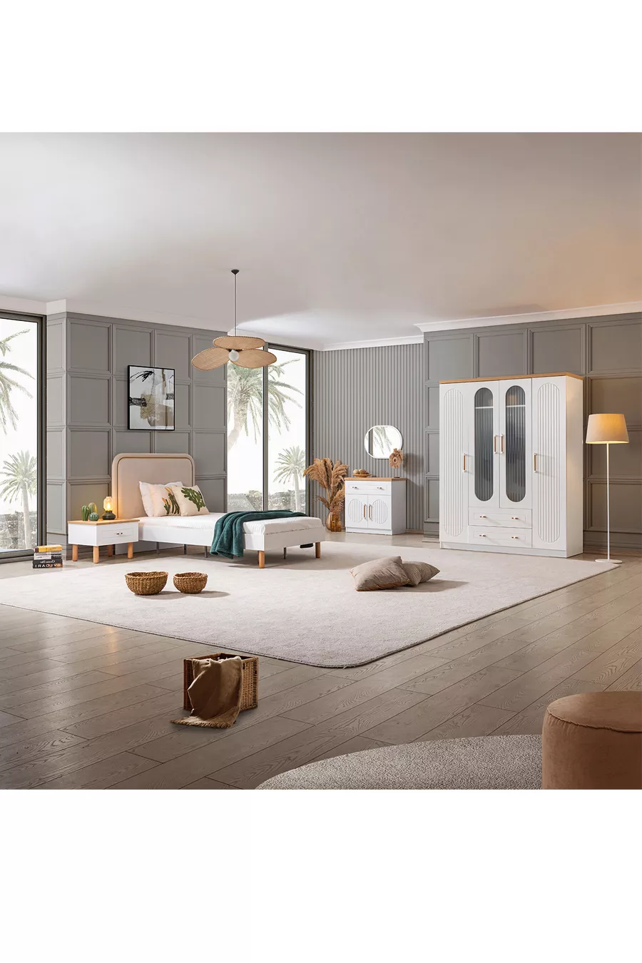 غرفة نوم فيتا بوهيم للشباب - خزانة بأربعة أبواب، سرير، كومودين، تسريحة