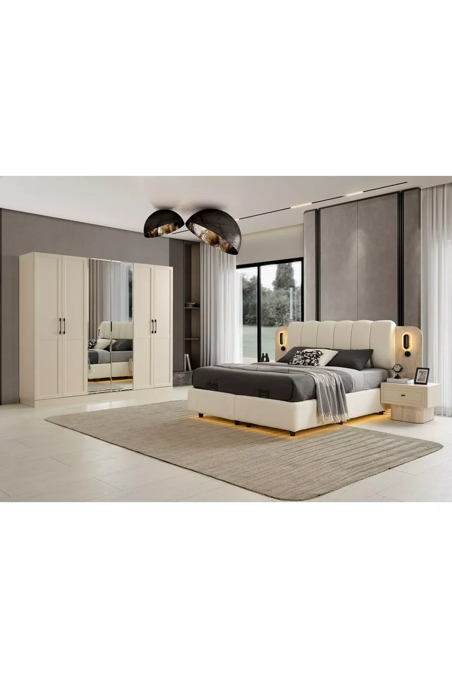 اللون: متعدد الألوان مدة الضمان: سنتان مقاس السرير/القاعدة: 150 × 200 وظيفة السرير: بدون قاعدة وظيفة الخزانة: بأبواب مادة جسم الخزانة: MDF عدد الأبواب: 6 محتويات الطقم: خزانة + 2 منضدة جانبية + كومودينو + رأس سرير الطراز: حديث الثيم / الطراز: حديث البلد المنشأ: تركيا