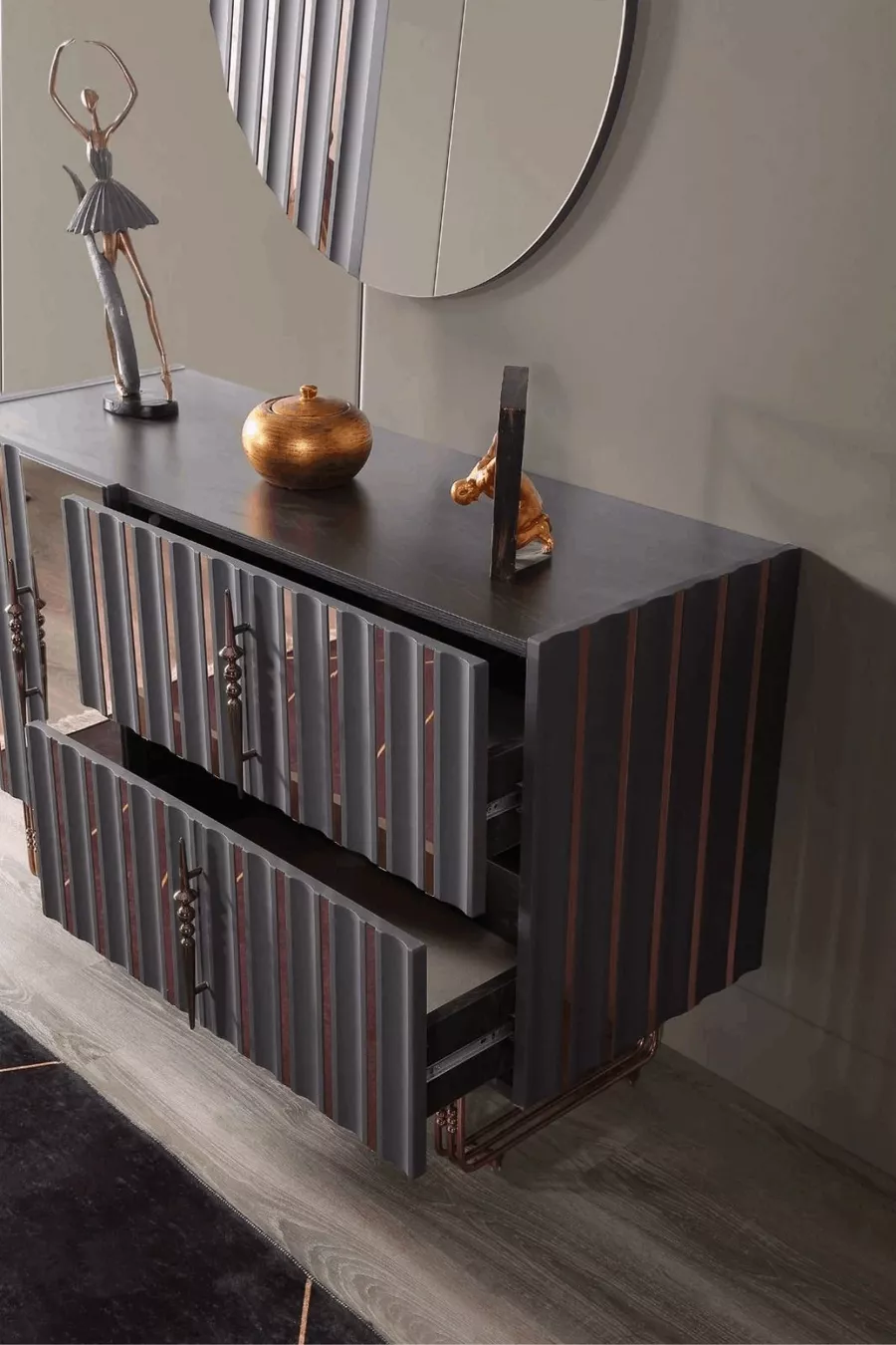 اللون: أسود مدة الضمان: سنتان مقاس السرير/قاعدة السرير: 160 × 200 وظيفة السرير: قاعدة تخزين وظيفة الخزانة: منزلق مادة جسم الخزانة: شونتلام عدد الأبواب: منزلق محتوى الطقم: سرير + 2 طاولة جانبية + كمدين + خزانة الطراز: حديث الموضوع / الطراز: حديث
