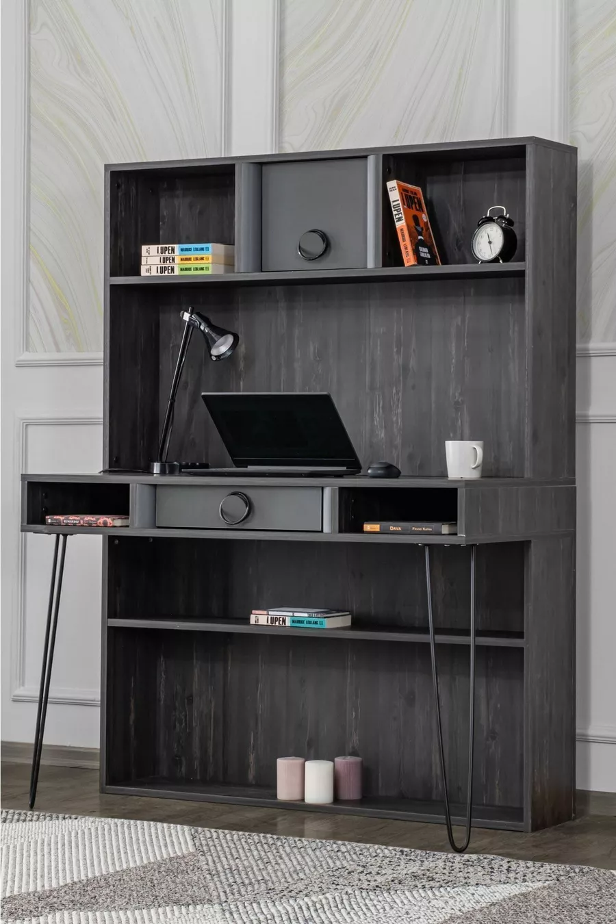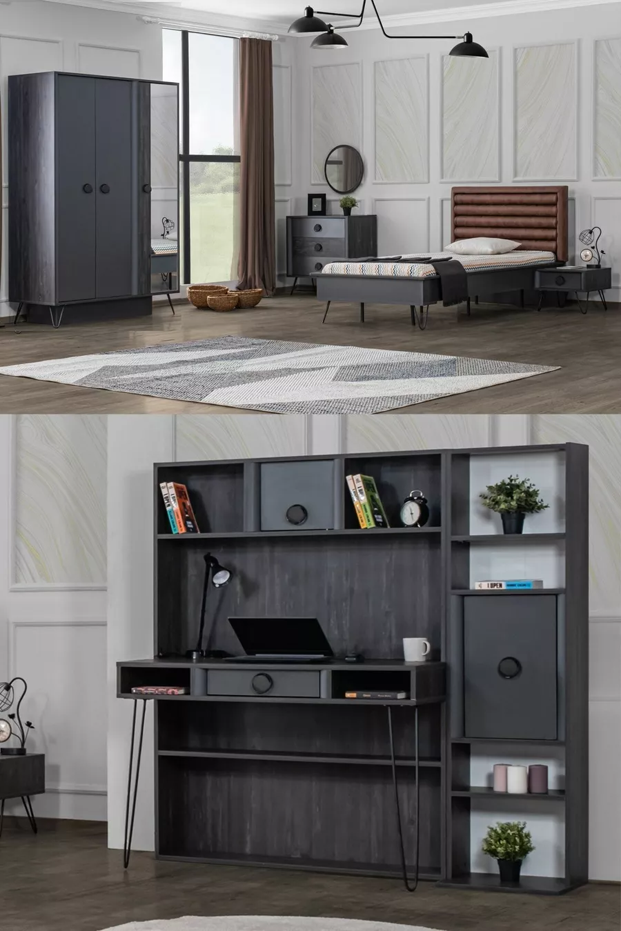 غرفة نوم شباب جيل جديد سوداء - خزانة بثلاثة أبواب، سرير، منضدة جانبية، كومود، مكتب، مكتبة