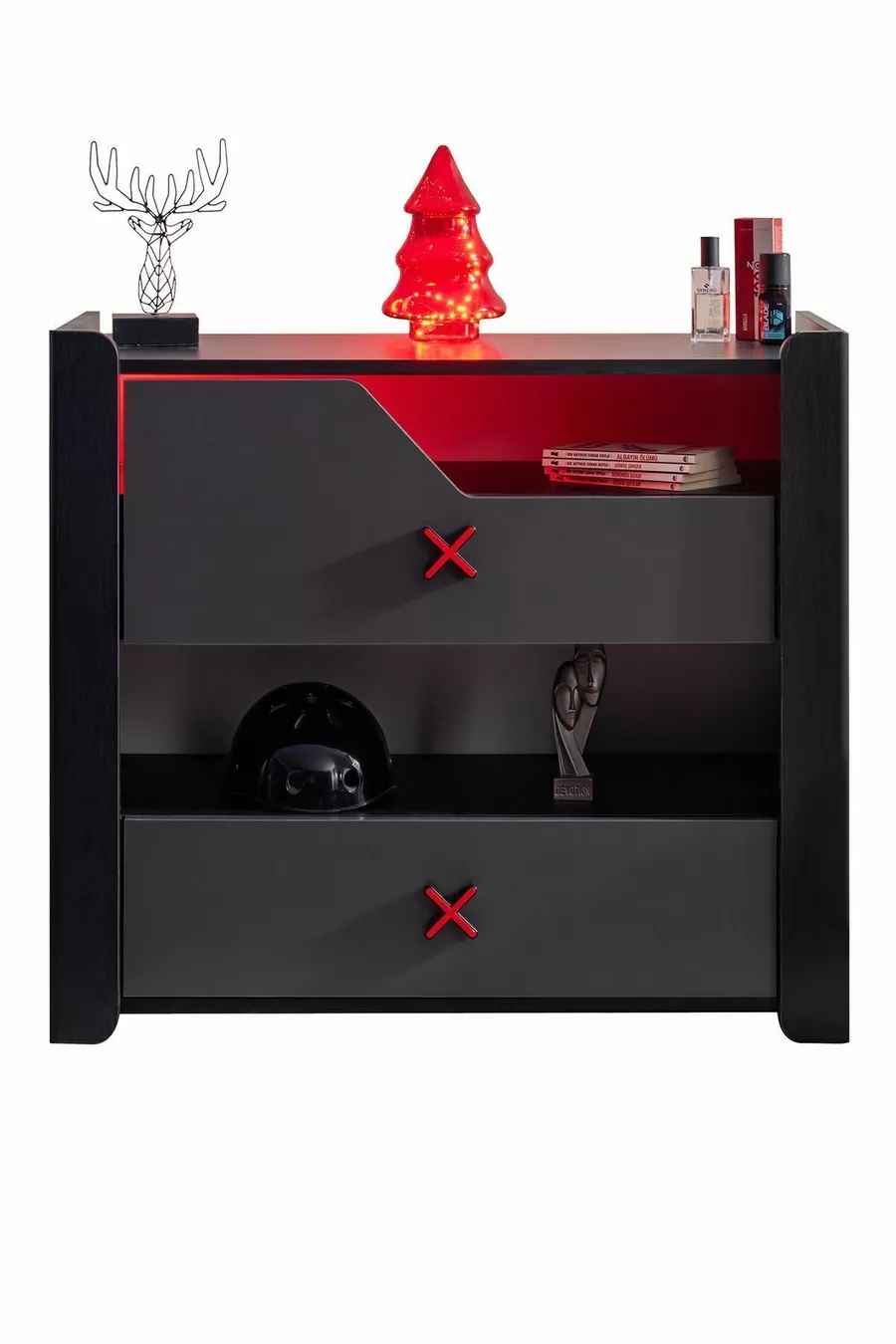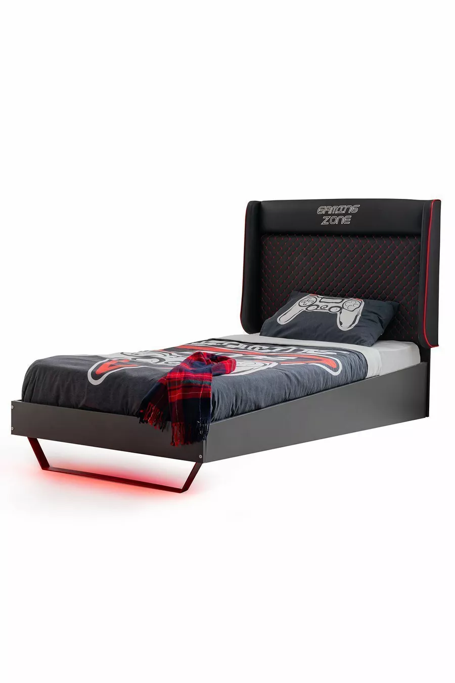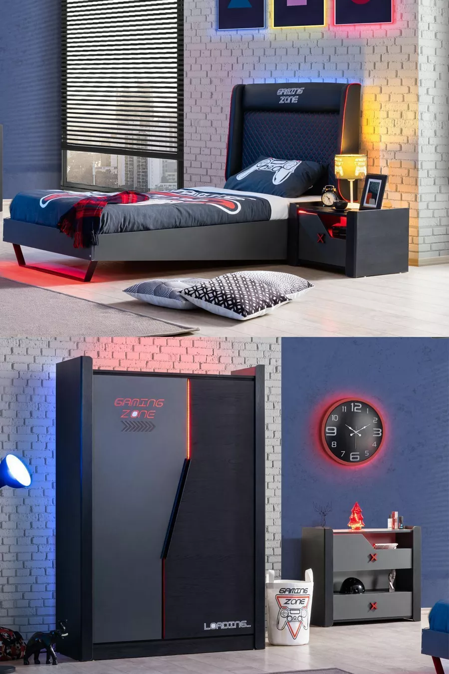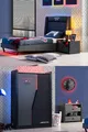 غرفة نوم شبابية بإضاءة LED للألعاب - خزانة ببابين، سرير، منضدة جانبية، كومود
