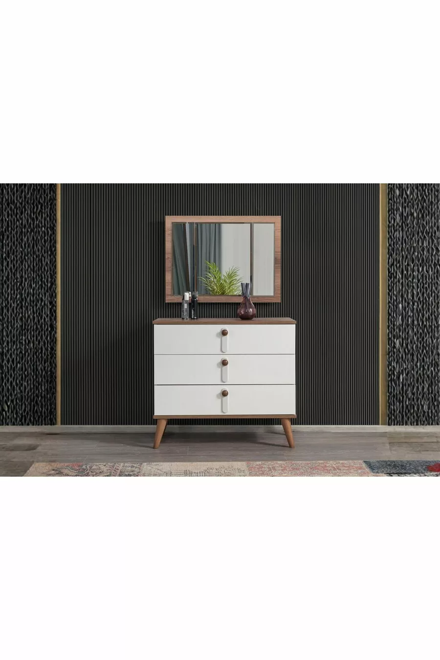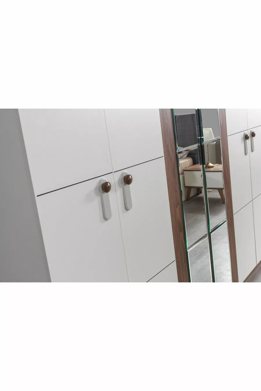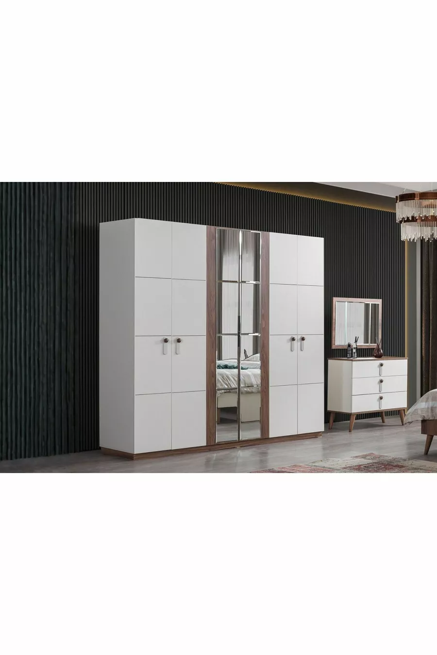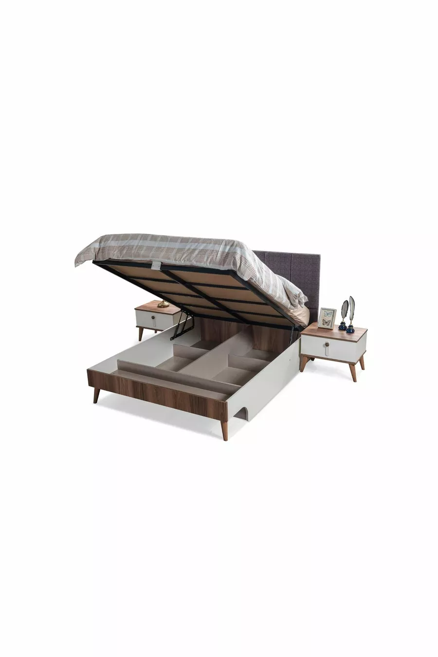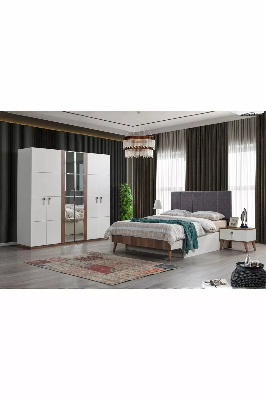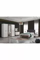 محتوى الطقم: خزانة + 2 طاولات جانبية + كومود + رأس سرير بصندوق تخزين