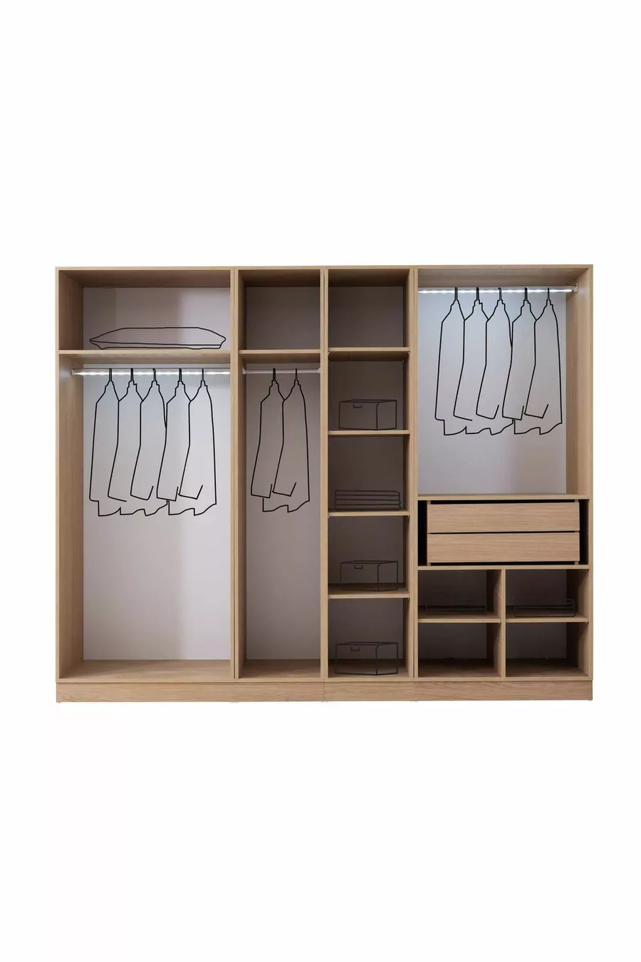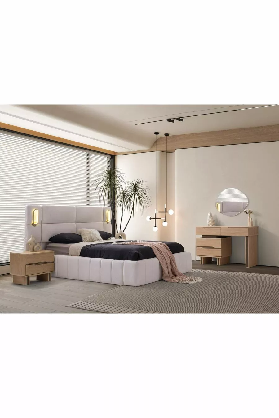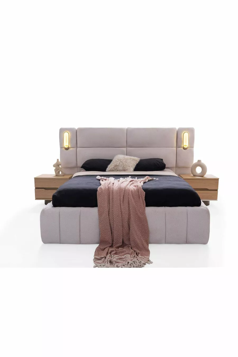 محتوى الطقم: سرير مع قاعدة تخزين + 2 من الطاولات الجانبية + كومودينو + خزانة