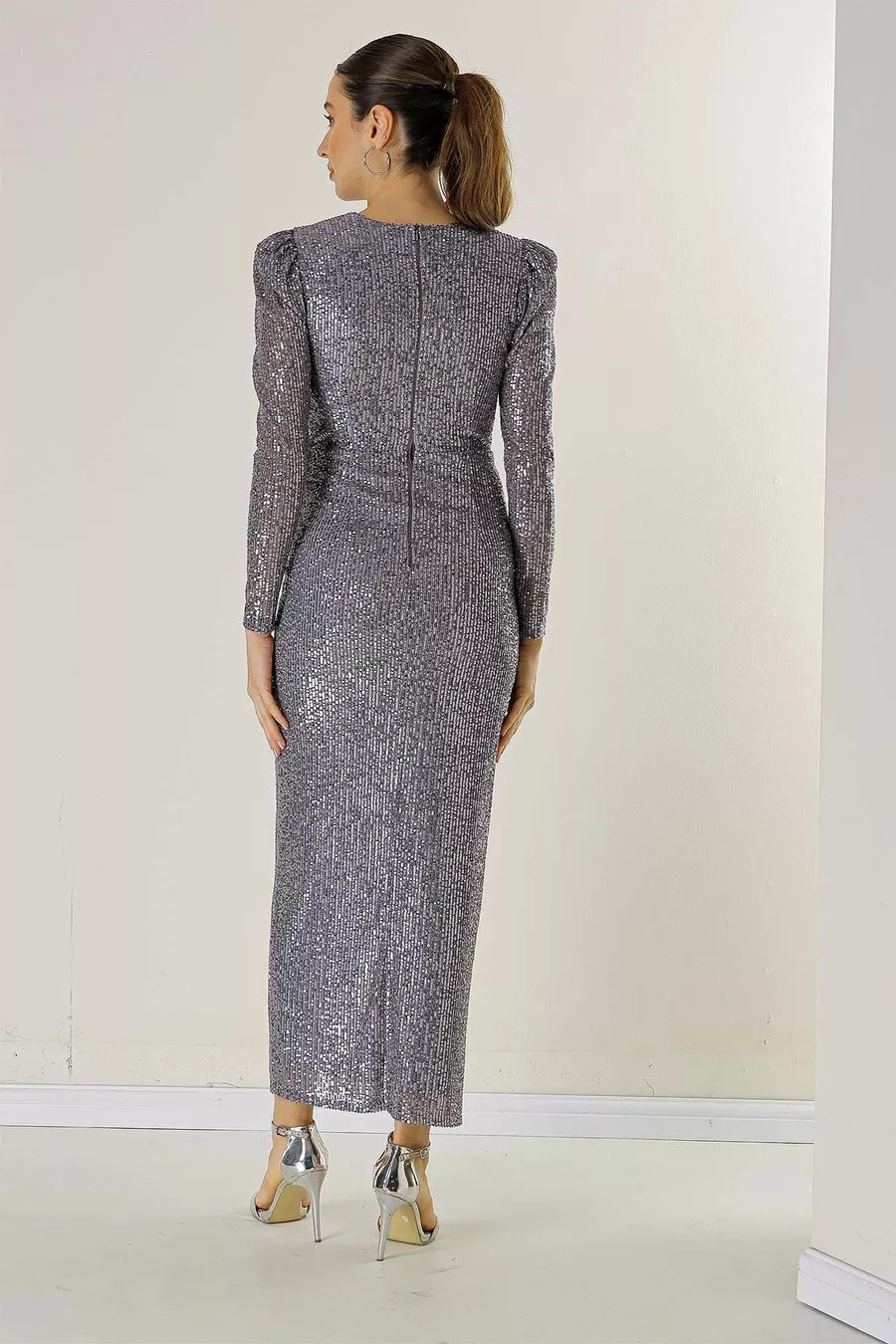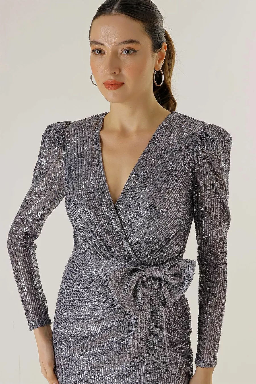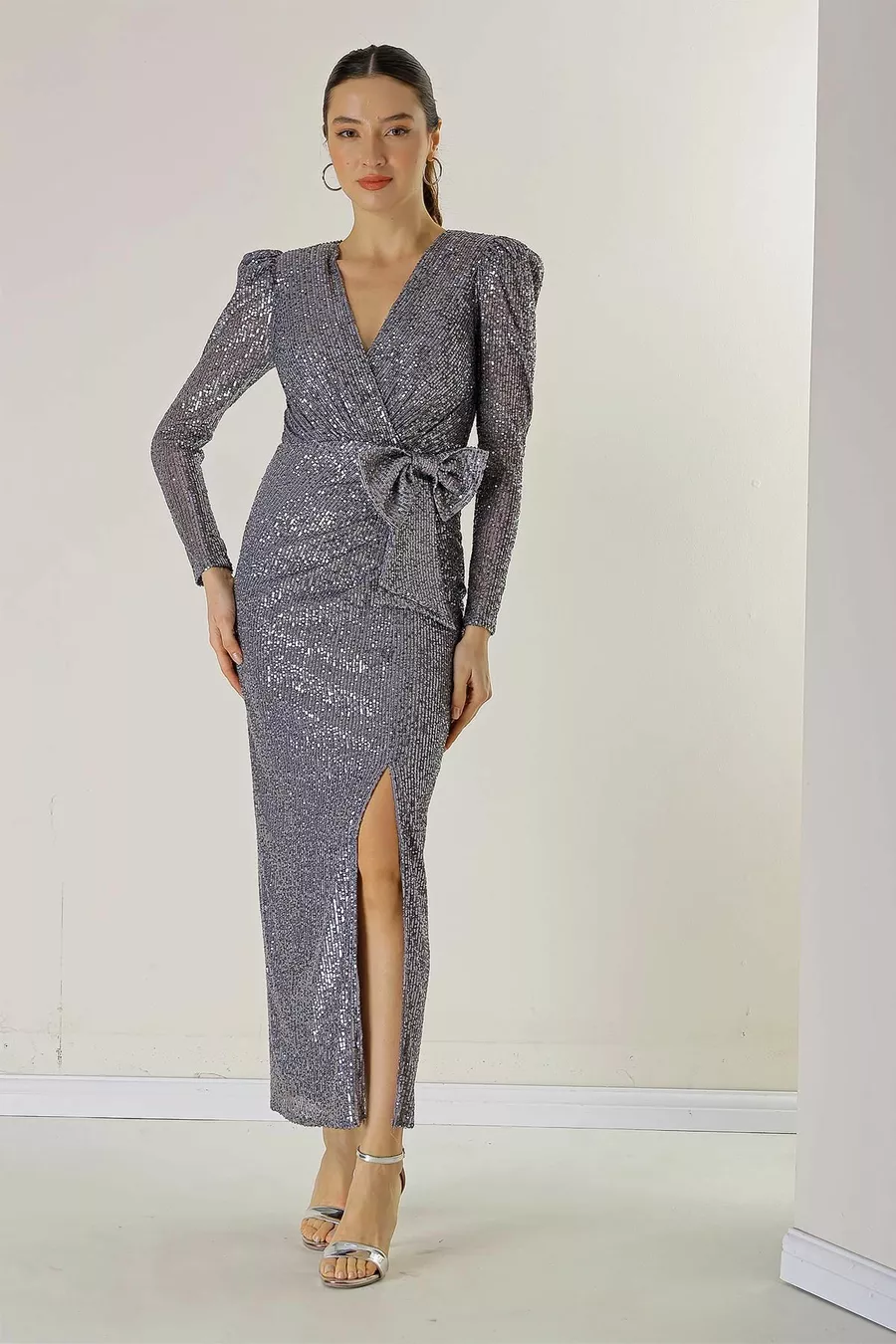 فتحة رقبة مزدوجة الصدر بعقدة وخصر وفستان بفتحة