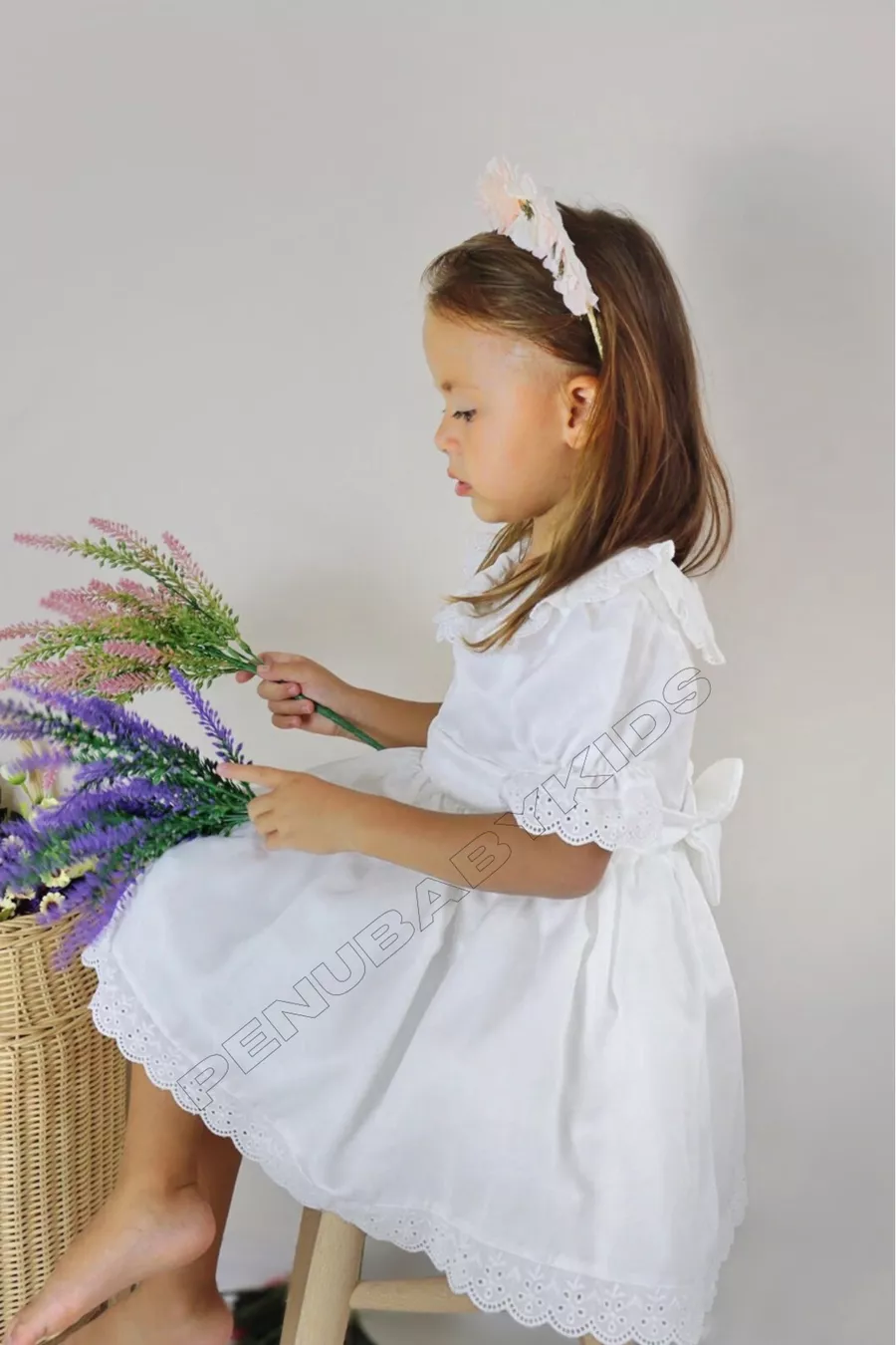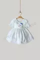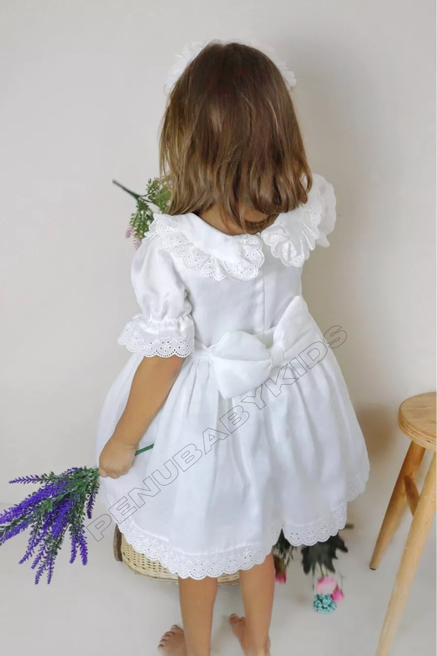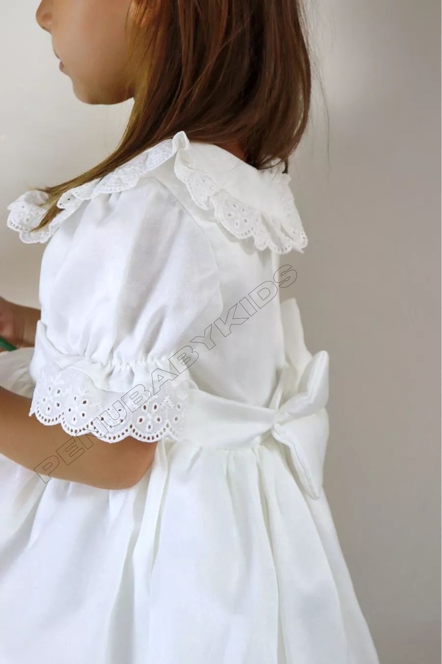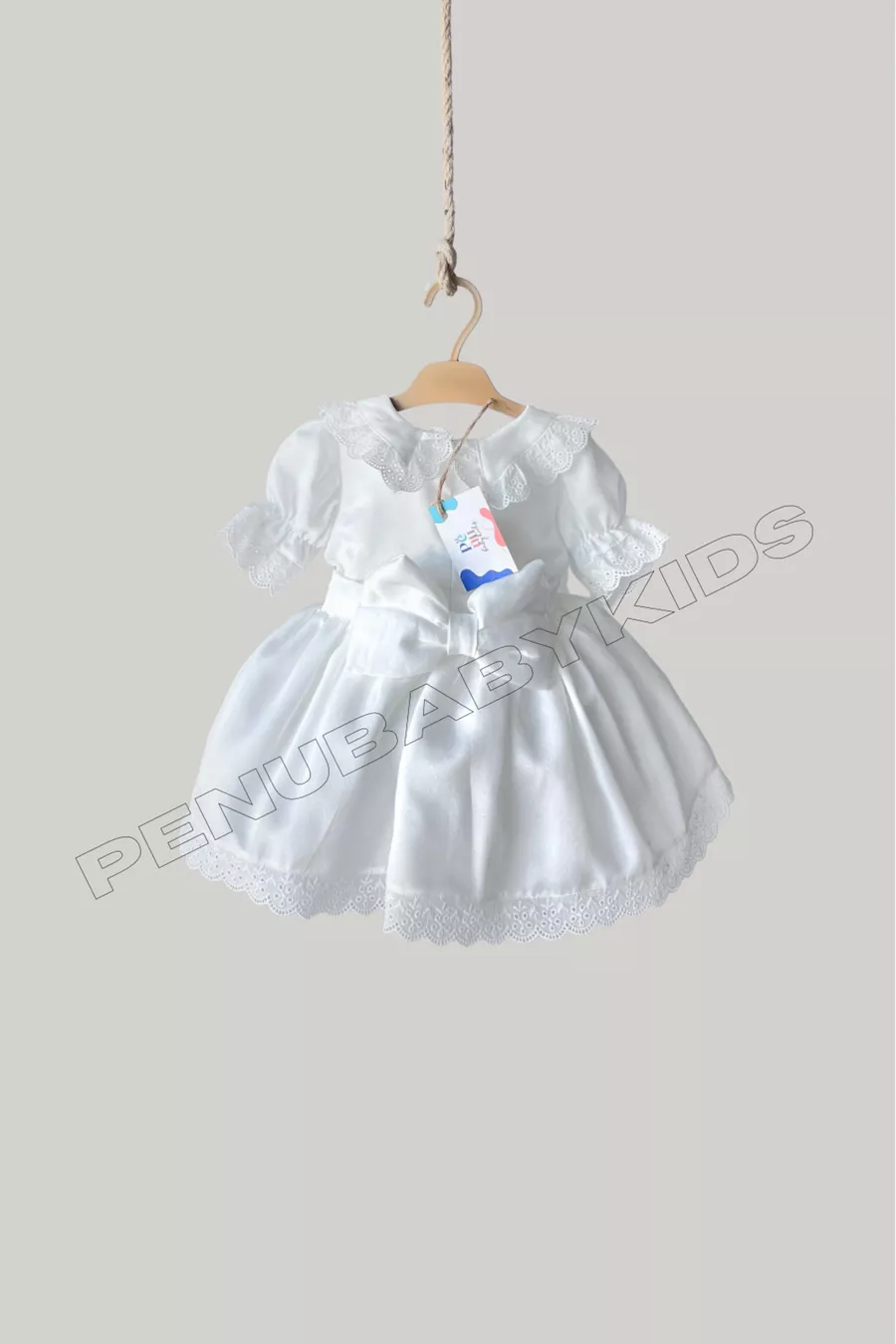 فستان بيبي بنات بأكمام قصيرة وقوس أبيض على اللون الأبيض - كاندي