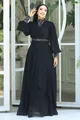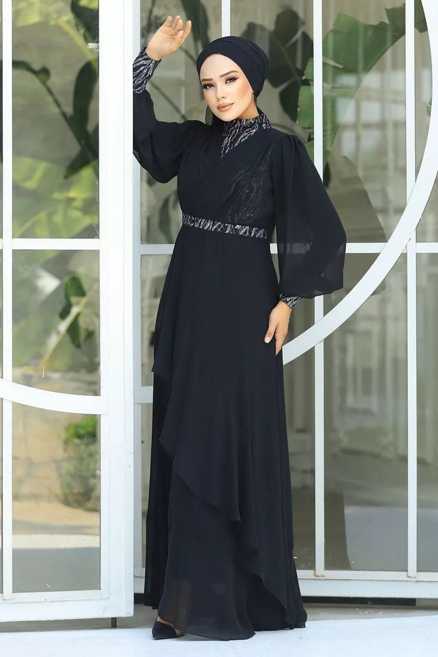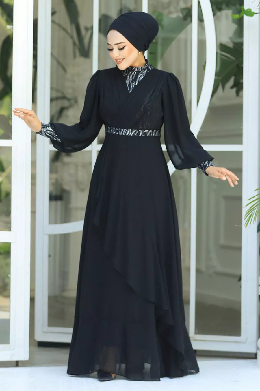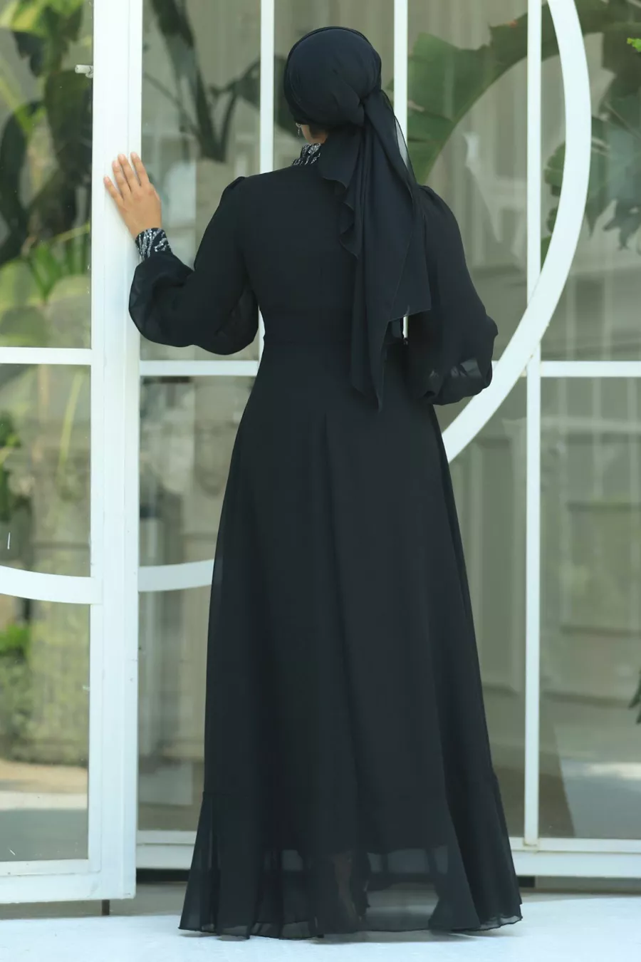 فستان سهرة محجب - فستان سهرة محجب أسود مع تفاصيل خرزة S