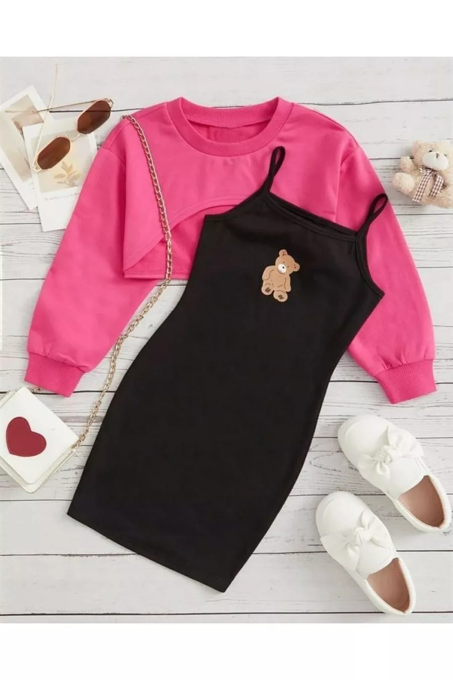 فستان فتاة مع تفاصيل مطبوعة للدب الصغير اللطيف & تنسيق سويتر قصير