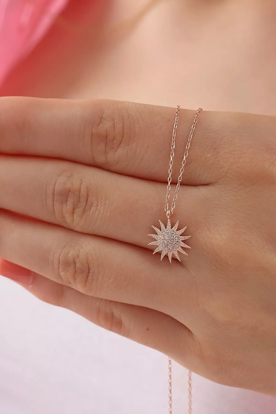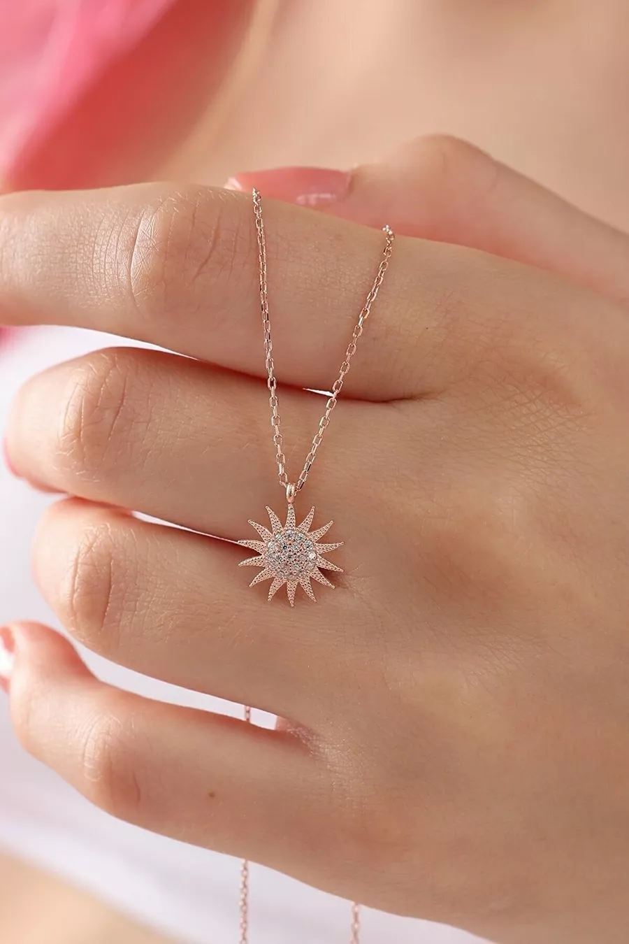 قلادة بطبقة وردية من الفضة عيار بسلسلة، مزينة بحجر زركون أبيض على شكل شمس