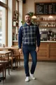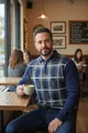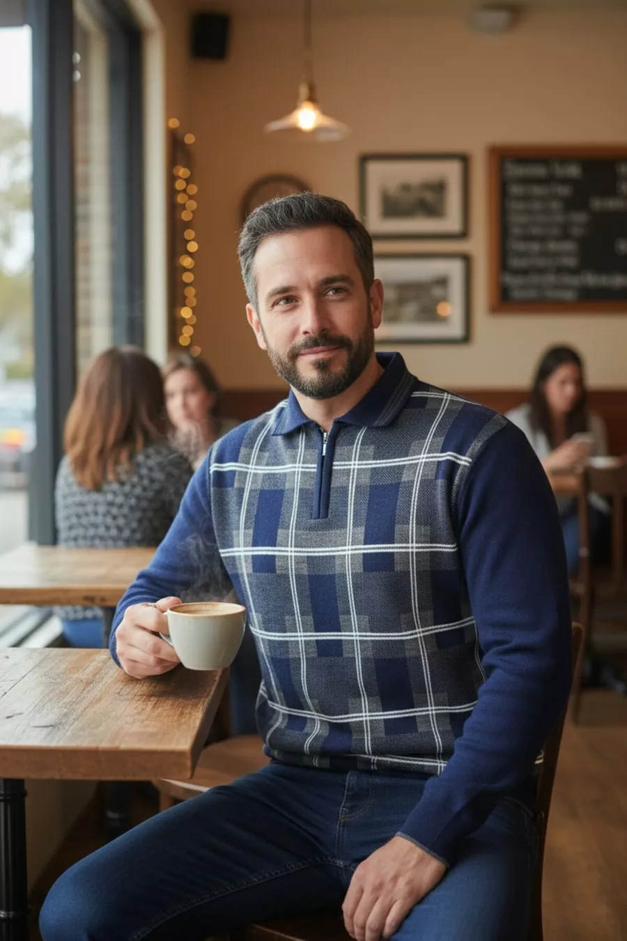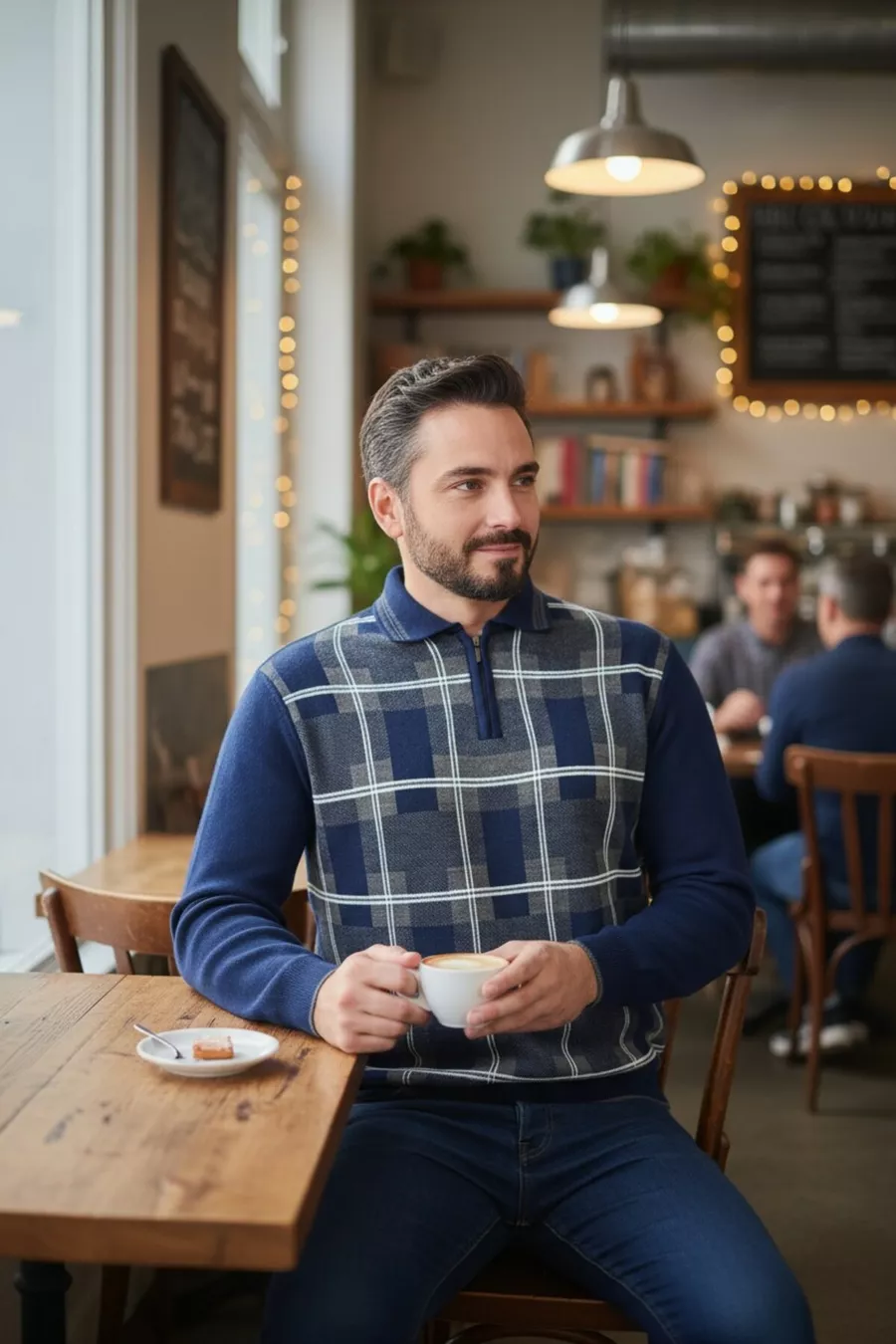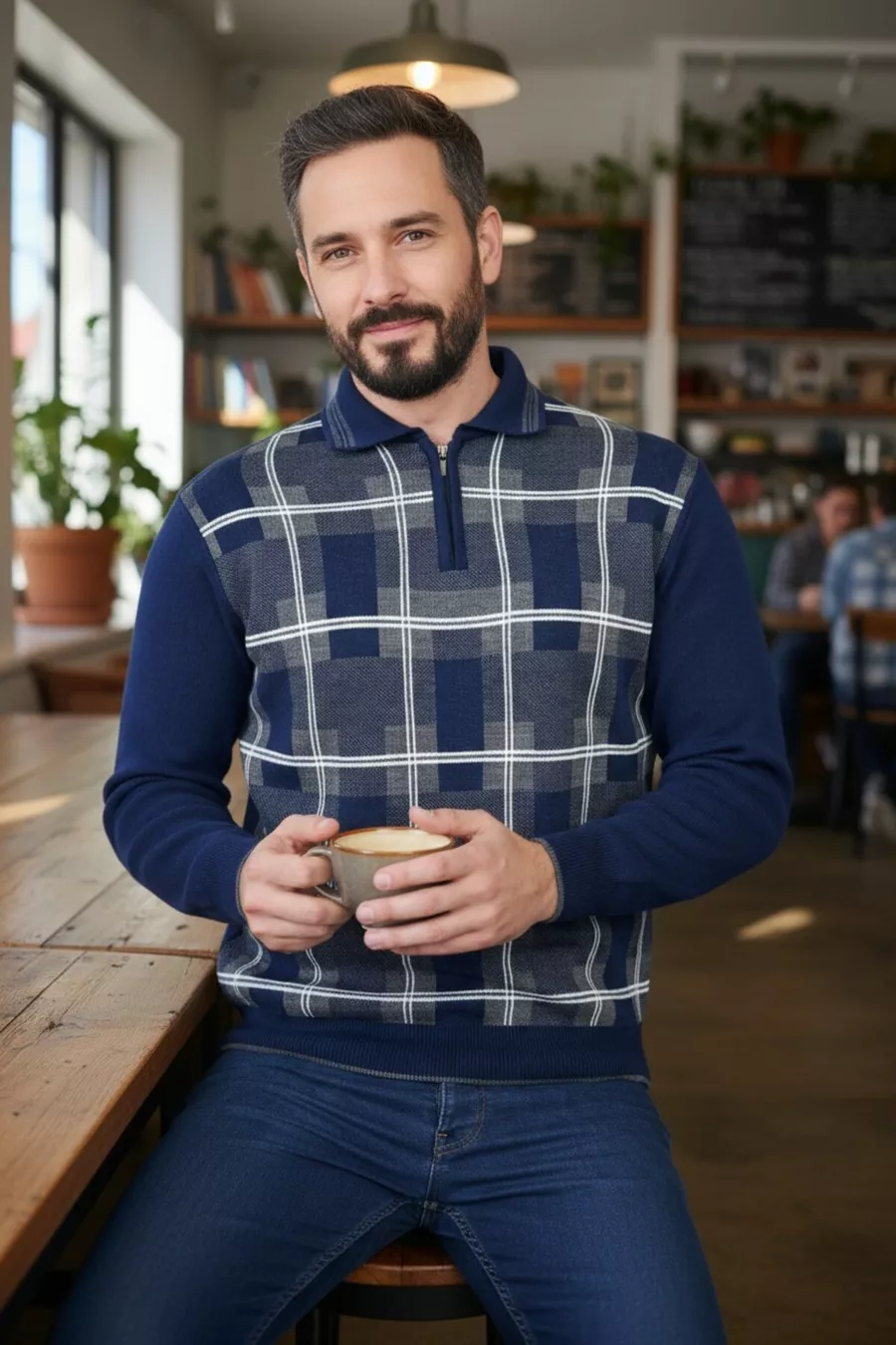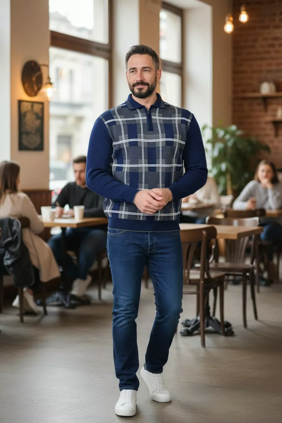 كنزة رجالية صوفية شتوية للآباء بنقشة حياكة فولاذية، بياقة قميص، بسوستة، ياقة بولو، لا تتنسج