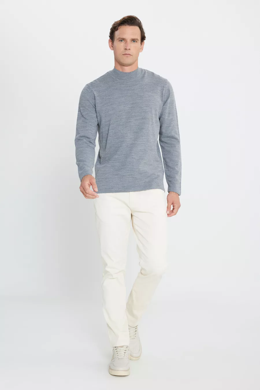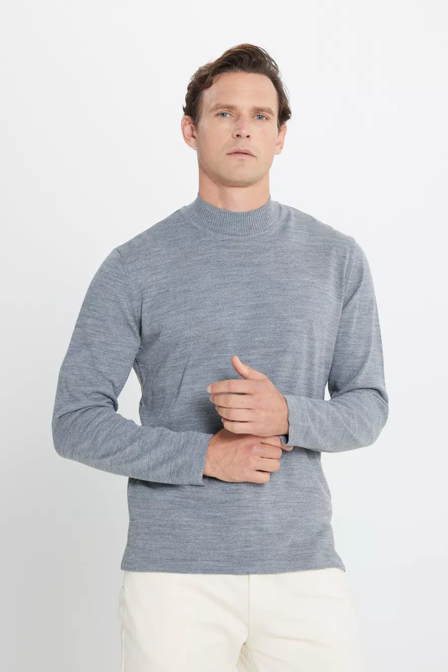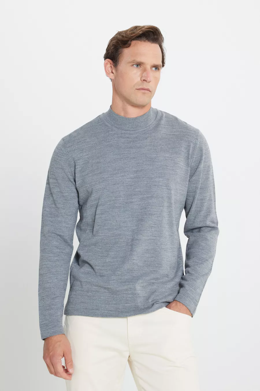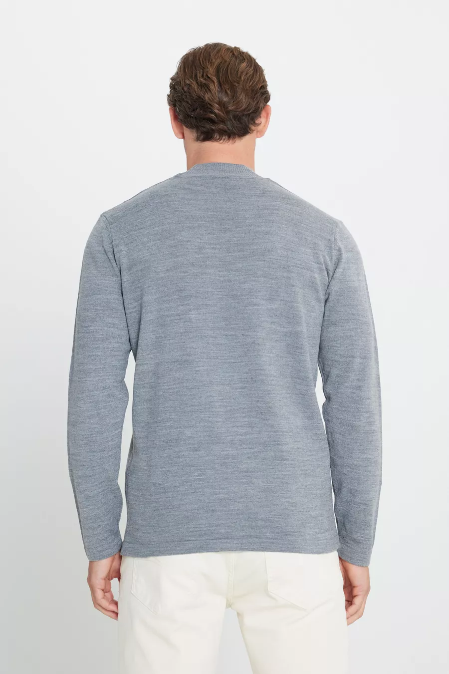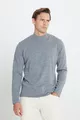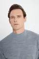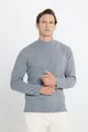 كنزة رجالية رمادية غامقة، مقاومة للوبر، قصّة عادية، فتحة رقبة نصف سلندر، حجم عادي