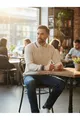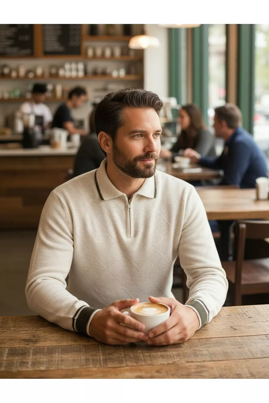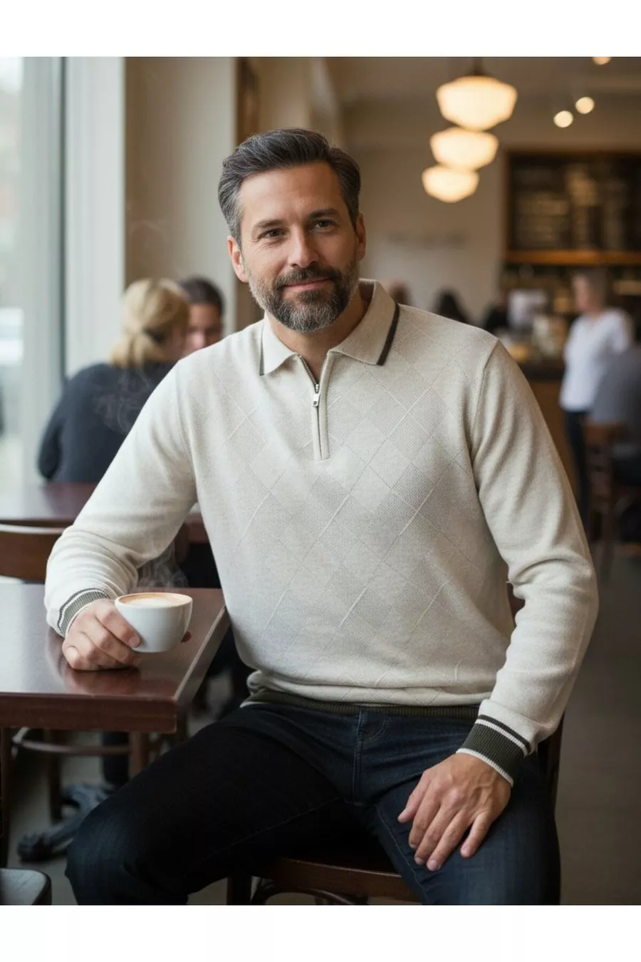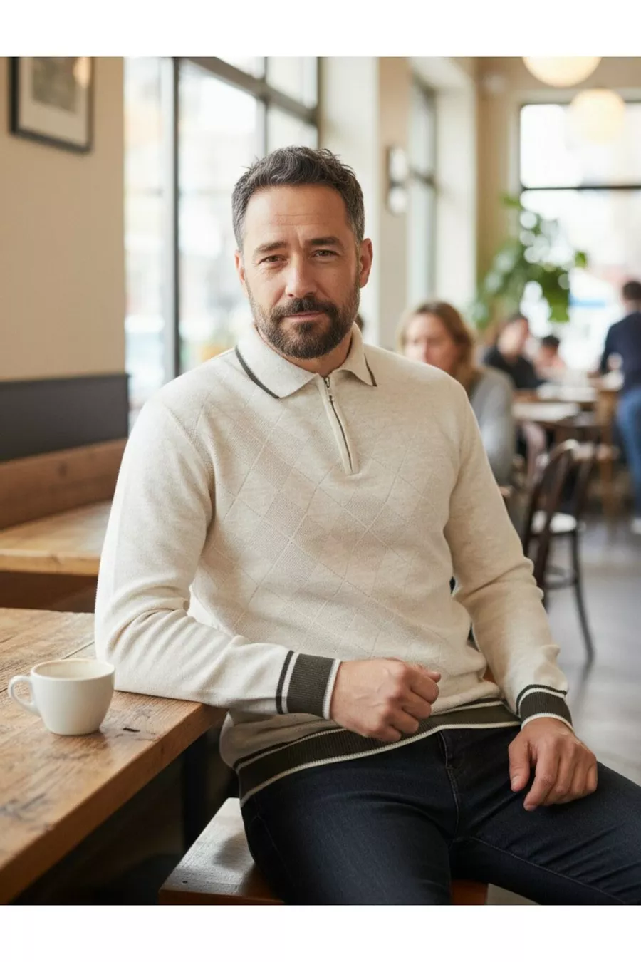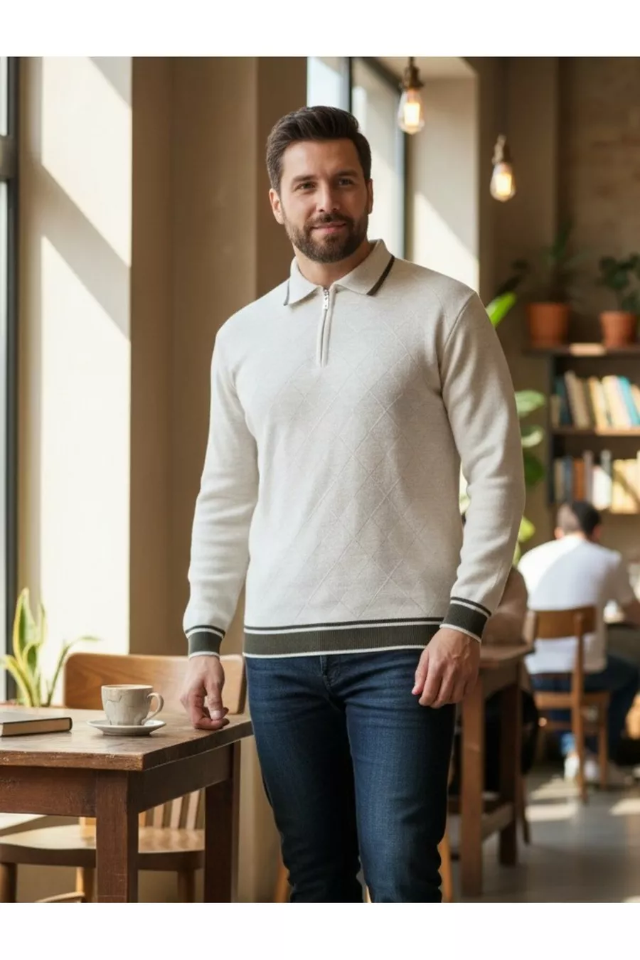 كنزة شتوية رجالية بلون الكريم، منسوجة بسلك فولاذي، بياقة قميص وأمامية محكمة بسحّاب، بياقة بولو، من قماش صوفي لا يتلف