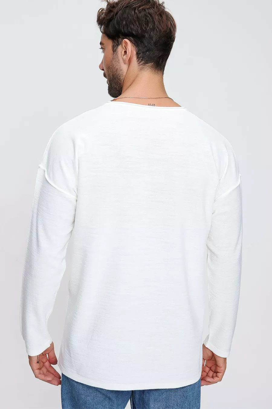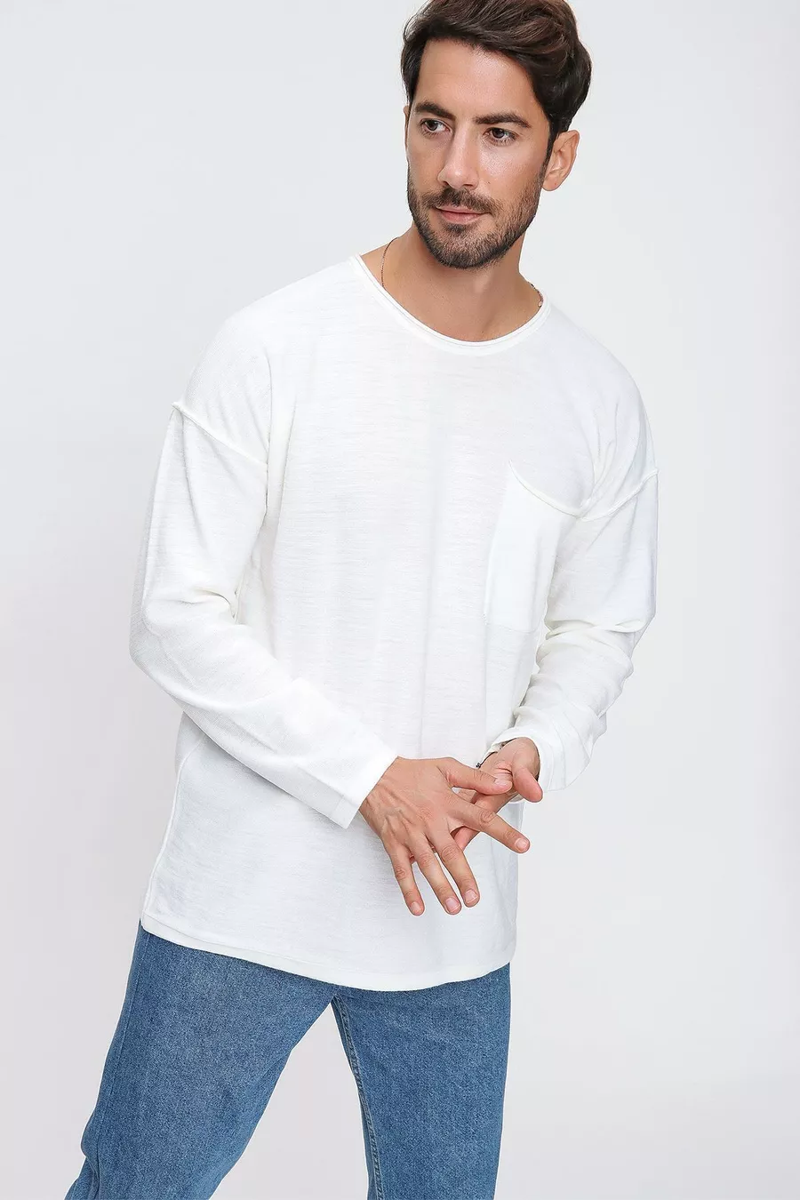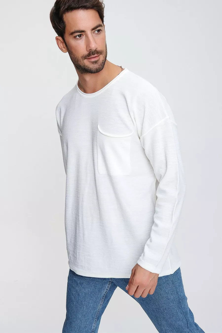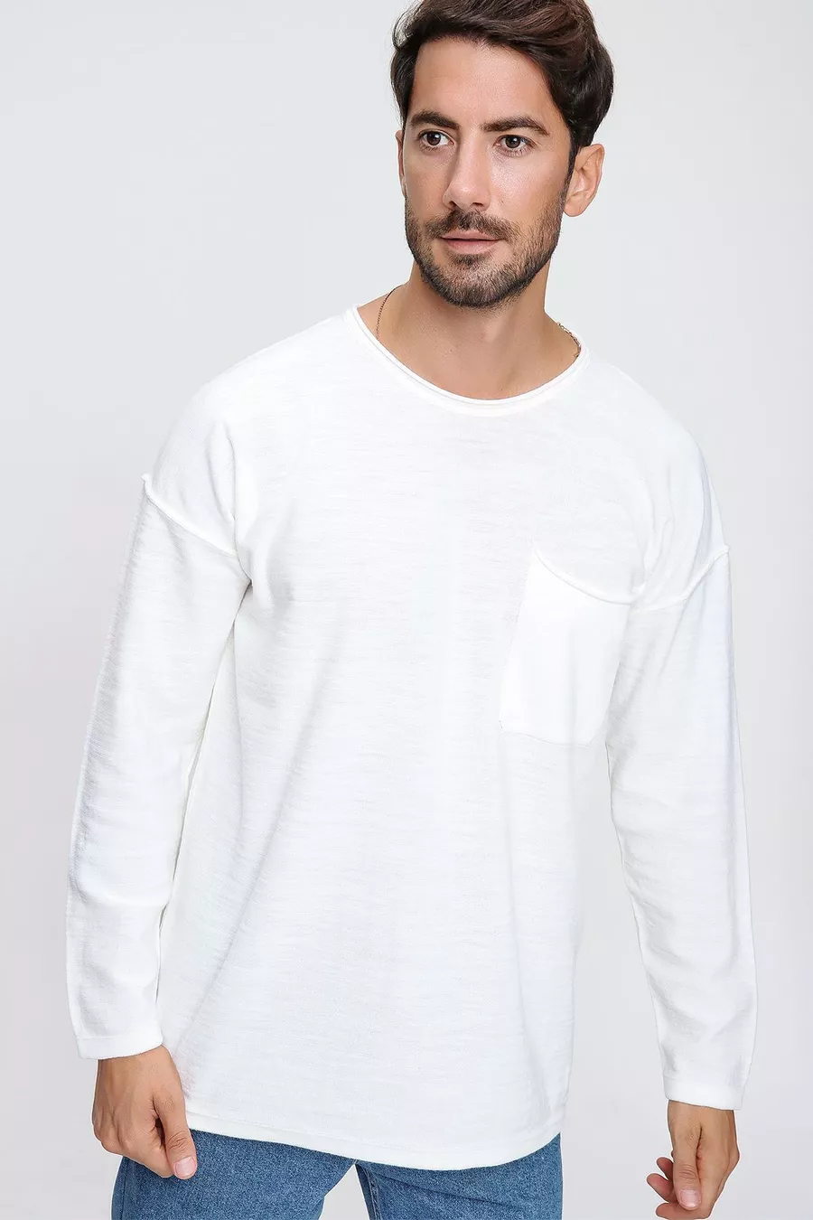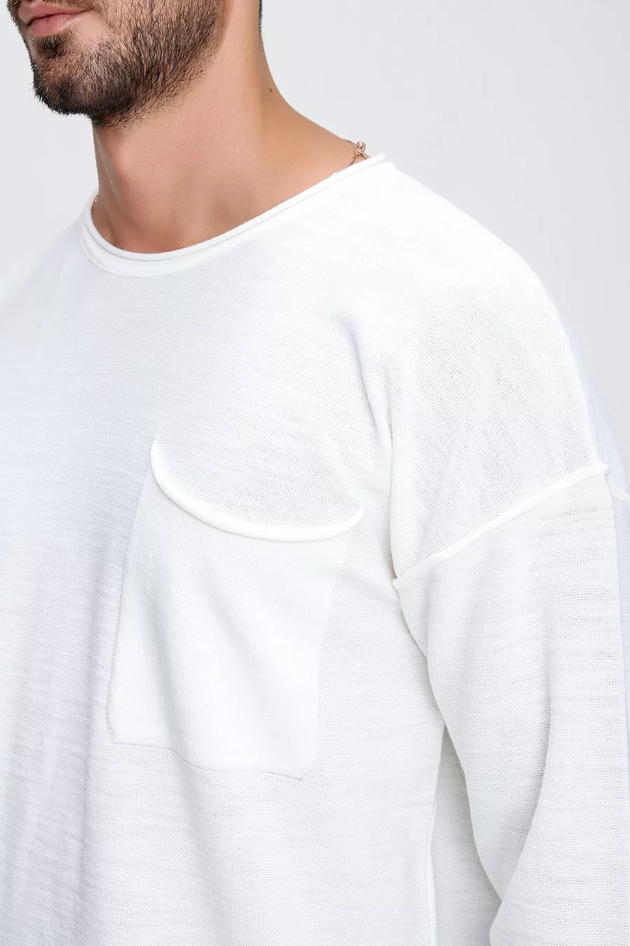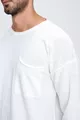 كنزة صوفية رجالية بلون العاج بياقة دائرية جيب وجيوب خياطة متسخة طويلة الأكمام خفيفة الوزن