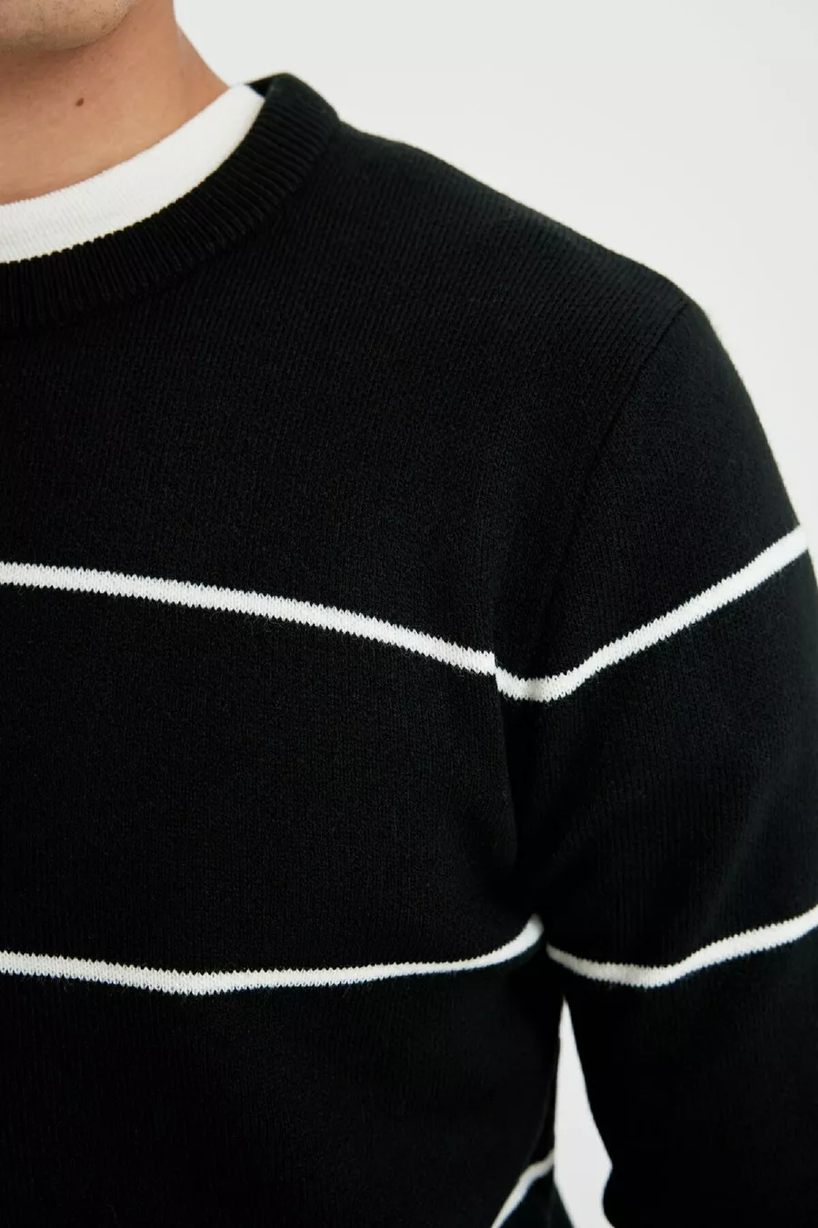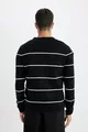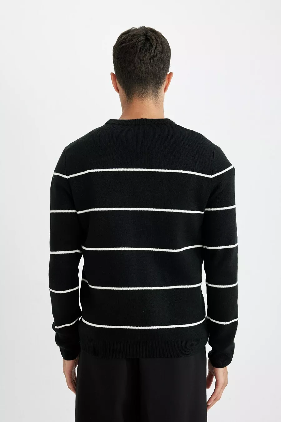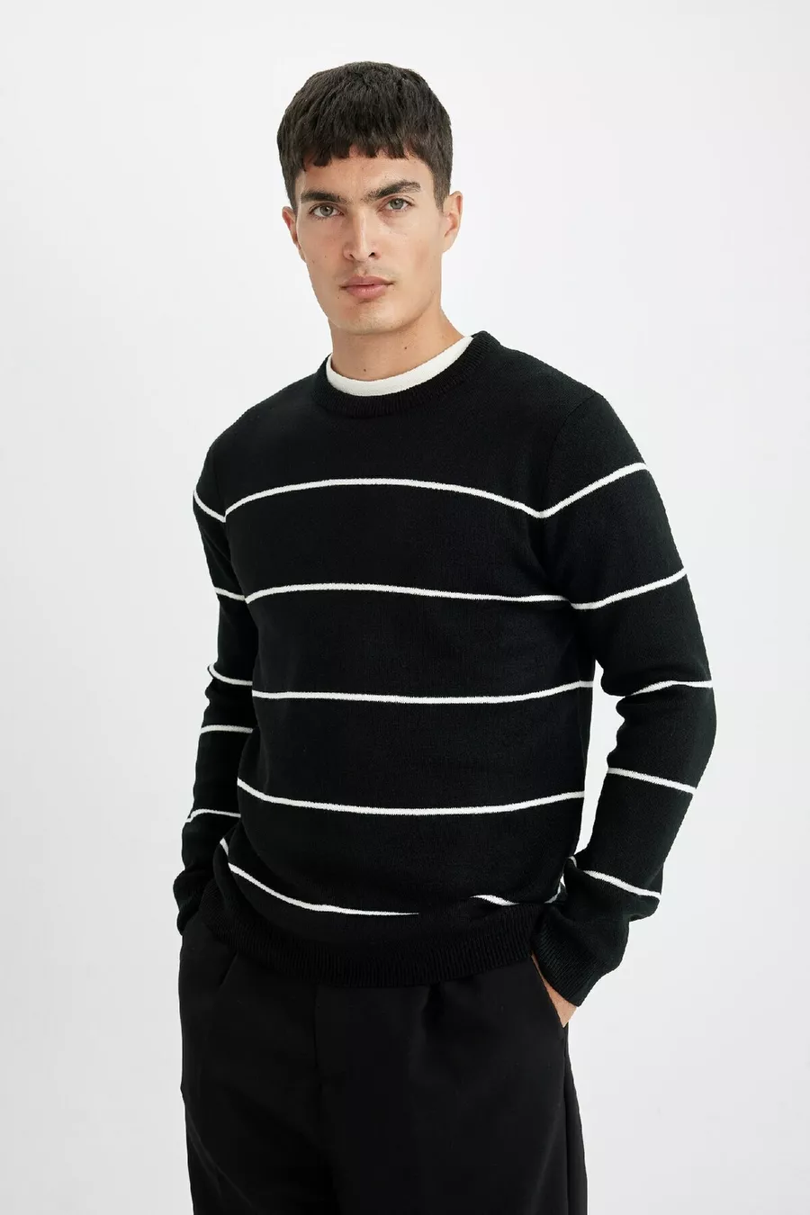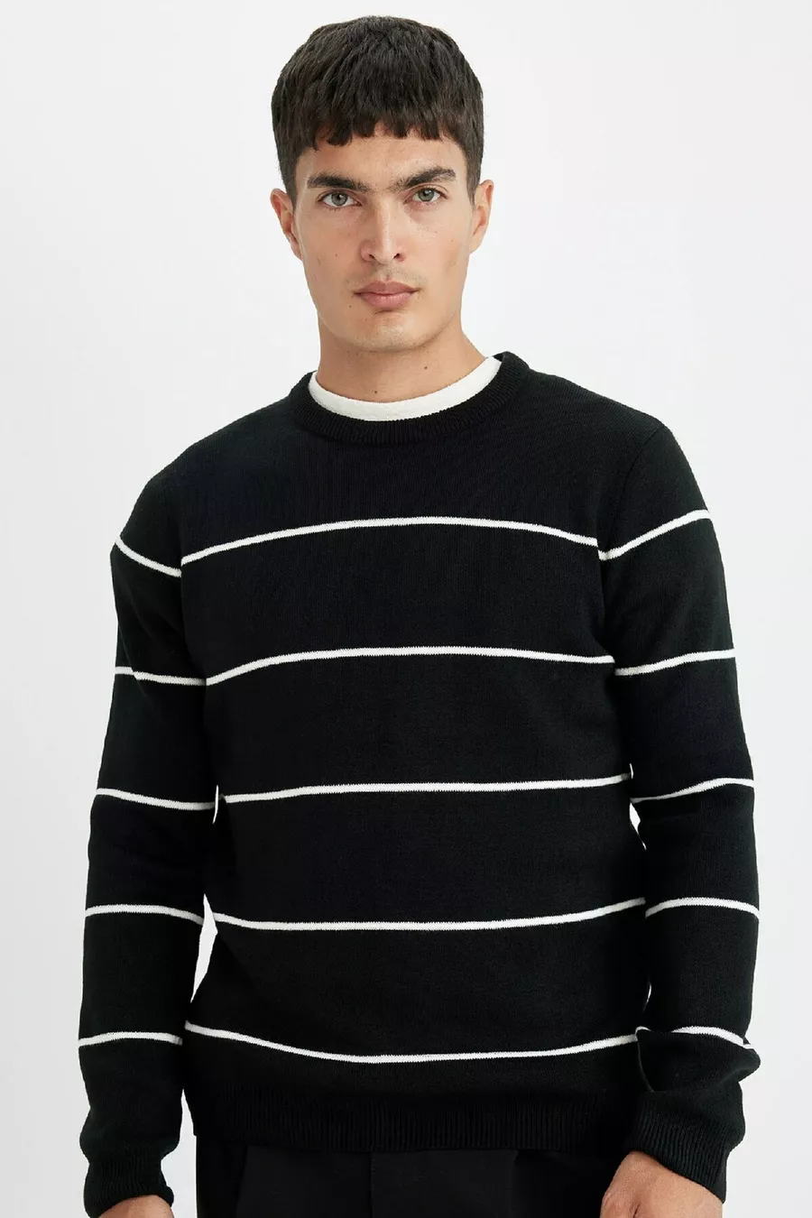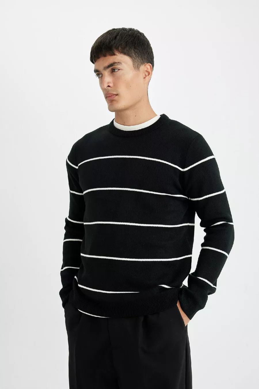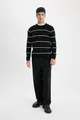 كنزة صوف مخططة بياقة دائرية، قصة عادية، مقاس قياسي wn
