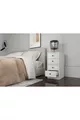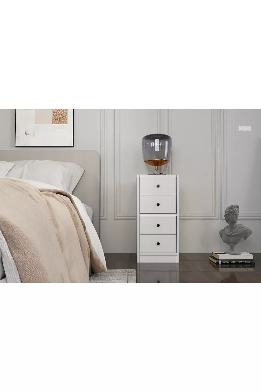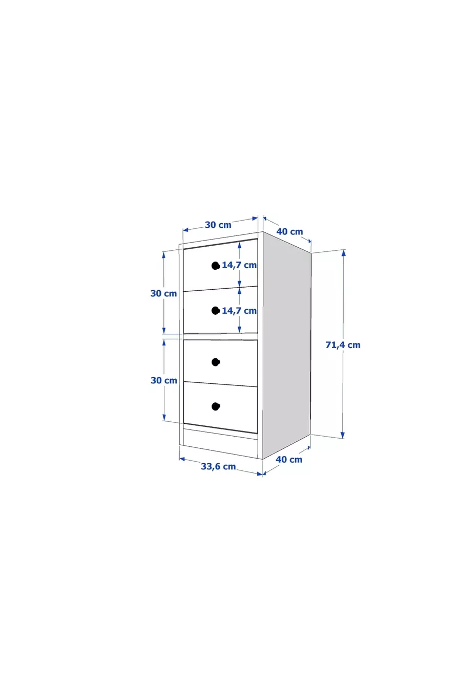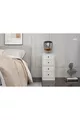 المادة: سنطلام اللون: أبيض عدد الأدراج: 4 الارتفاع: 71 سم العرض: 40 سم العمق: 33 سم الطراز: إسكندنافي الموضوع / الطراز: إسكندنافي الميزة: يحتوي على أدراج