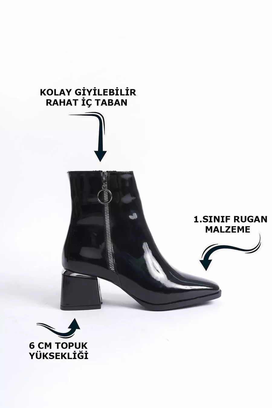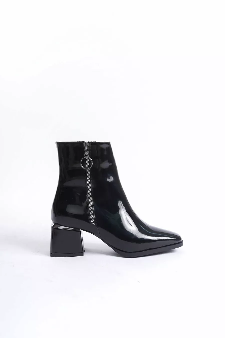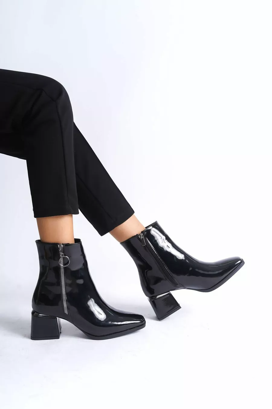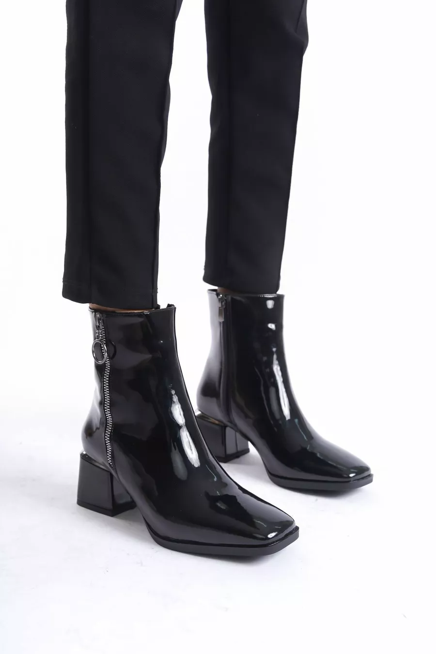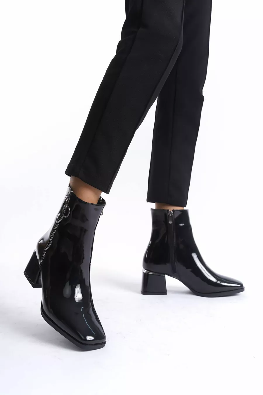 لامعة براءات الاختراع والجلود الأسود سستة كعب الفضة مفصلة قصيرة بسيطة الأحذية الكلاسيكية التمهيد