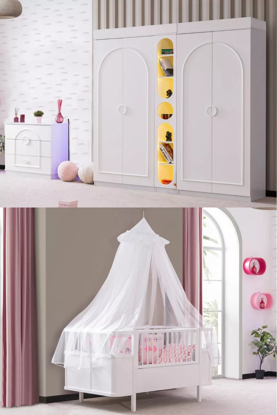 مجموعة غرفة نوم الأطفال دولوناي، خزانة دولاب بأربعة أبواب دولوناي، سرير أطفال ستار القابل للتمدد، كومودينو، مكتبة