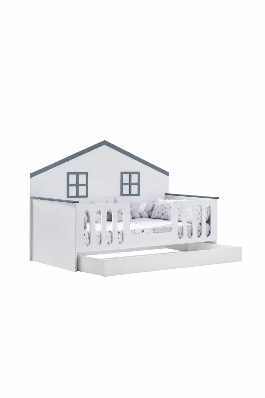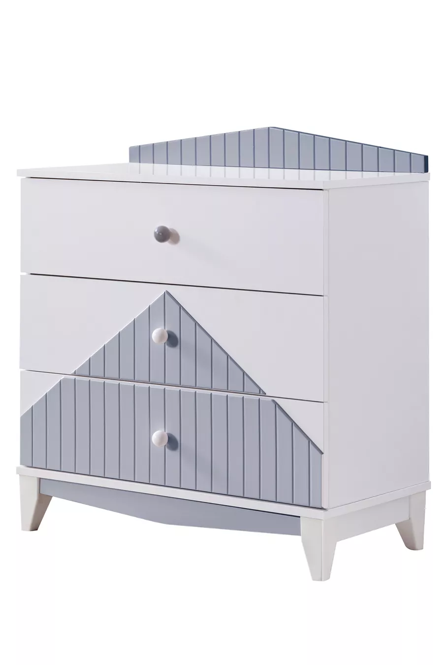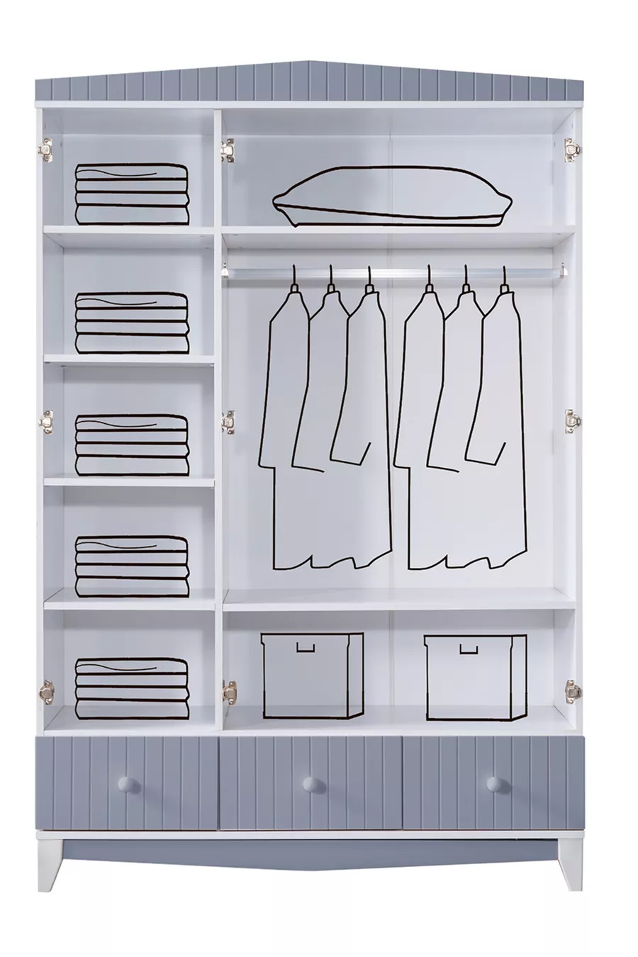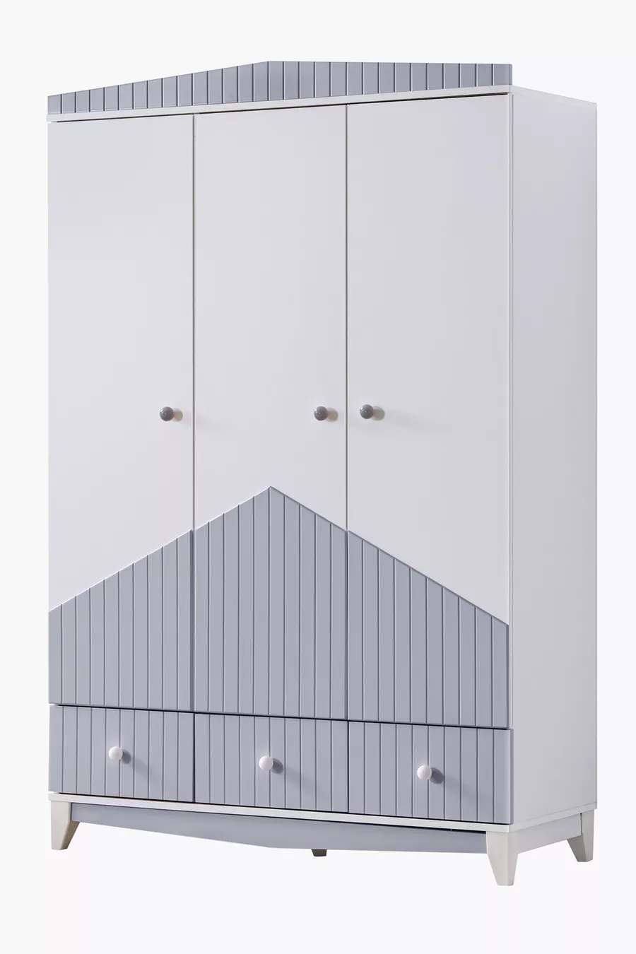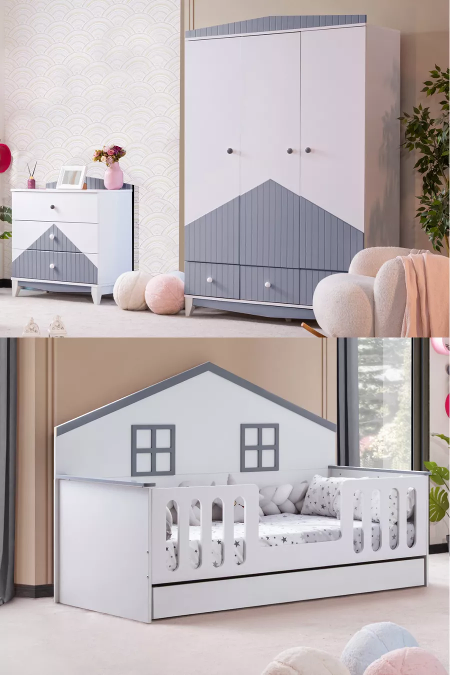 مجموعة غرفة نوم بيلو للأطفال، سرير بيلو مع درج للأطفال، خزانة فاتيحية بثلاثة أبواب، كومود - رمادي