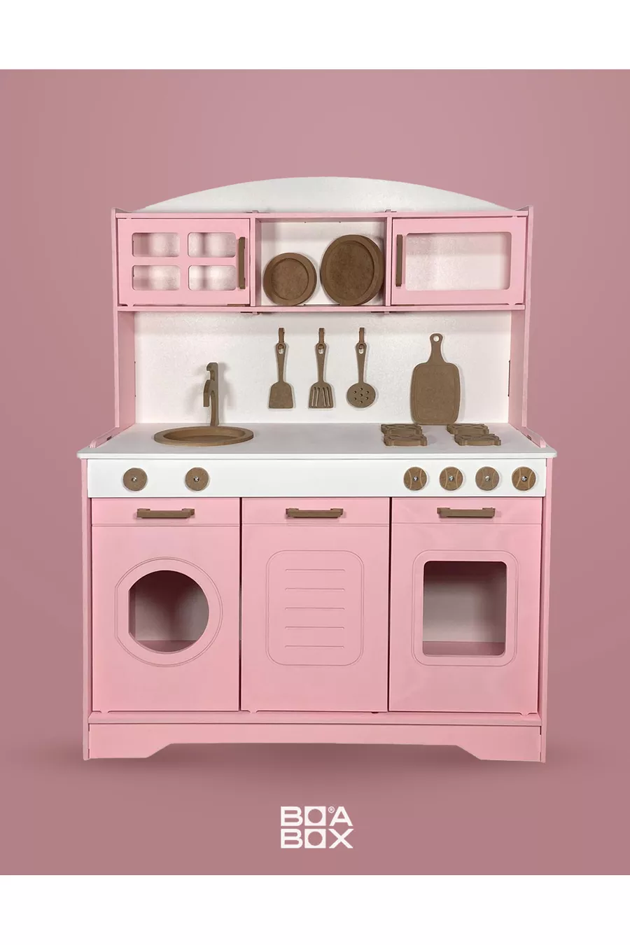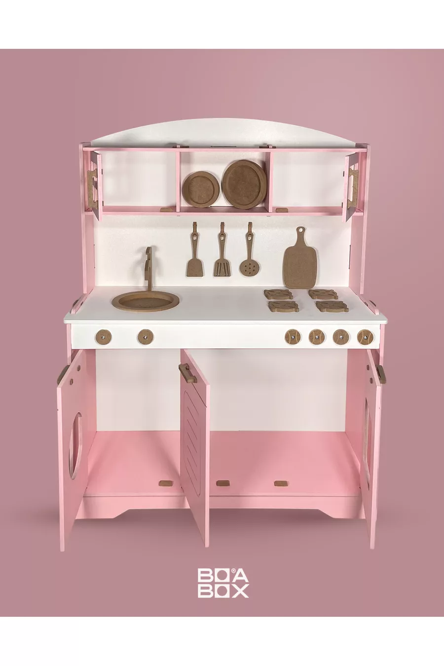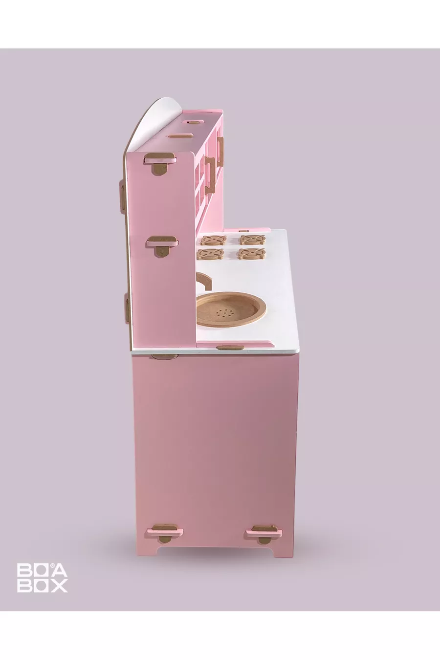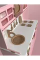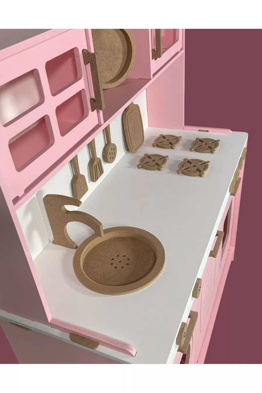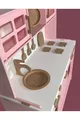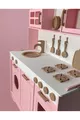 مطبخ خشبي للألعاب. دمية وردية. مطبخ تعليمي خشبي
