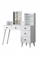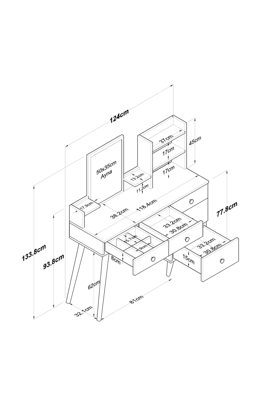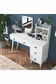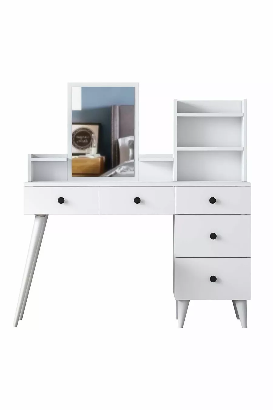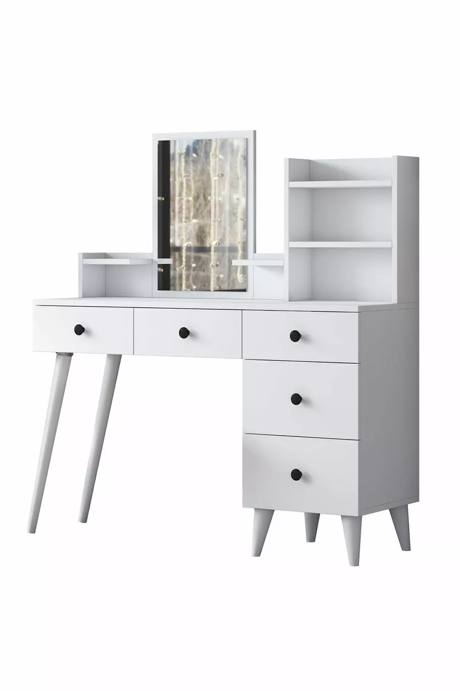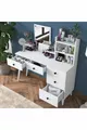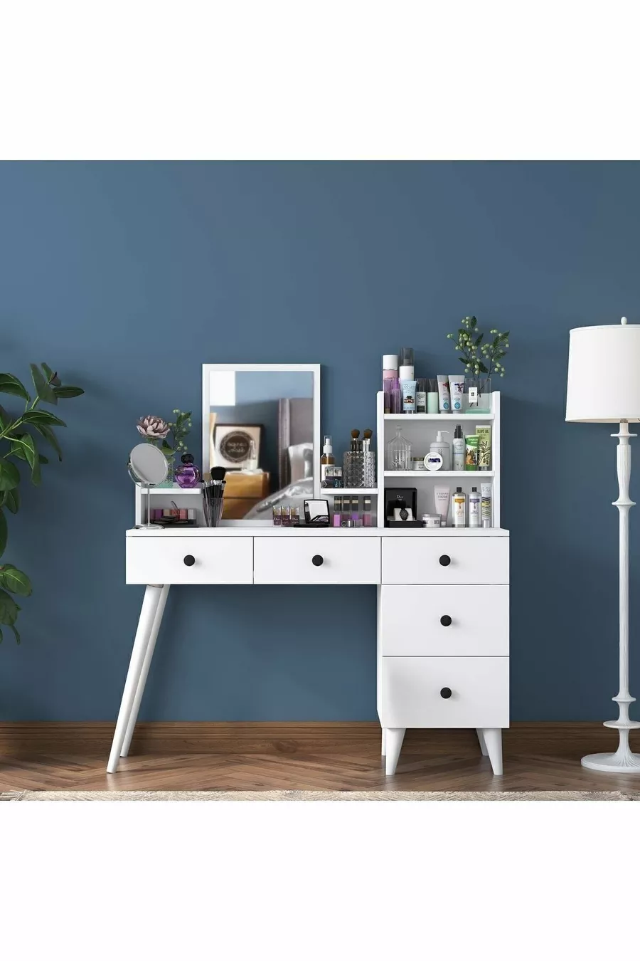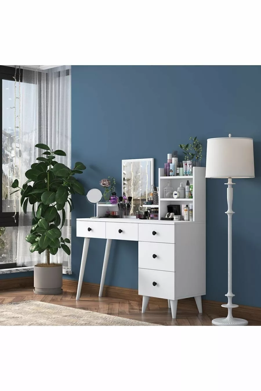 مكينة مكياج بأرفف وخمس أدراج مرآة ومنظم مجوهرات باللون الأبيض