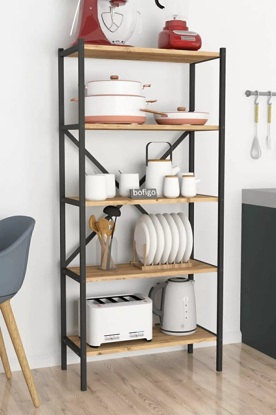 منظم مطبخ معدني مكون من 5 رفوف، رف معدني للمطبخ، رف للميكروويف، حاملة توابل، خشب الصنوبر