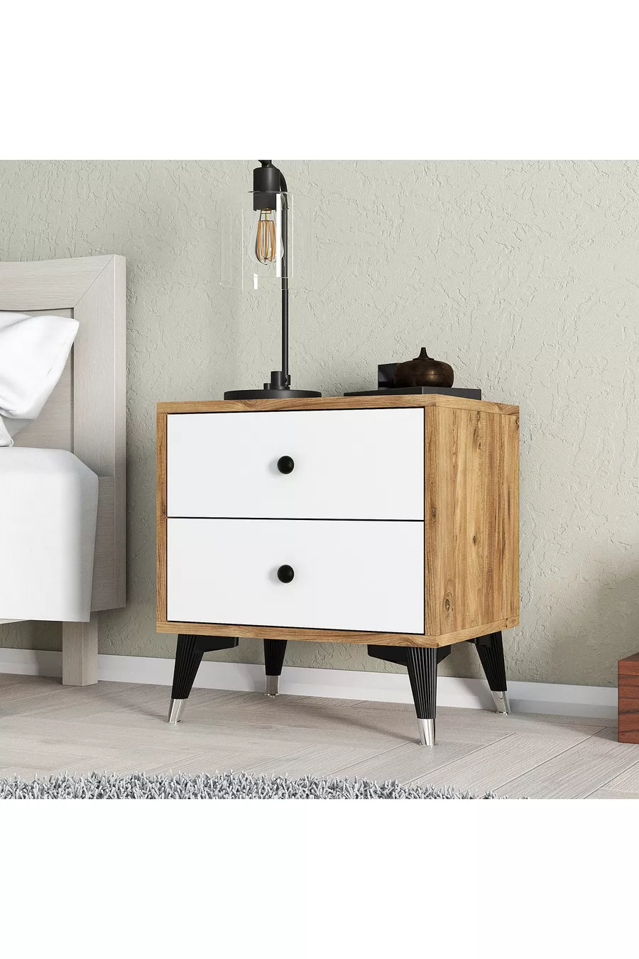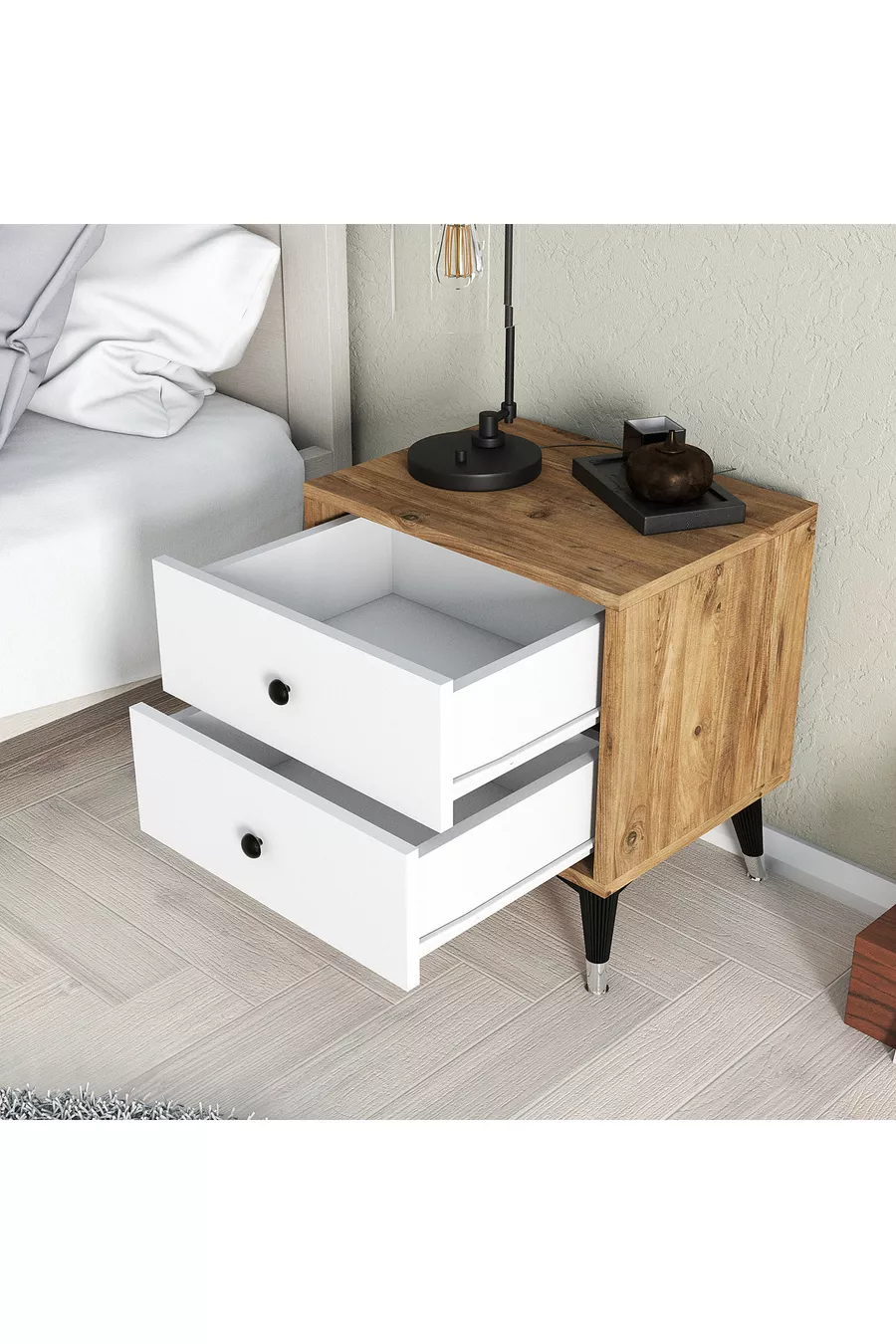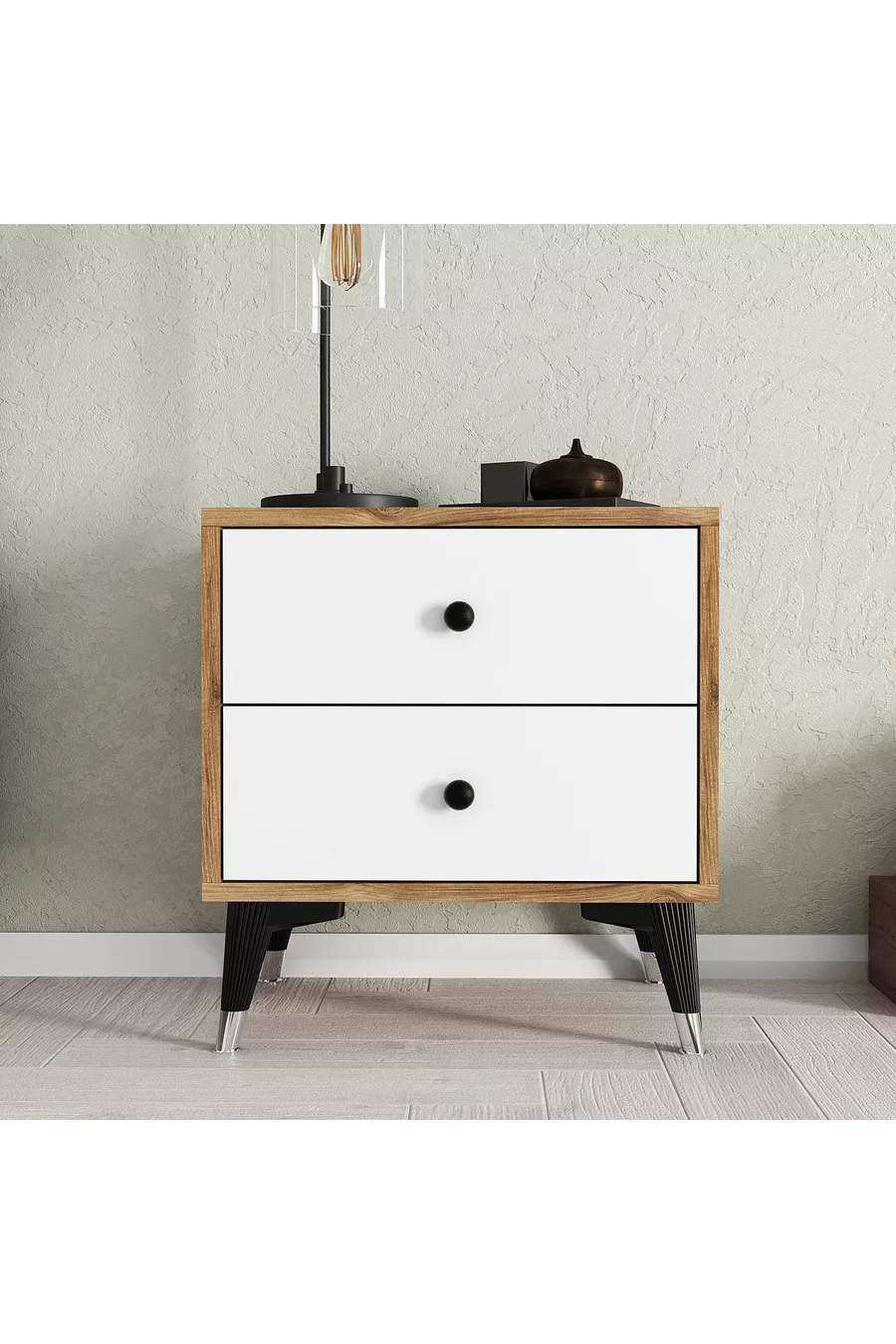 المادة: صنطالام اللون: بني مدة الضمان: سنتان عدد الأدراج: 2 الارتفاع: 51 سم العرض: 50 سم العمق: 45 سم النمط: إسكندنافي الموضوع / النمط: إسكندنافي الميزة: مزود بأدراج