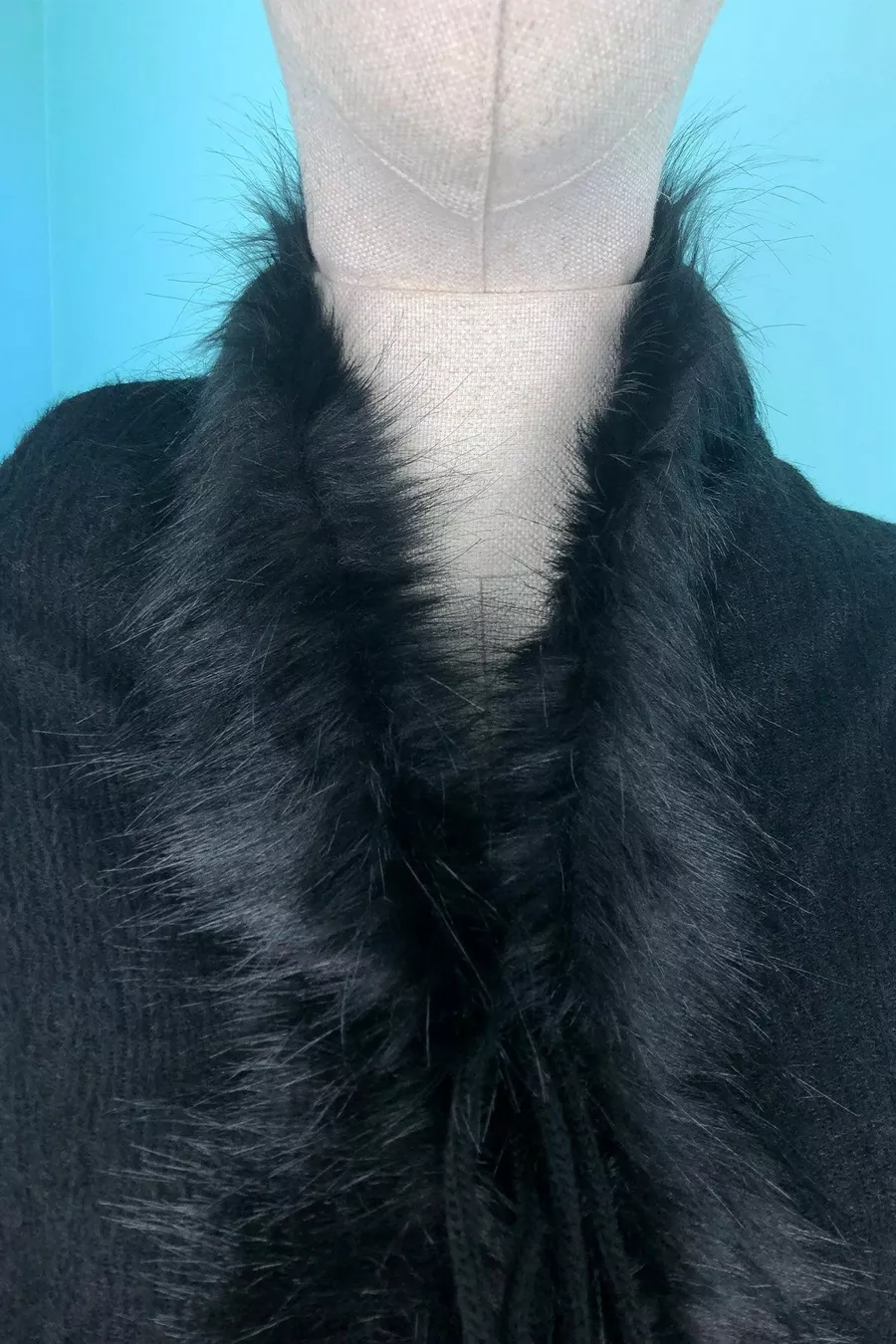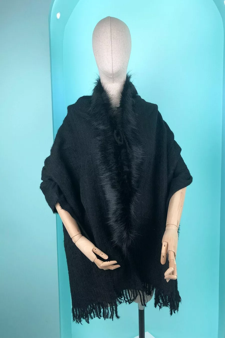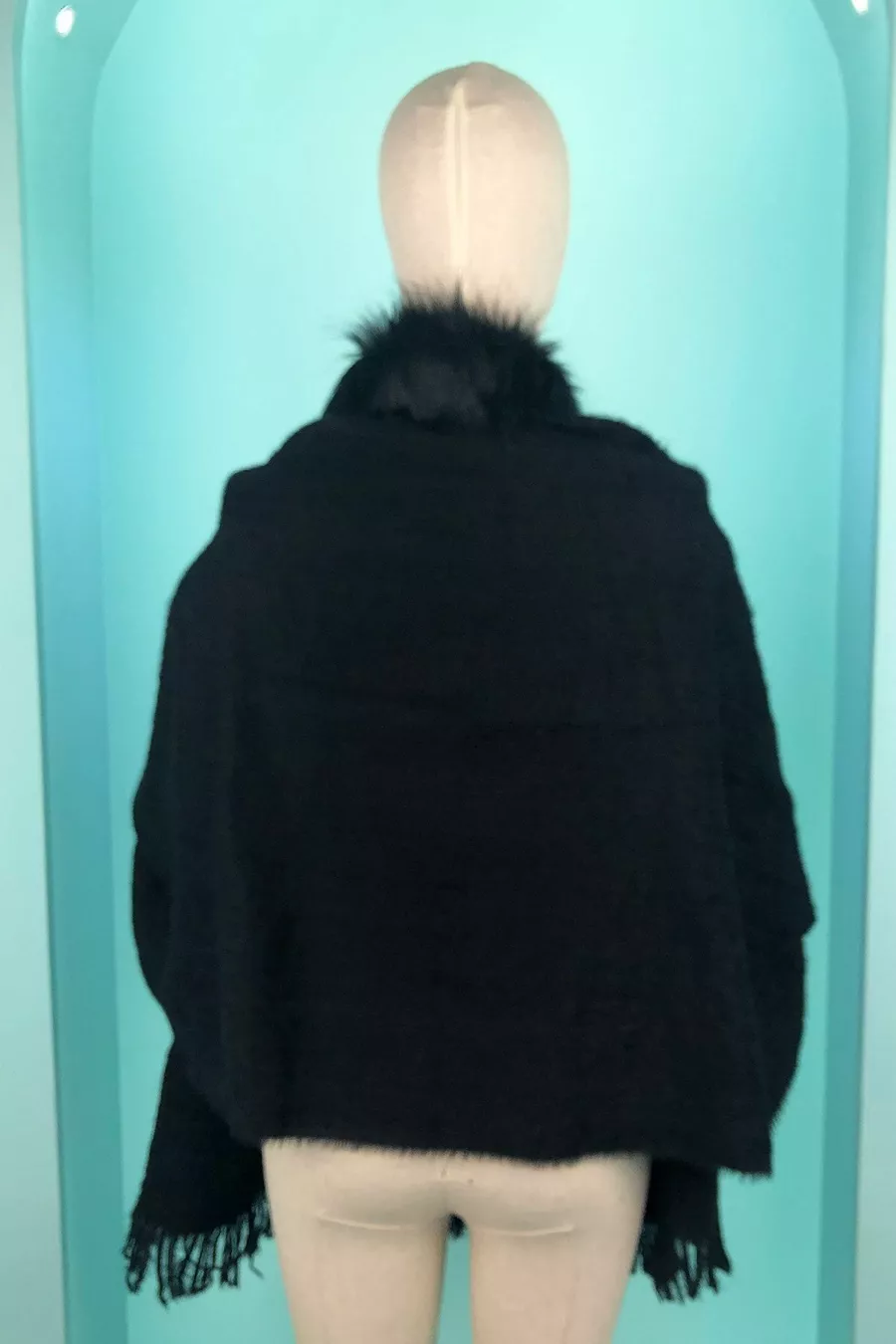 وشاح شتوي نسائي أسود سميك للكتف من صوف حقيقي مع فرو صناعي وشراشيب