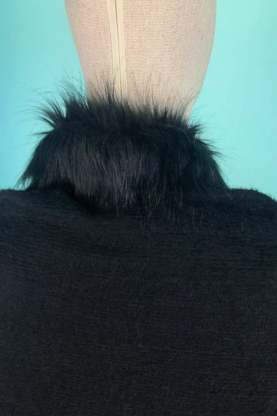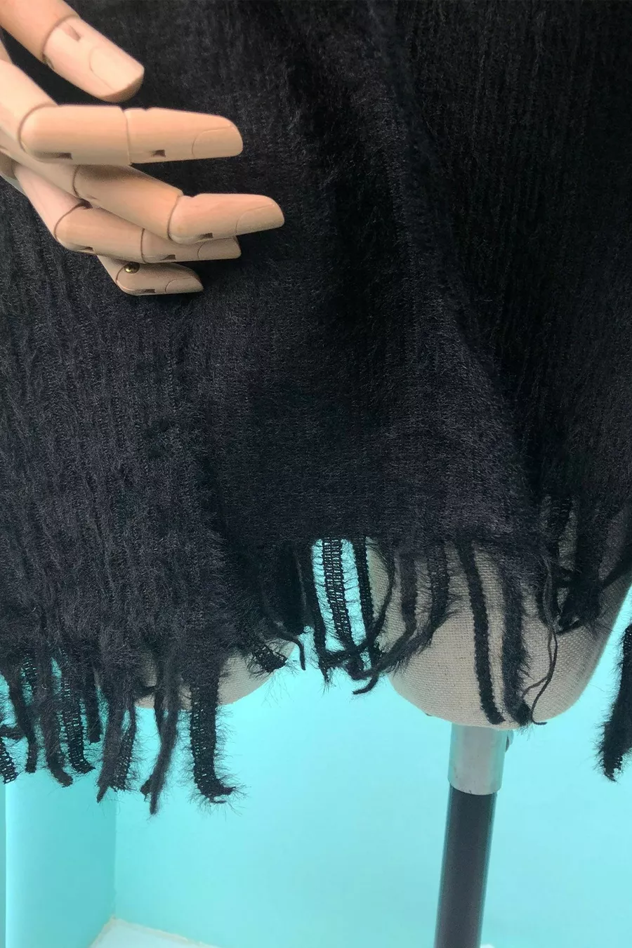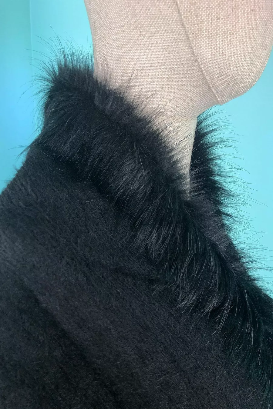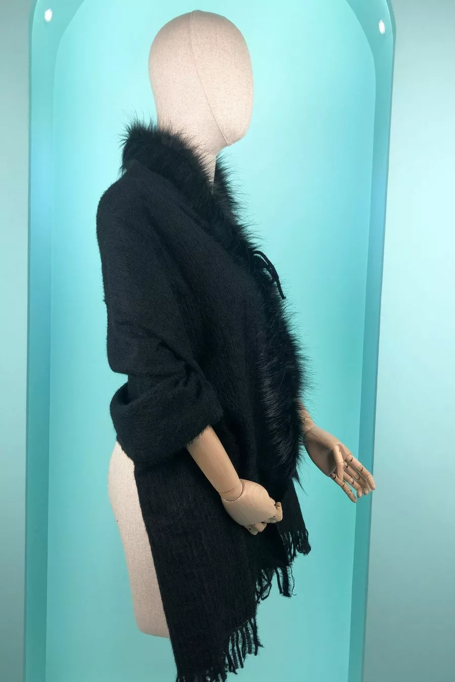 وشاح شتوي نسائي أسود سميك للكتف من صوف حقيقي مع فرو صناعي وشراشيب