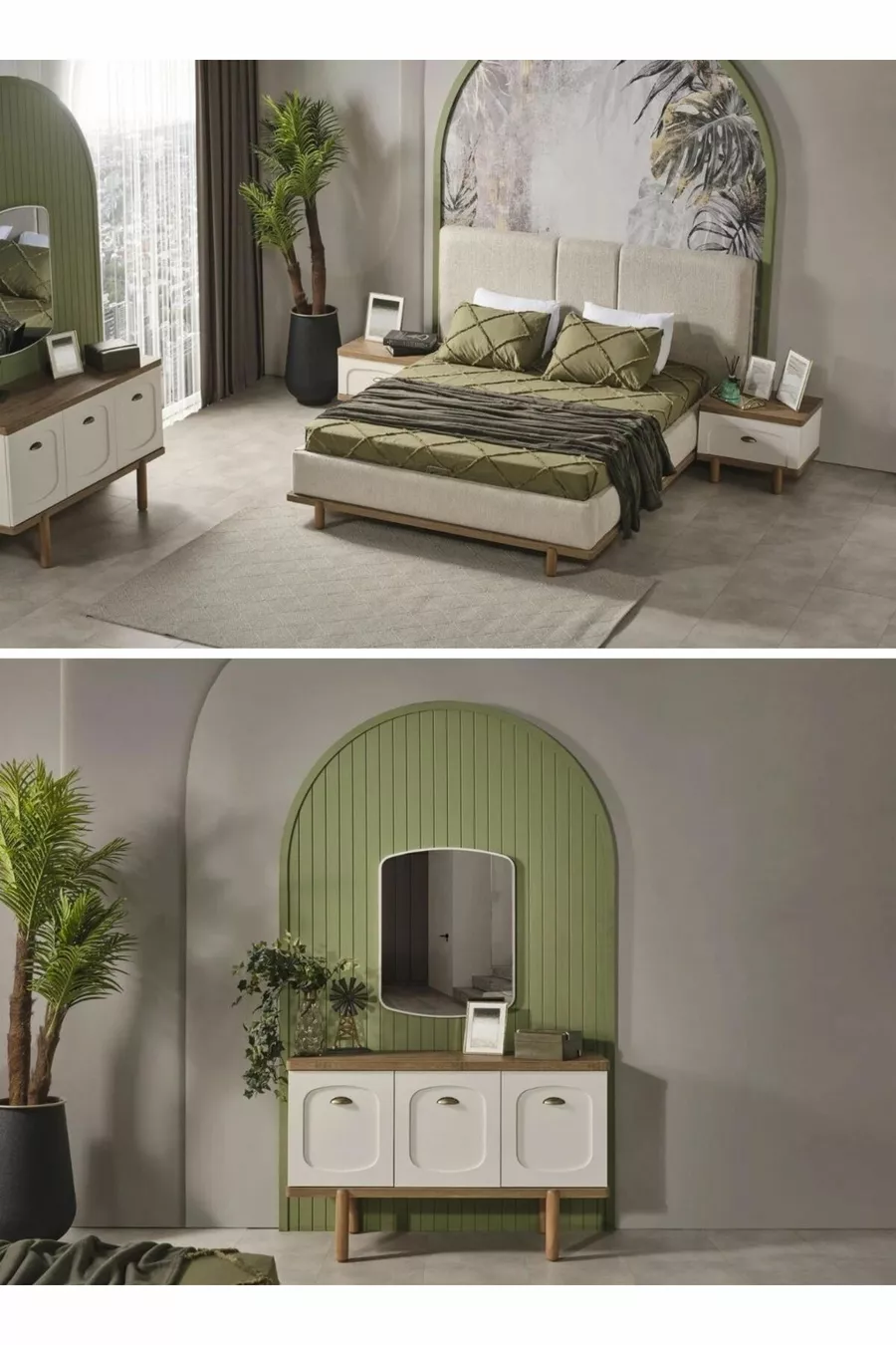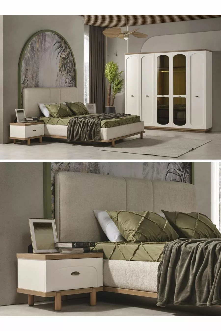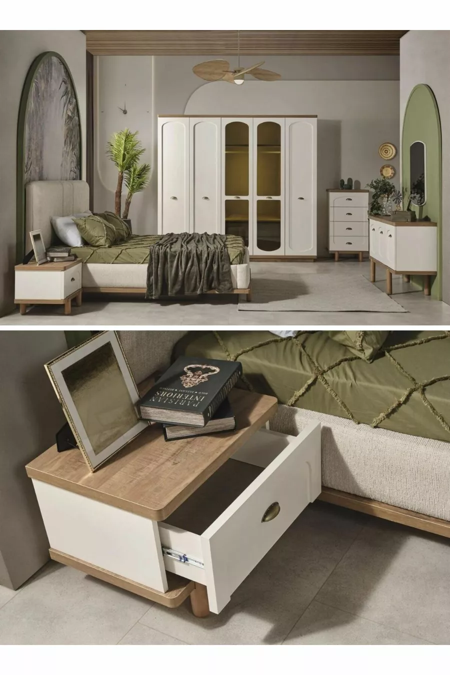Съдържание на комплекта: Легло + 2 нощни шкафчета + скрин + гардероб + огледало