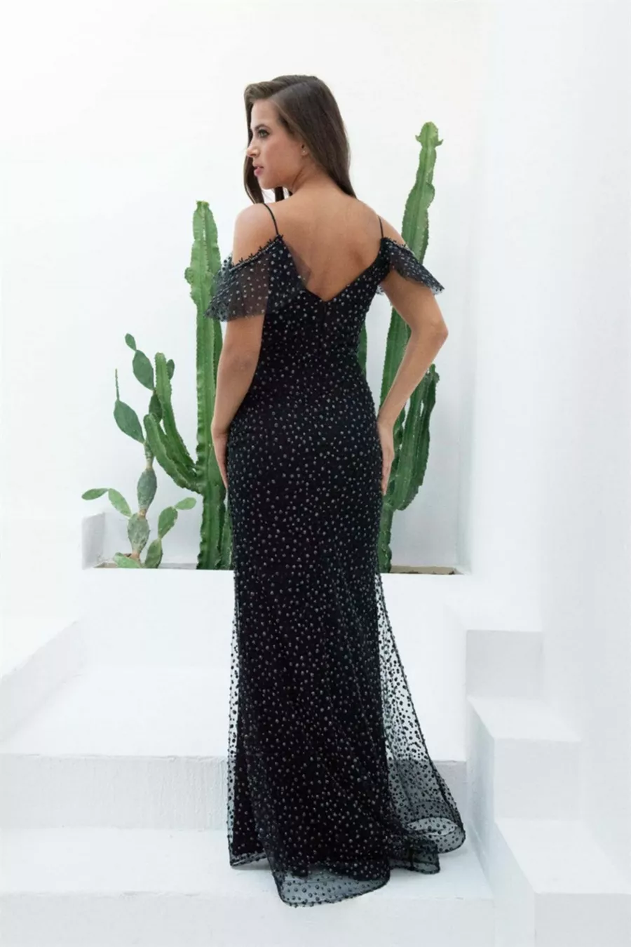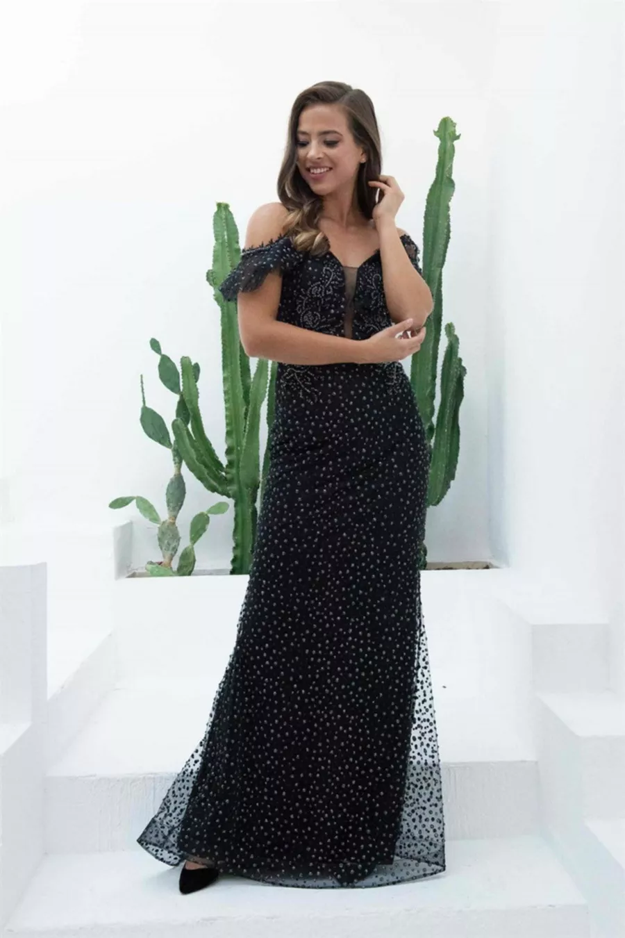 Дамска вечерна рокля извън рамото черно