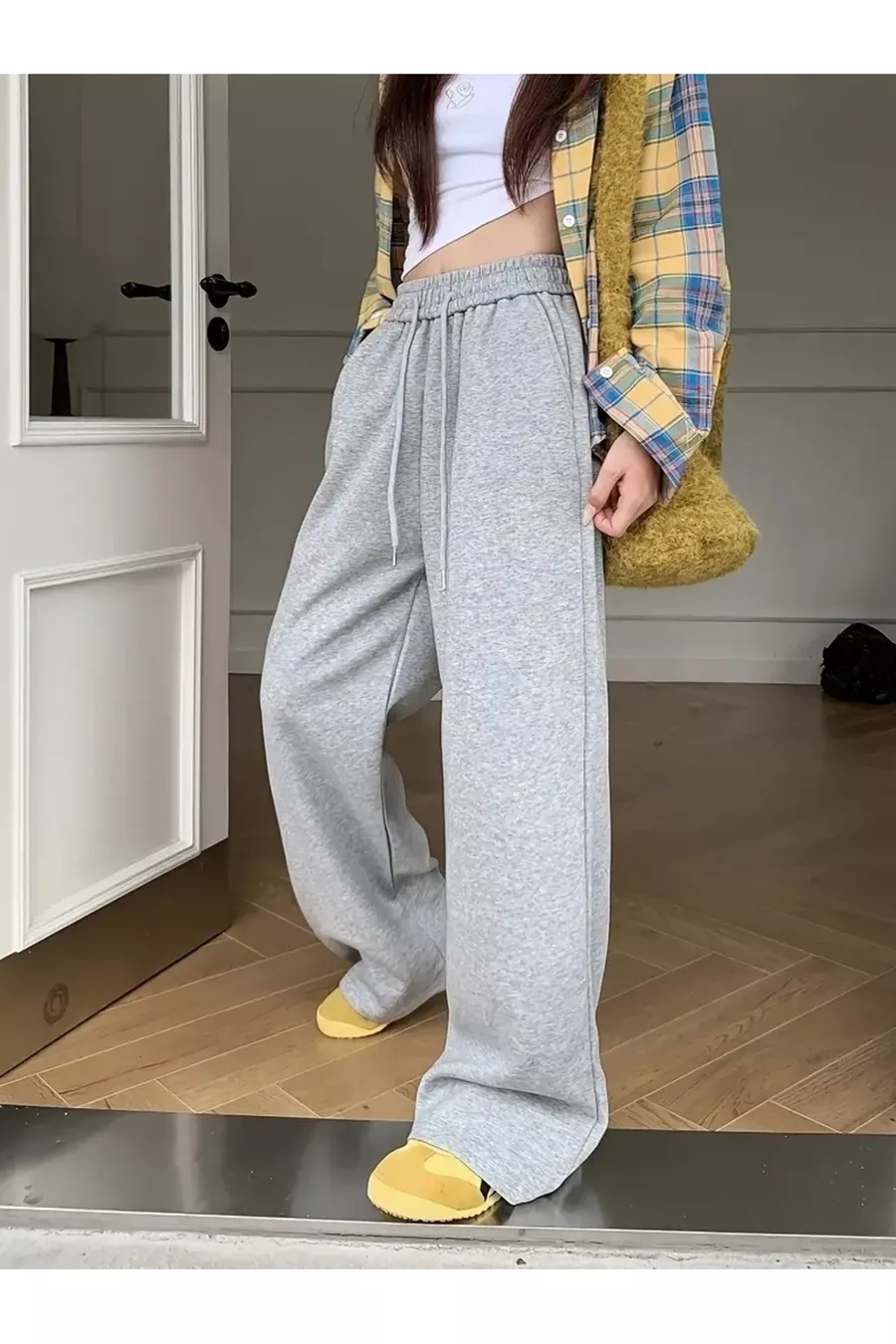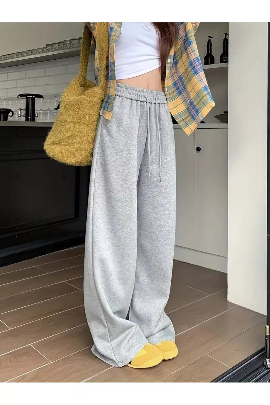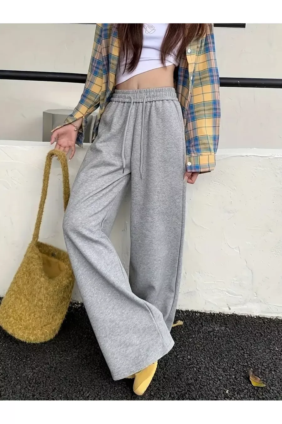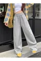 Дамски сив широк спортен панталон в голям размер, качествен, свободен, еластичен и удобен материал