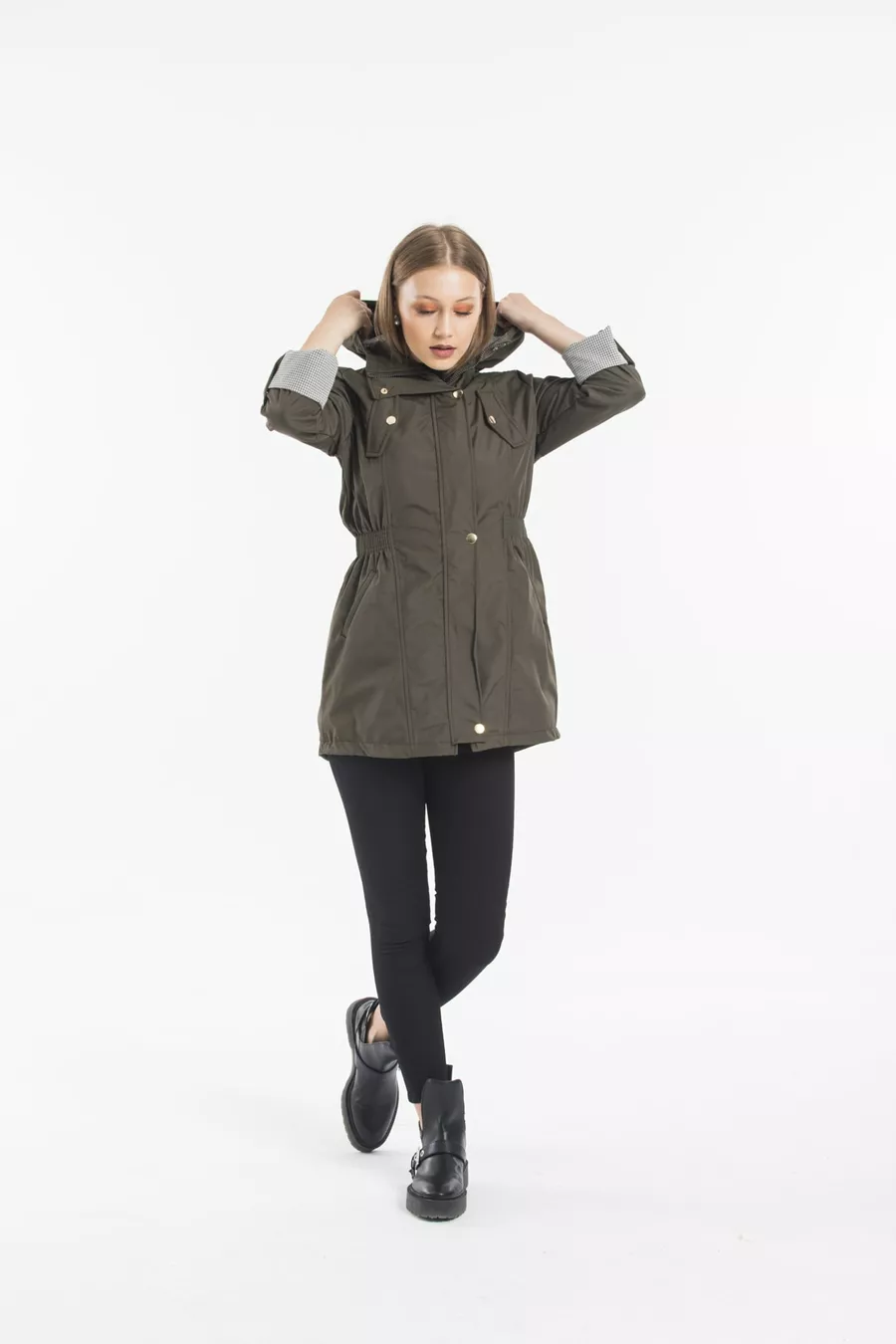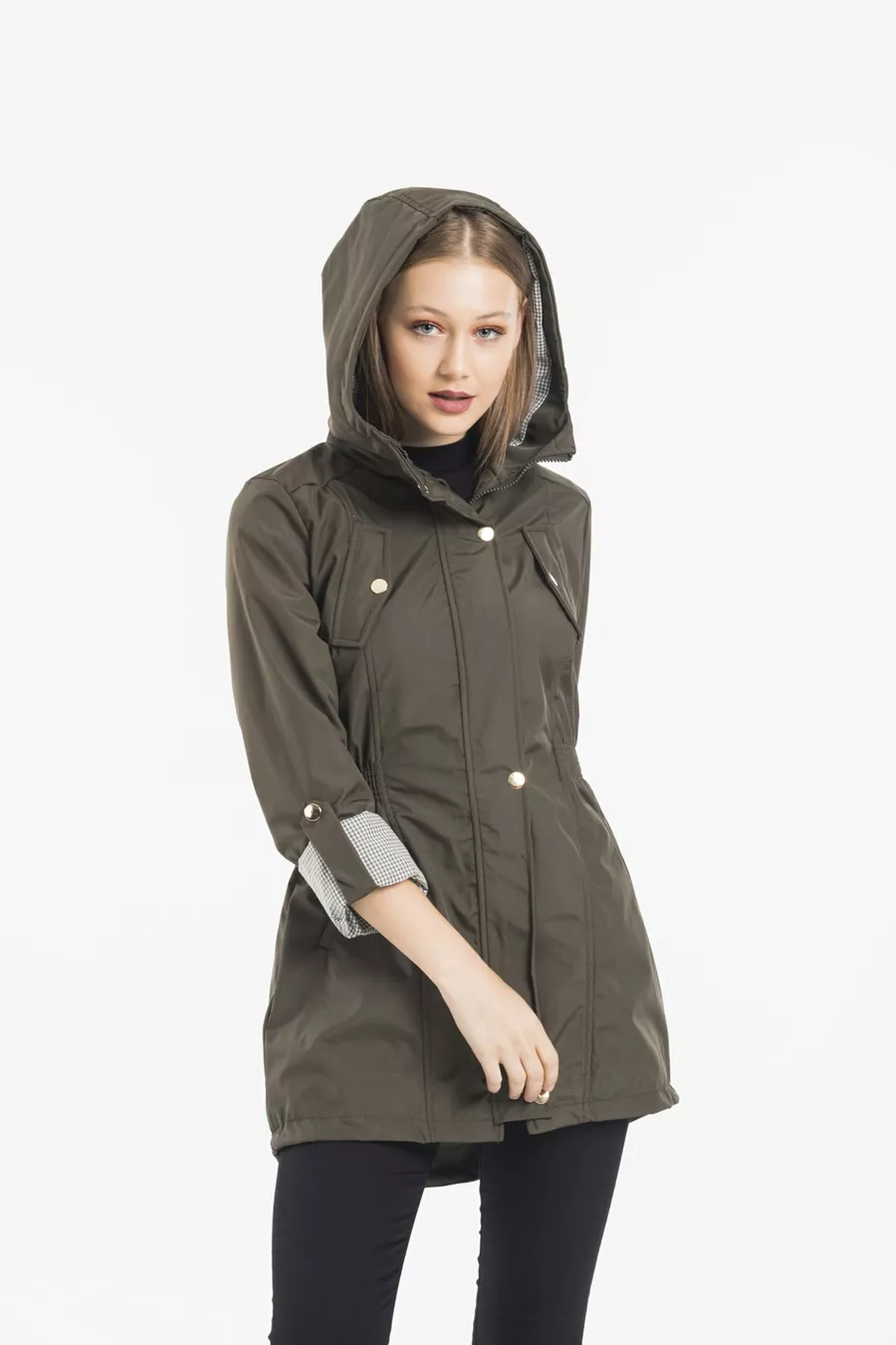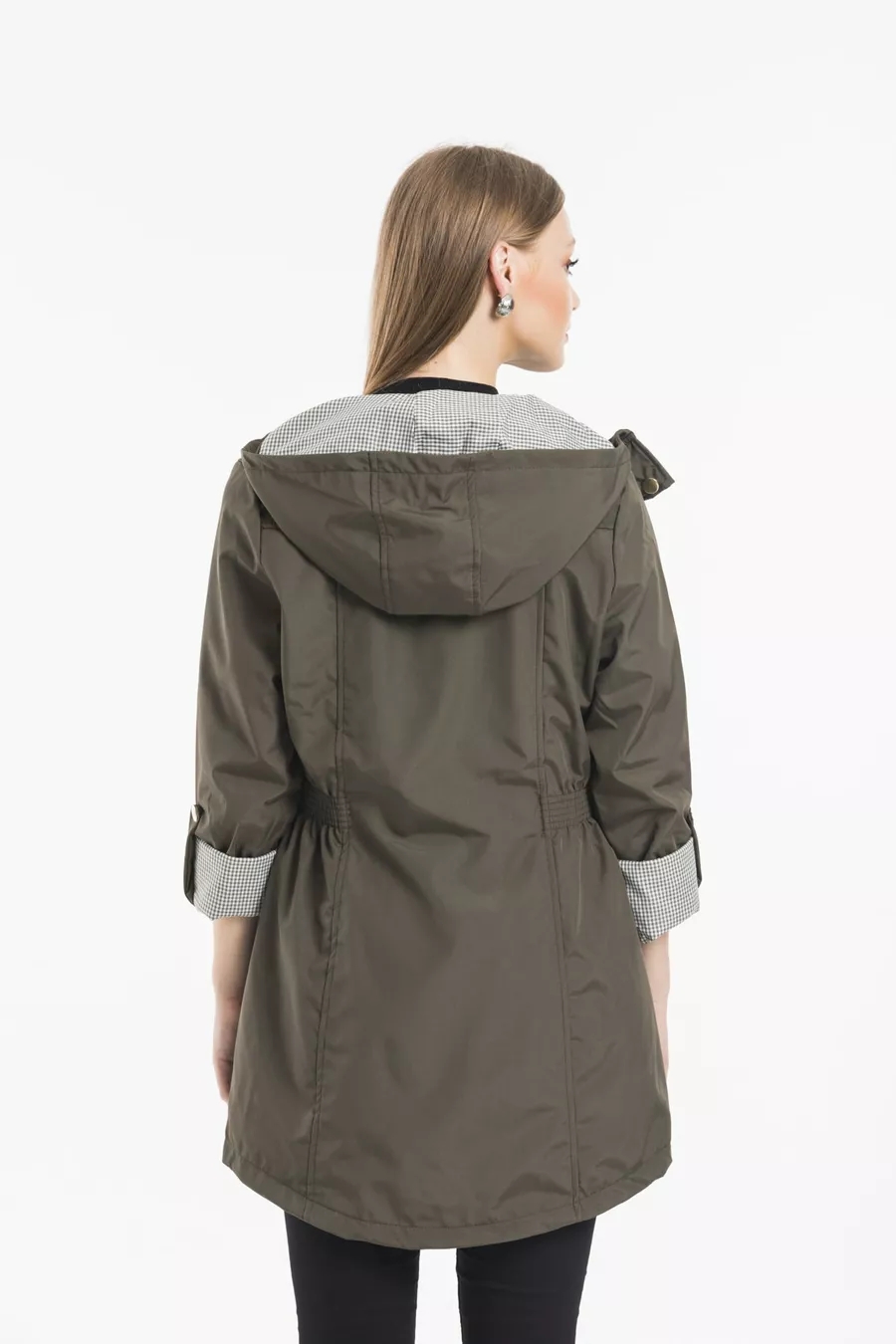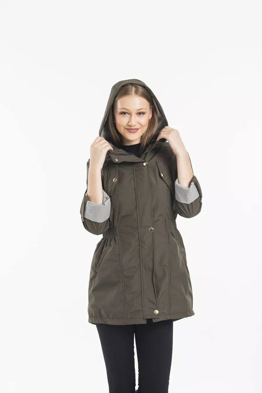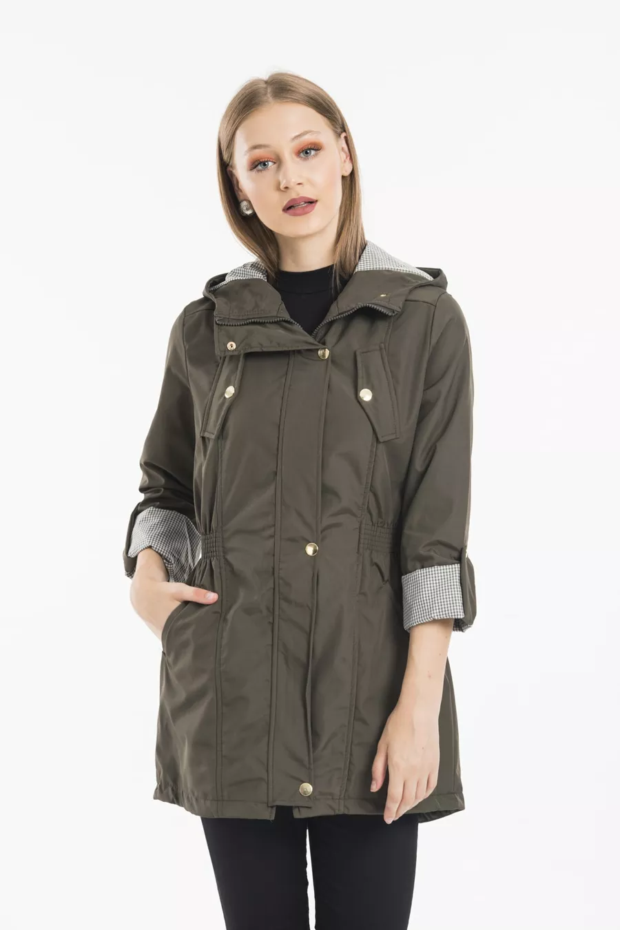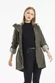 Дамски хакi тренч с качулка, с ластик на талията и подплатени ръкави, сгъваем