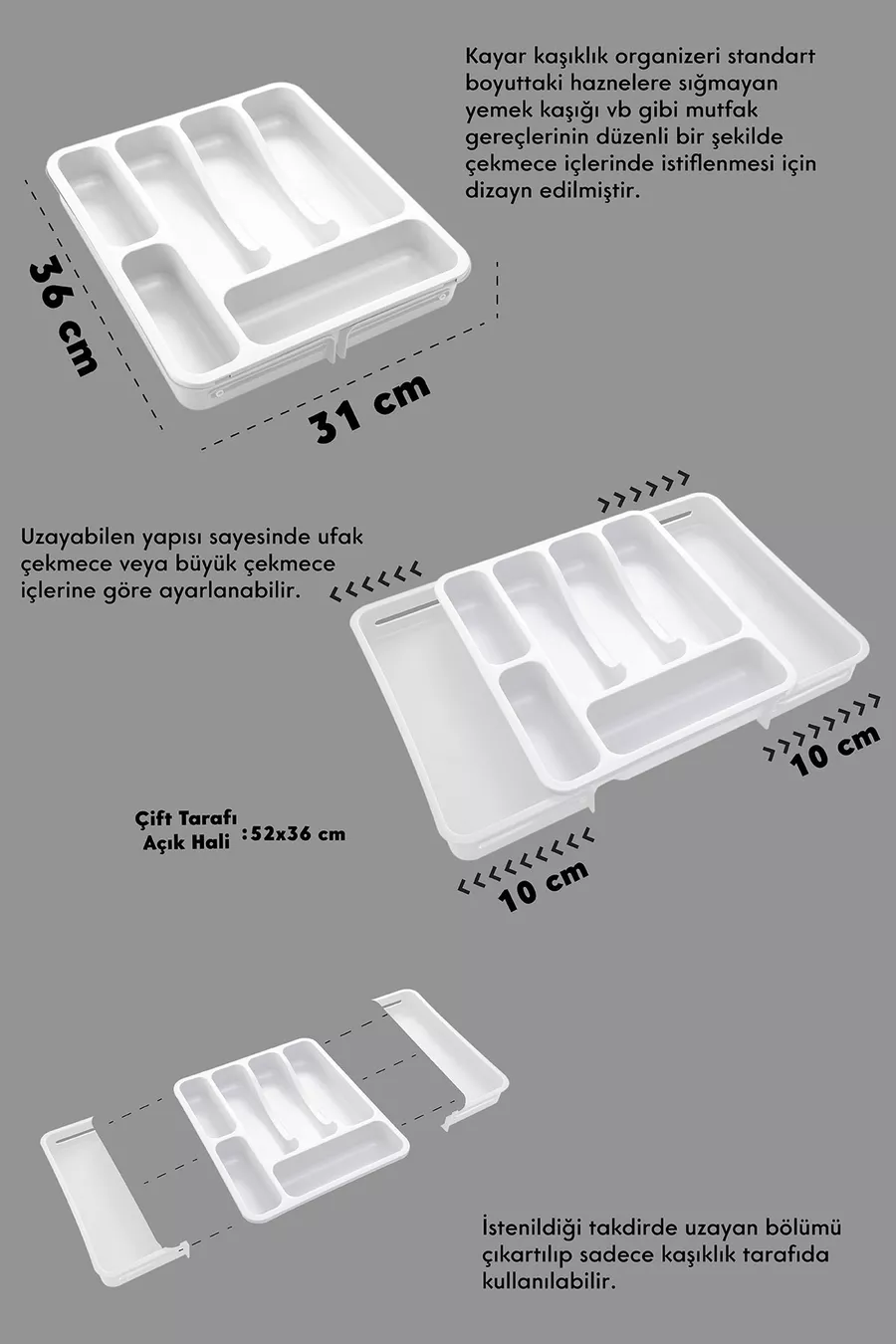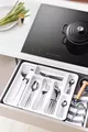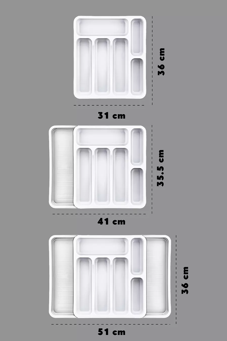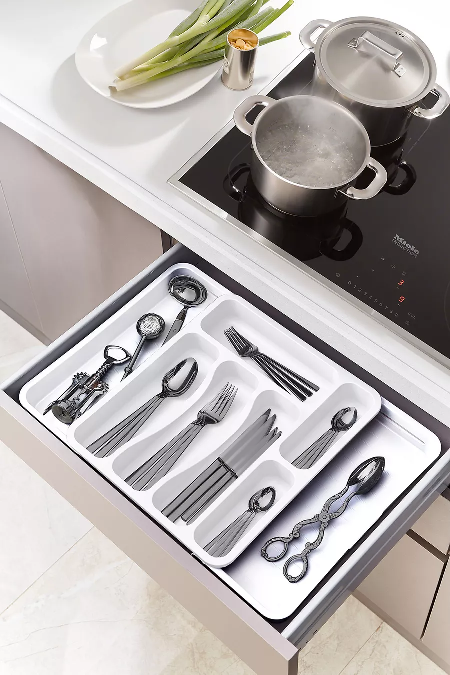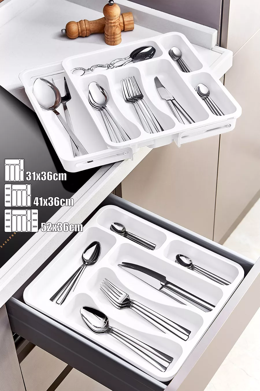 Двустранен разтегателен, регулируем органайзер за лъжици и черпаци за чекмедже