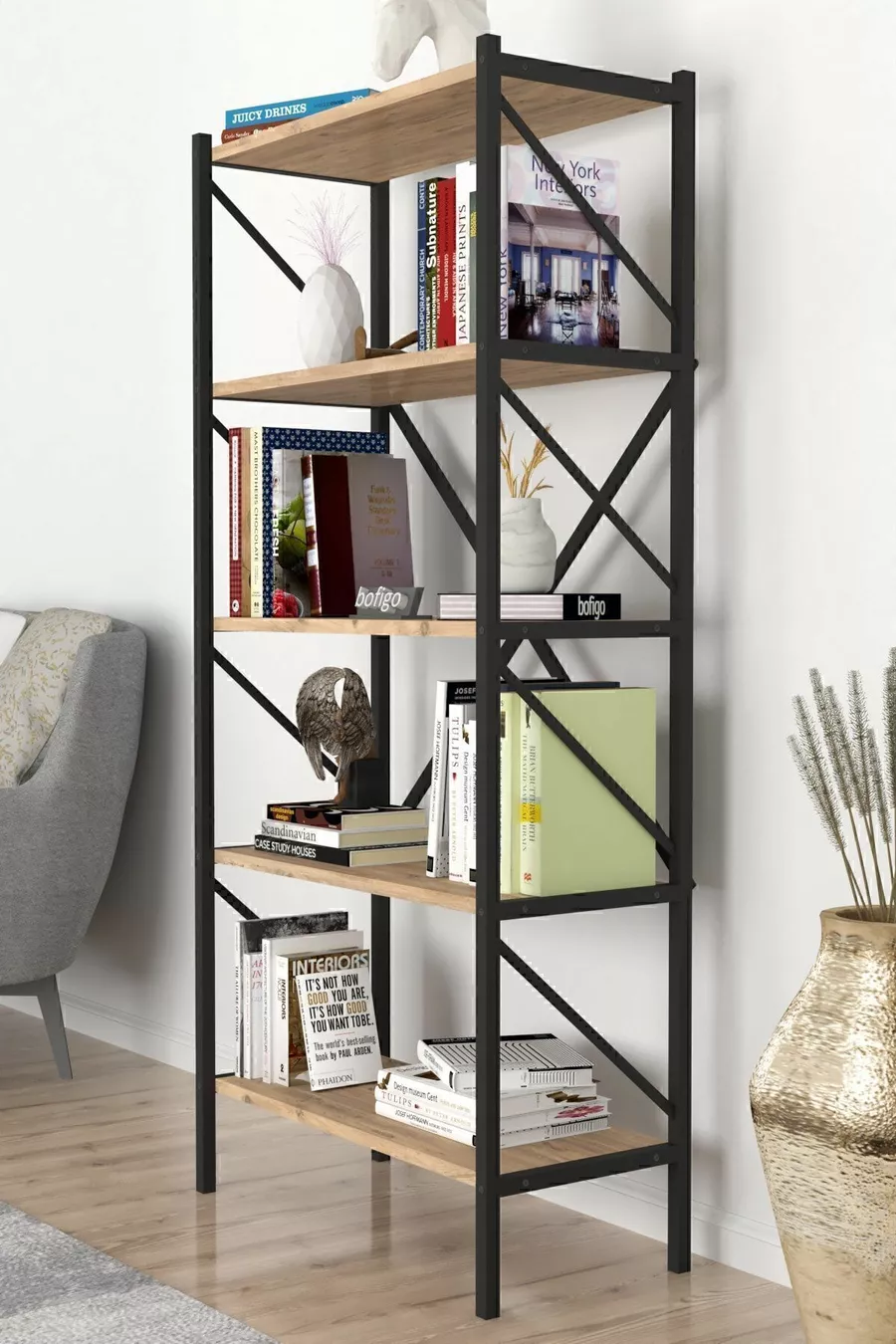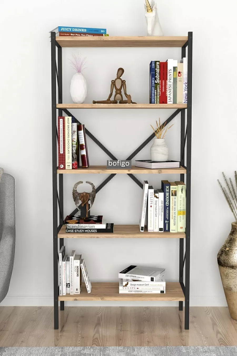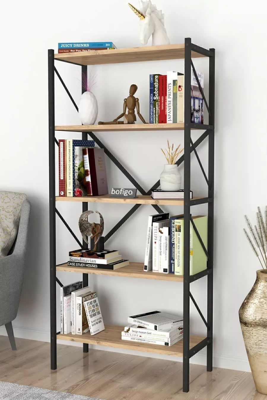 Тип: Класически Материал: ПДЧ Цвят: Кафяв Височина: 157 см Ширина: 66 см Дълбочина: 35 см Брой рафтове: 5 Материал на корпуса: Метал Стил: Модерен Тема / Стил: Модерен Произход: TR Характеристика: С рафтове