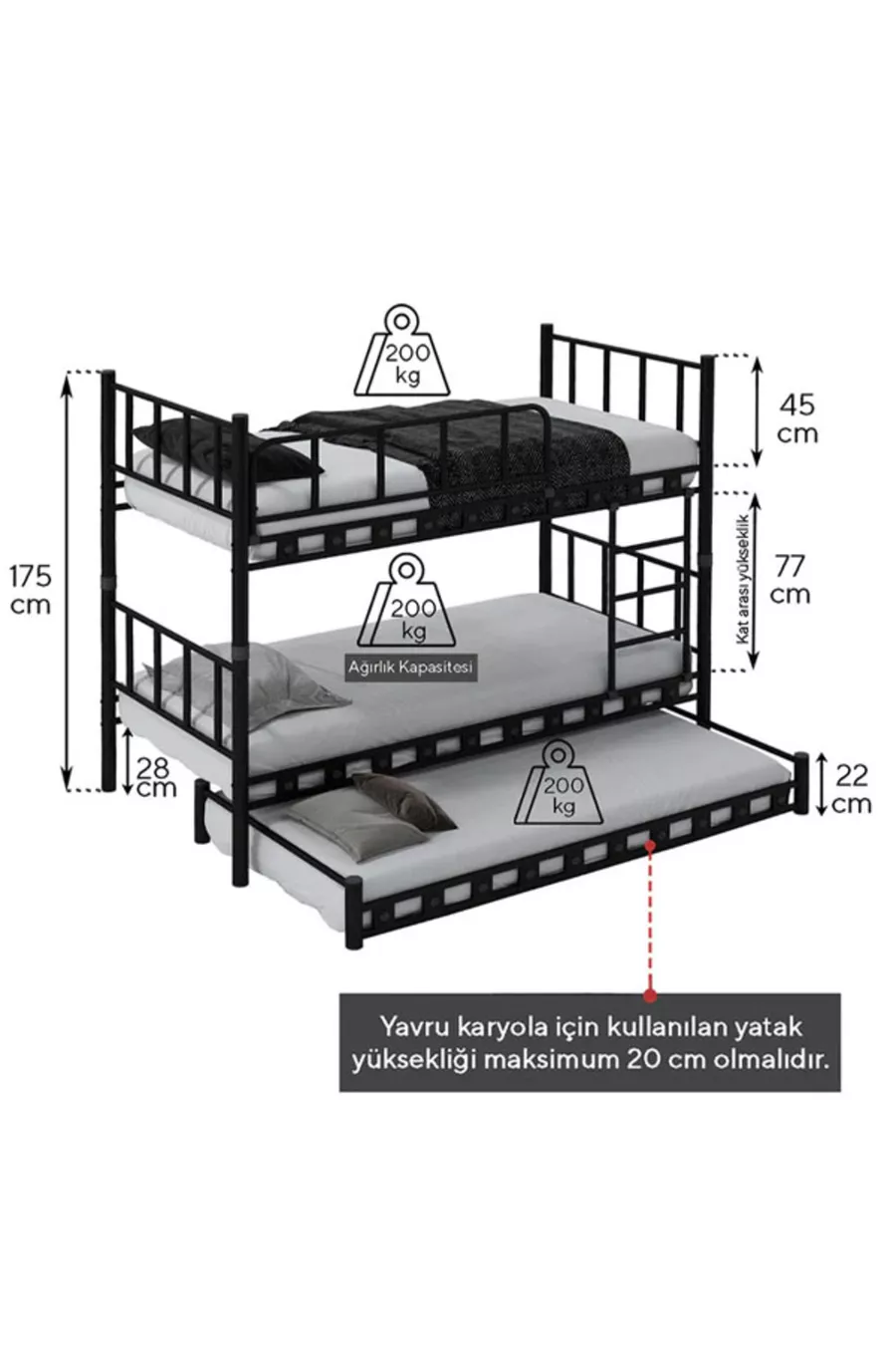 Цвят: Черен Материал: Метал Размер: Двоен Размери: 90 x 190 Гаранционен срок: 2 години Стил: Модерен Тема / Стил: Модерен С отделно легло за малки: Да Произход: TR Характеристика: С крака