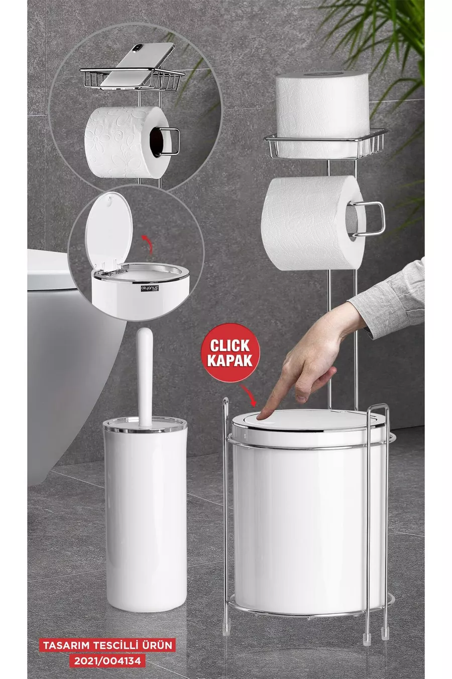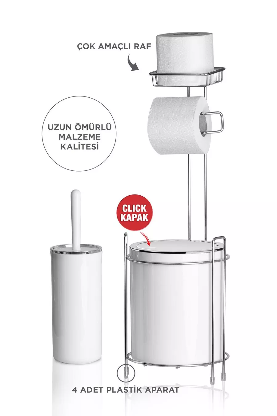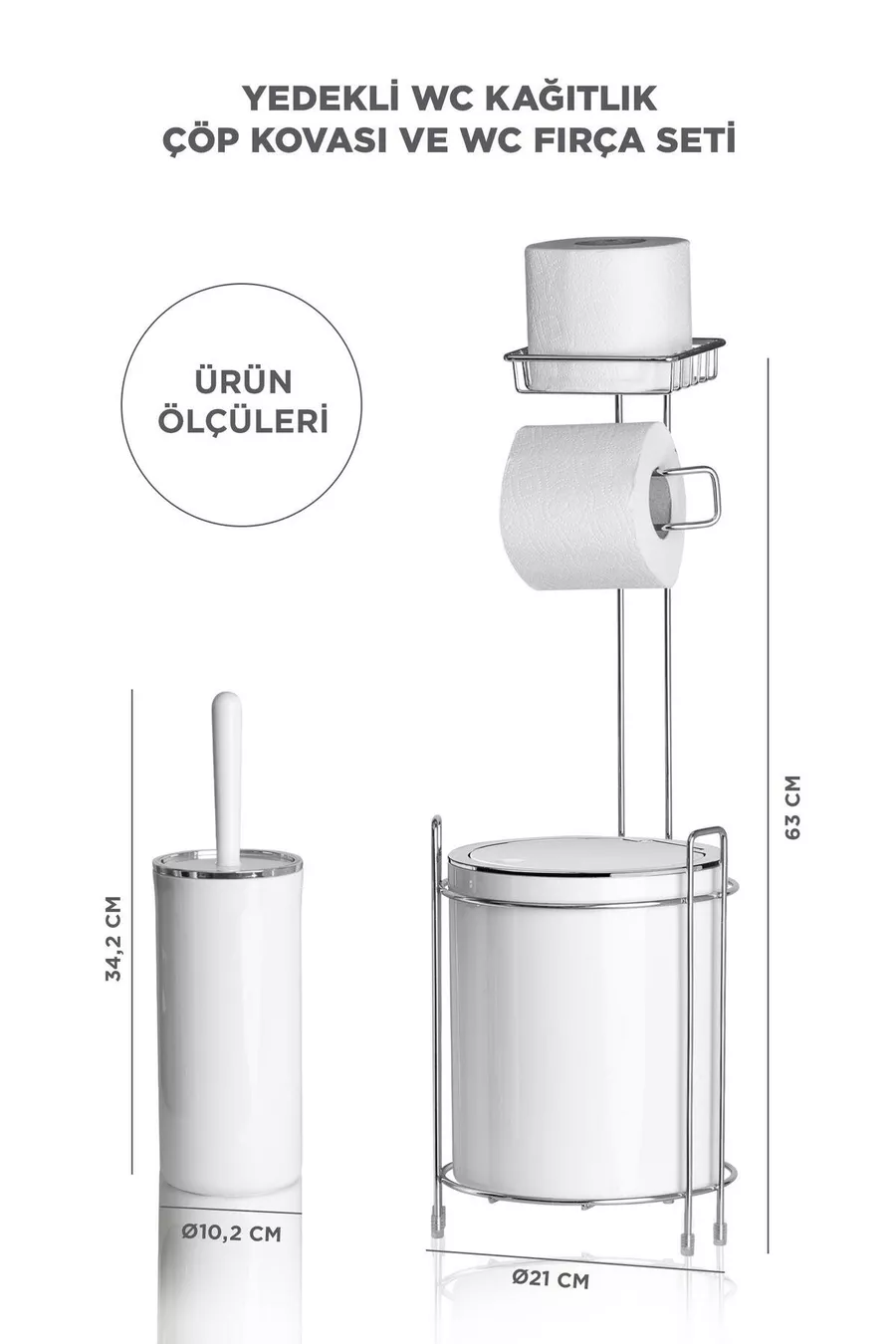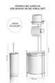 Държач за тоалетна хартия с хром и резервна ролка - кръгла бяла кофа за боклук и комплект тоалетна четка
