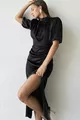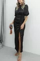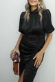 Жените черен сатен балон ръкав драпирани цепка подробни рокля