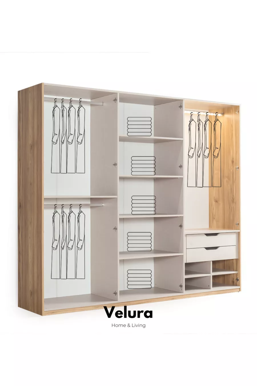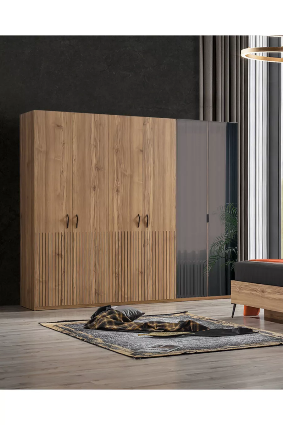 Съдържание на комплекта: Легло с основа + 2 нощни шкафчета + Скрин + Гардероб