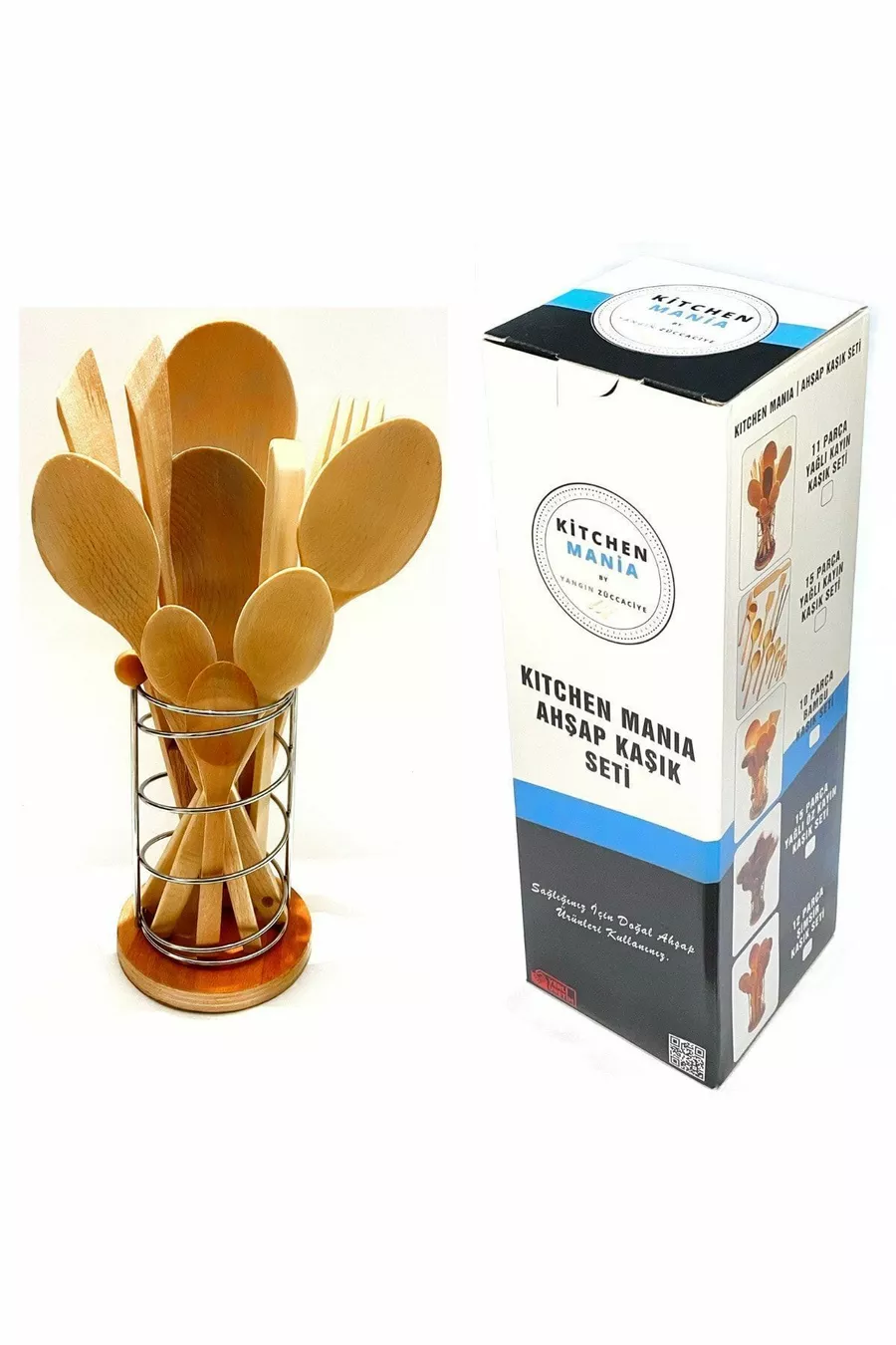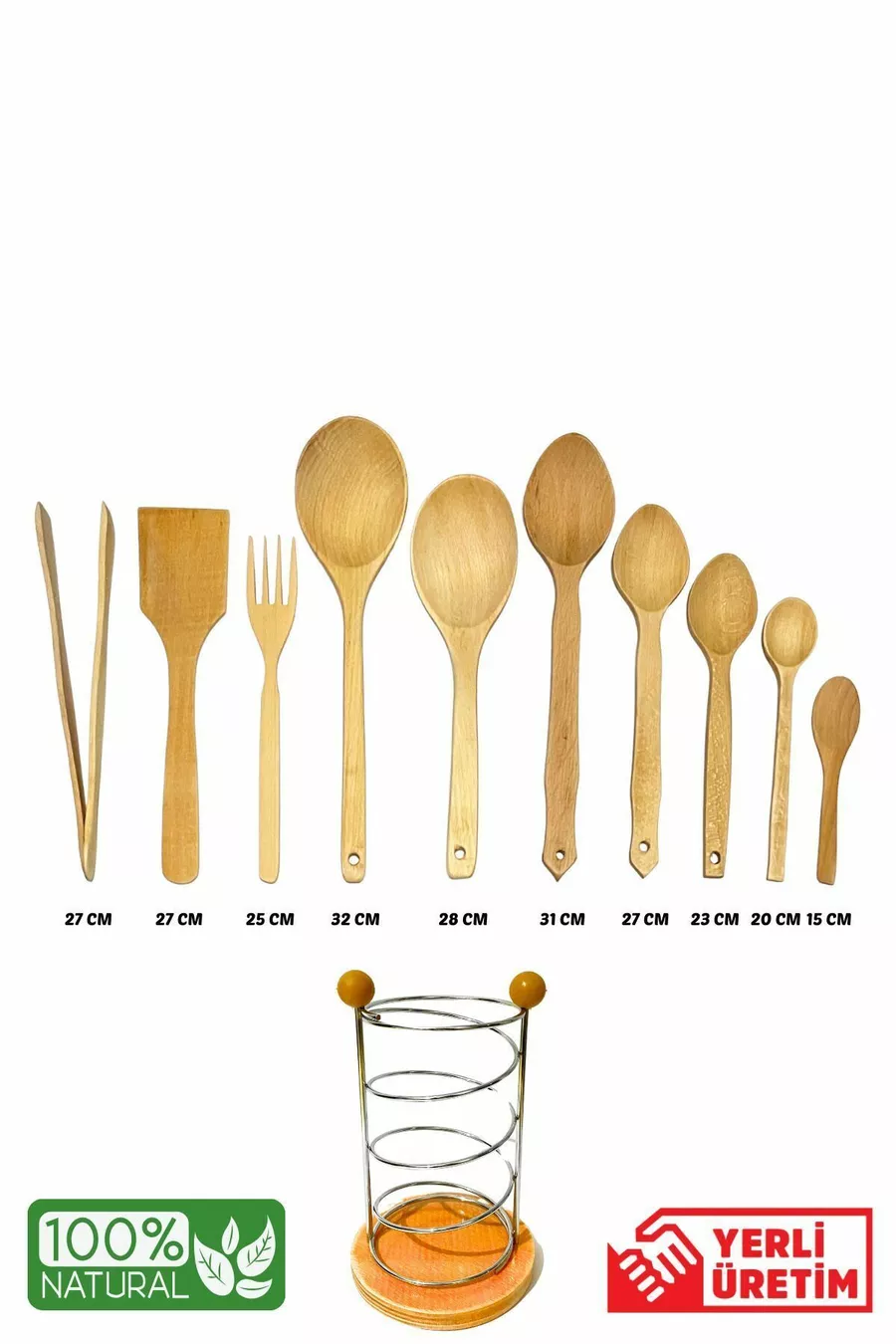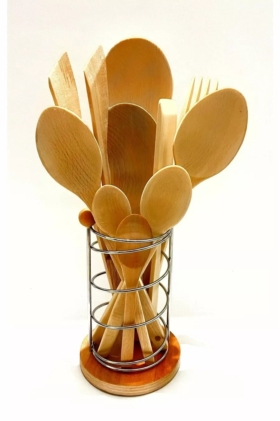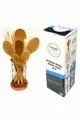 Комплект от части с маслинов дървен брезов лъжица, дървена шпатула, сервизна черпак, дървено вилица и щипка с метална стойка