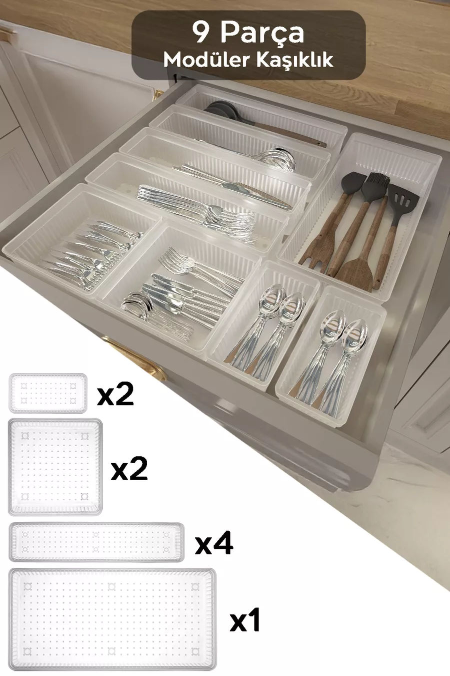 Комплект от 9 части модулна поставка за лъжици - регулируем органайзер за кухненски чекмедже, прозрачен