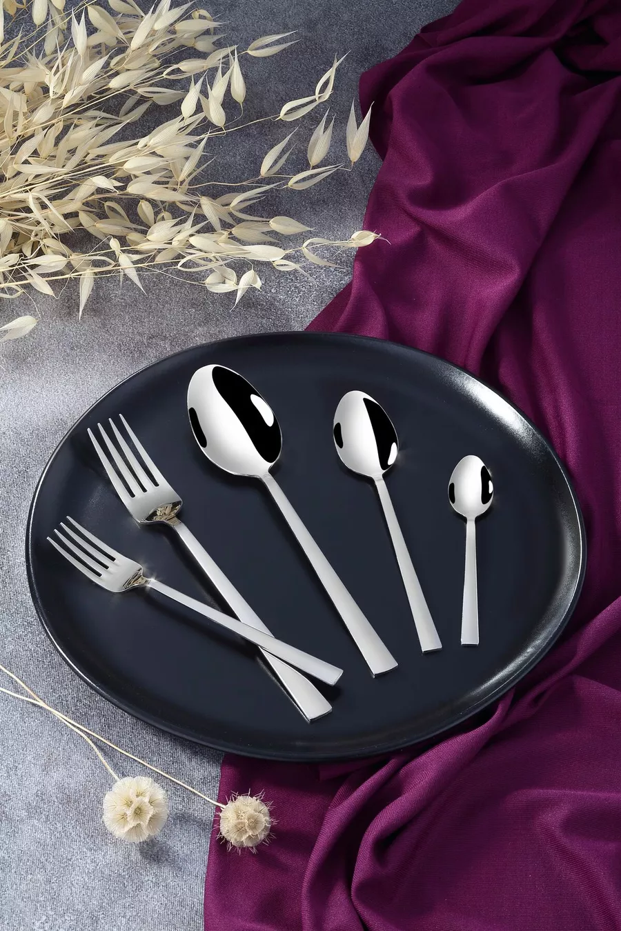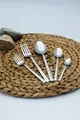 Материал: Стомана Брой части: 30 Цвят: Екрю За хора: 6 души Тип продукт: Комплект вилици и лъжици Произход: TR Гаранционен период: Без гаранция Инструкции за поддръжка (контакт с храна): Подходящ за миене в съдомиялна машина.